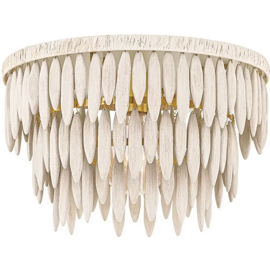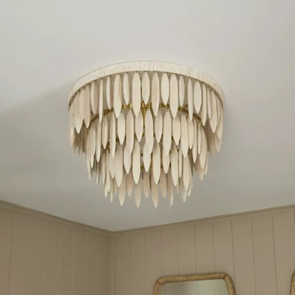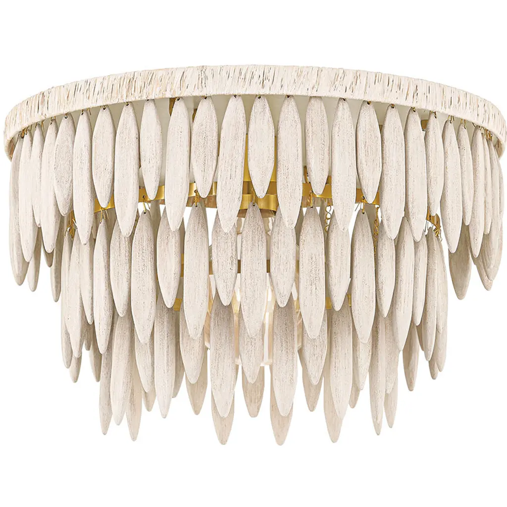 Organically elevate interiors with the Tiffany Semi-Flushmount from Mitzi. Tiers of elongated wood beads in coastal textured wash encircle gleaming metal rings for a sculptural statement. Natural raffia tops the light, providing an earthy finish. Hung alone or in a matching set, it sculpts ceilings with breezy brilliance, blending polished metals with subtle organic textures. Lends natural elegance to coastal, farmhouse, or contemporary spaces with a welcome natural presence.