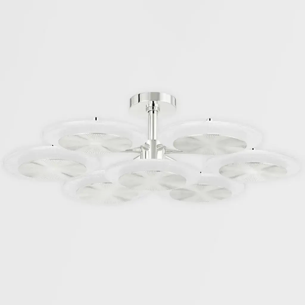 Illuminate your living space with the elegant Topaz LED Semi-Flushmount by Corbett Lighting. A collection of steel plates suspends in midair through attachment to a downrod secured by a canopy at your ceiling. These plates boast refined spindle-like patterning and are neatly encircled by glass shades. An integrated LED allows brilliant light to disperse throughout your surroundings with ease. The Topaz LED Chandelier is made available in multiple light quantities so that you can choose the light fixture that is right for you.
