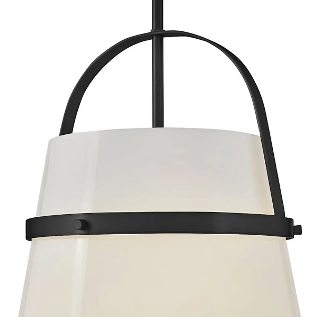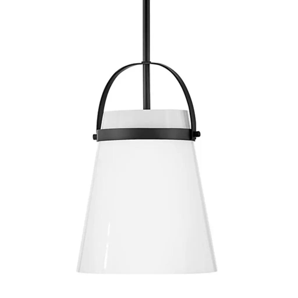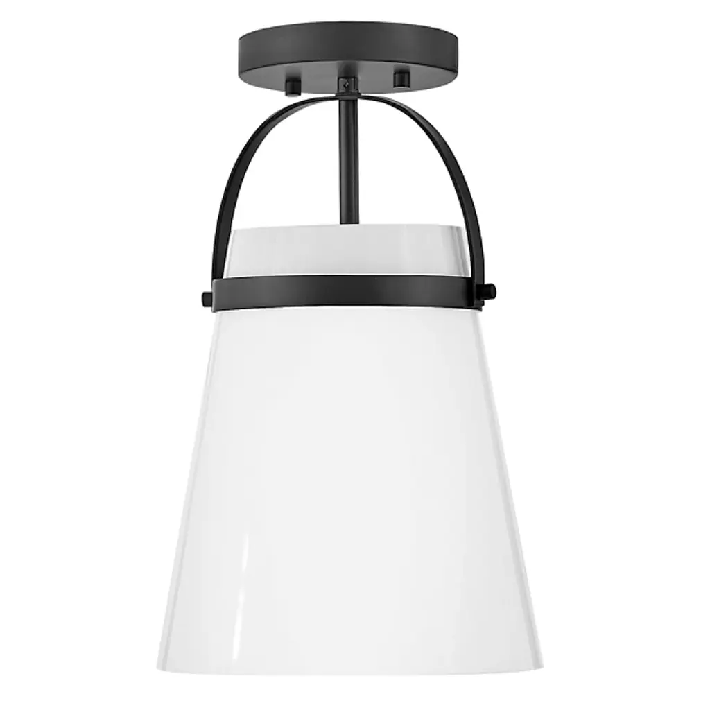 Take a strong line in home décor with the smooth, stylish design of the Tori Pendant / Semi-Flushmount from Lark. This fabulous transitional design is flexible enough to be mounted close to its low-profile canopy or deployed at the base of a slender stem. Each implementation uses a U-shaped brace and horizontal ring to retain a flaring shade of opal glass around the fixture’s single lamp. The smooth, translucent texture contrasts well with the metal structure around it, mellowing bright glare to a warm glow around the distributed splash of direct downlight that emerges from the shade’s open base.