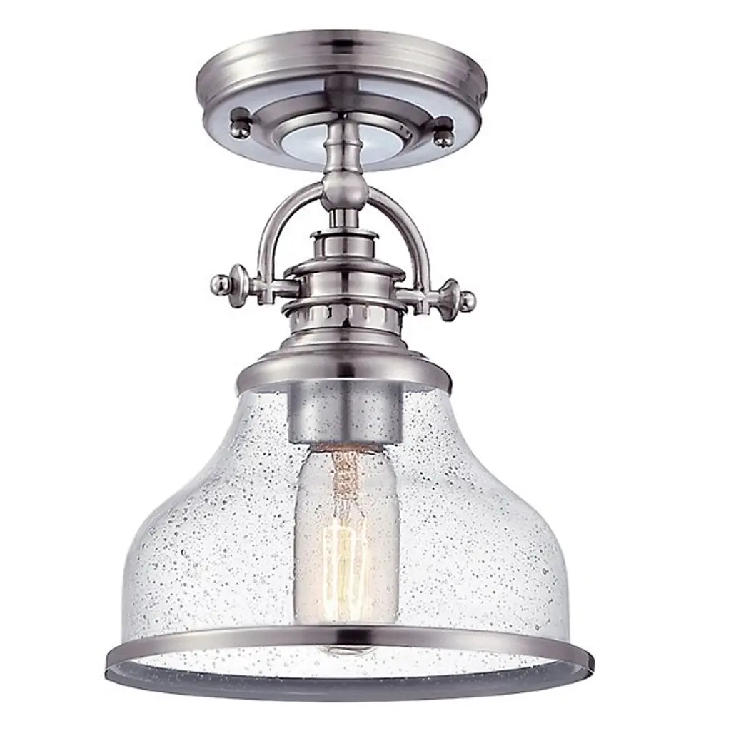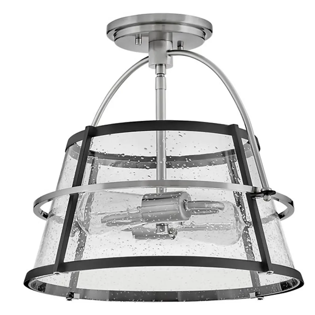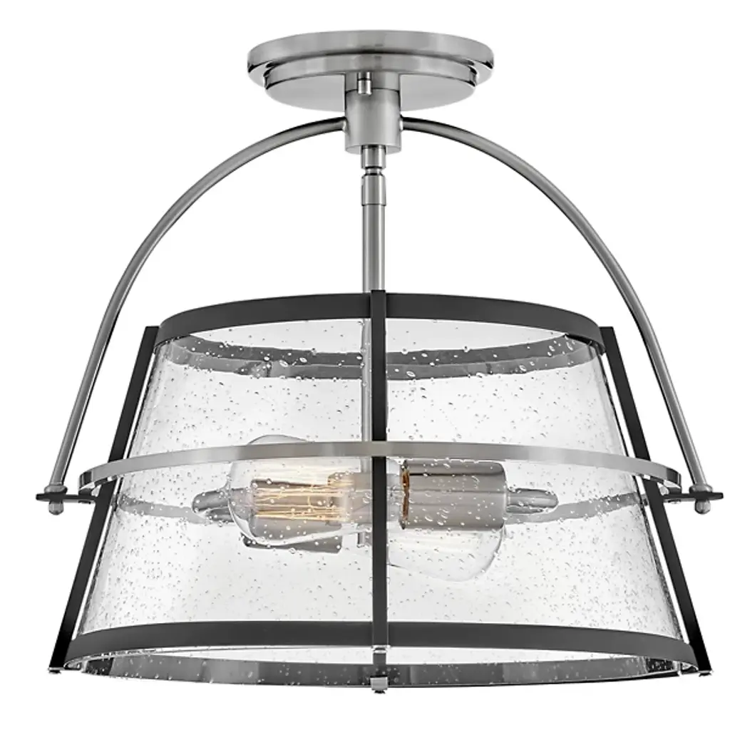 The Tournon Semi-Flushmount from Hinkley Lighting presents layered intricacy with a timely, tasteful appeal. The fixture descends from a stepped disc canopy and secures a slender central downrod that holds horizontal, open candelabra lamping. A flared shade of clear seedy glass extends around the lamping, ringed by horizontal accents of smooth steel. The shade moderates glare to the sides, splashing out a focused downlight accompanied by a warm wash of light to the sides.
