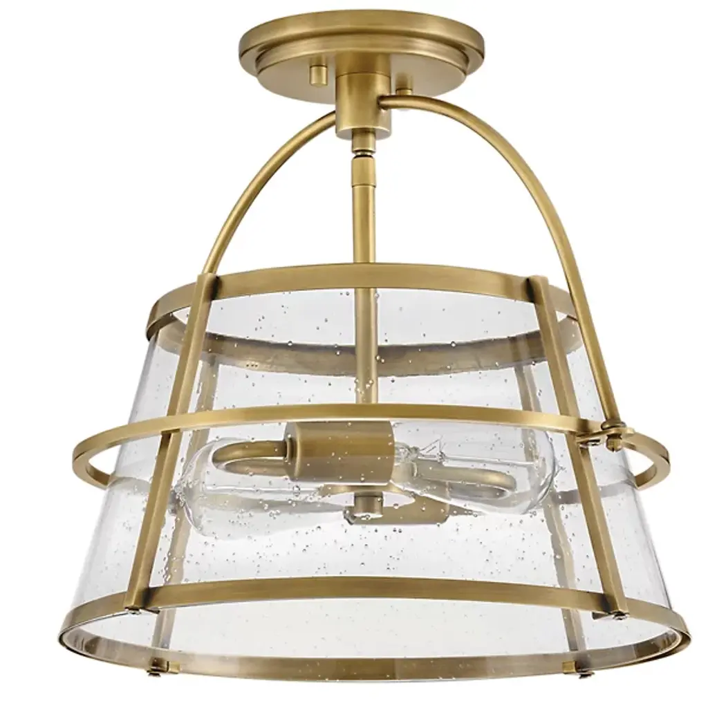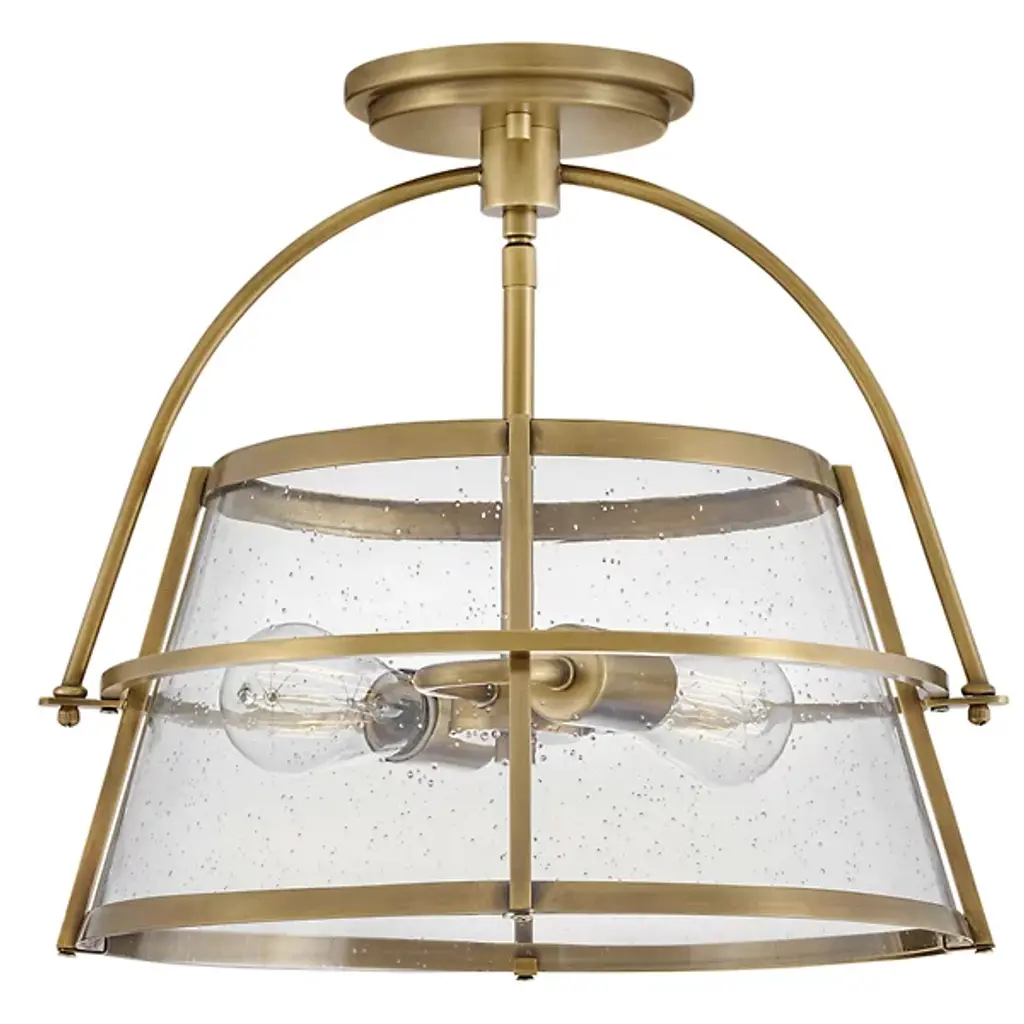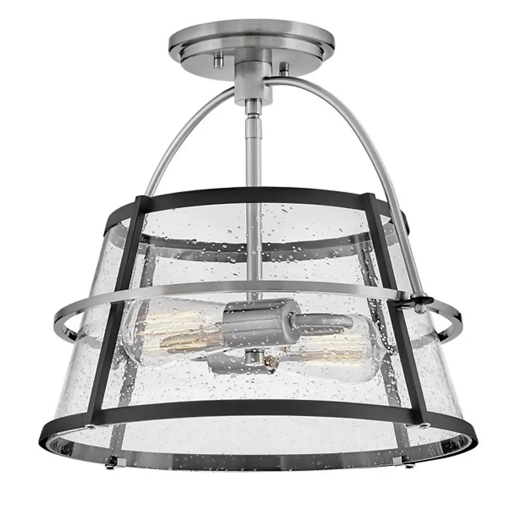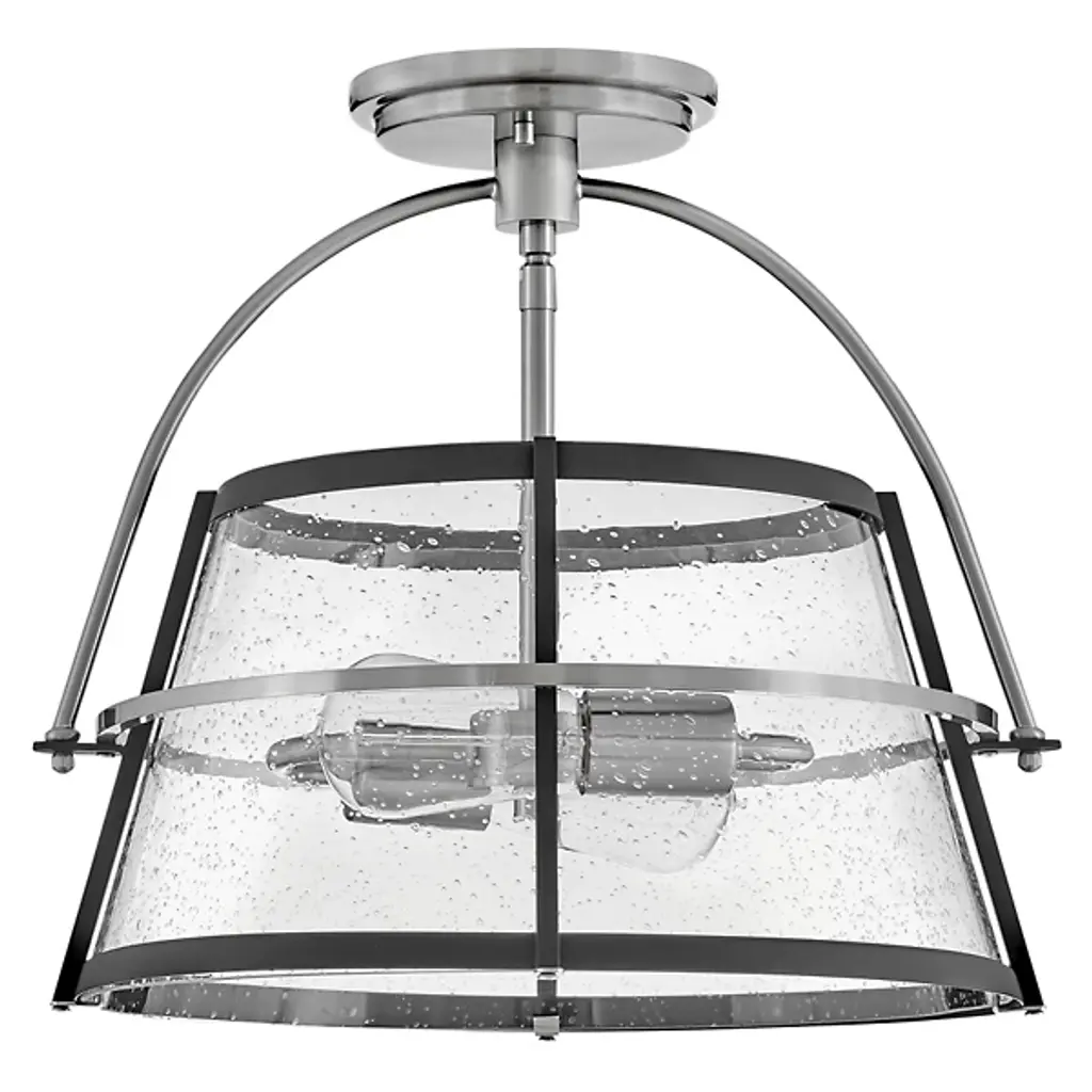 The Tournon Semi-Flushmount from Hinkley Lighting presents layered intricacy with a timely, tasteful appeal. The fixture descends from a stepped disc canopy and secures a slender central downrod that holds horizontal, open candelabra lamping. A flared shade of clear seedy glass extends around the lamping, ringed by horizontal accents of smooth steel. The shade moderates glare to the sides, splashing out a focused downlight accompanied by a warm wash of light to the sides.