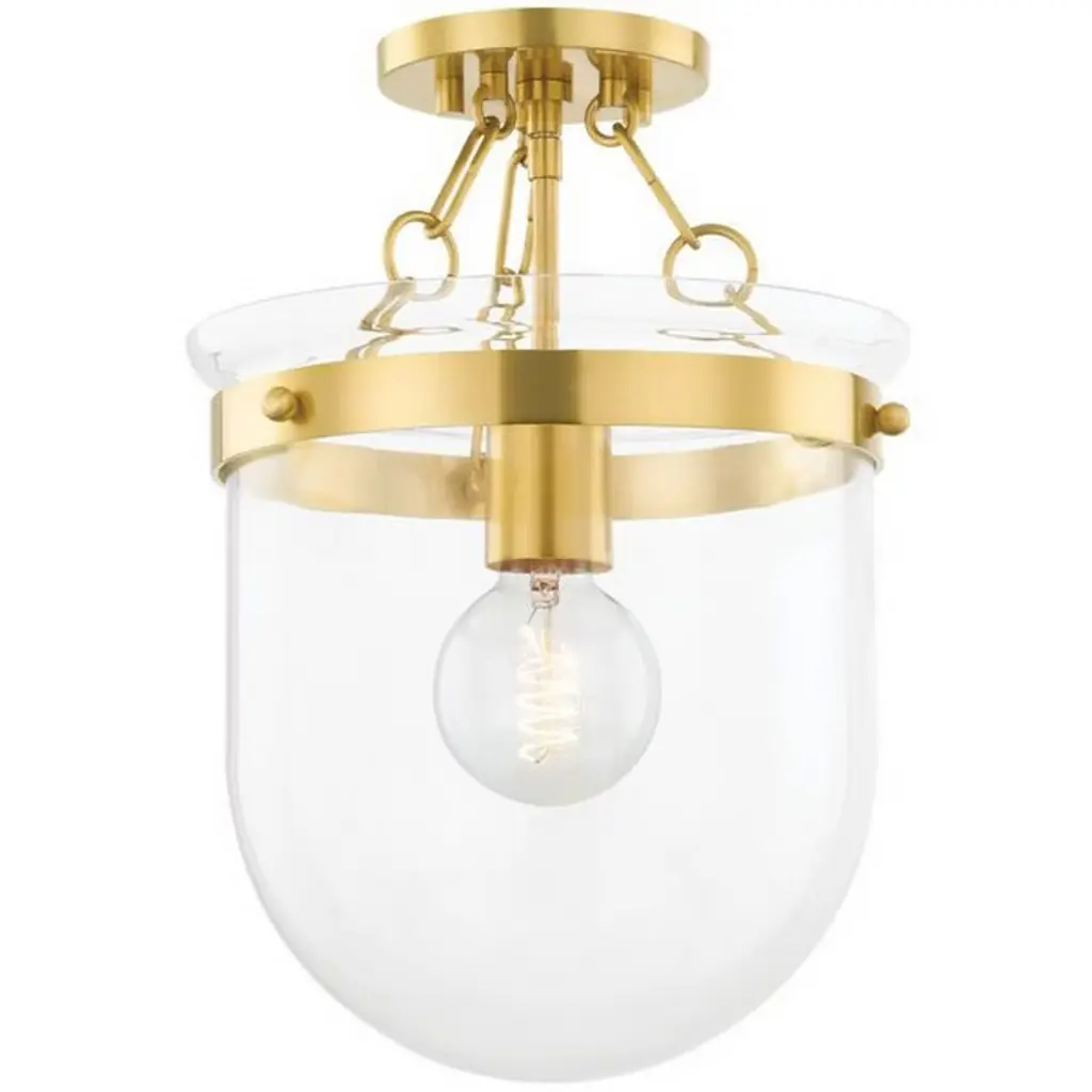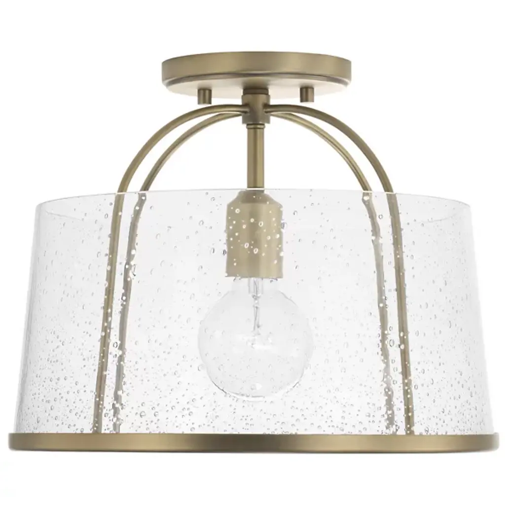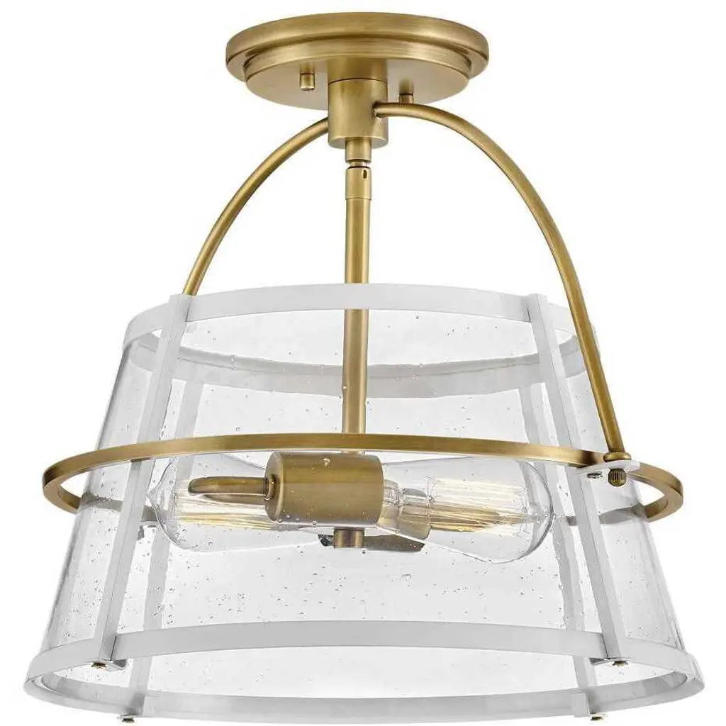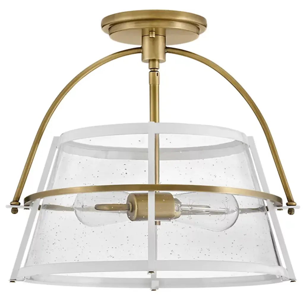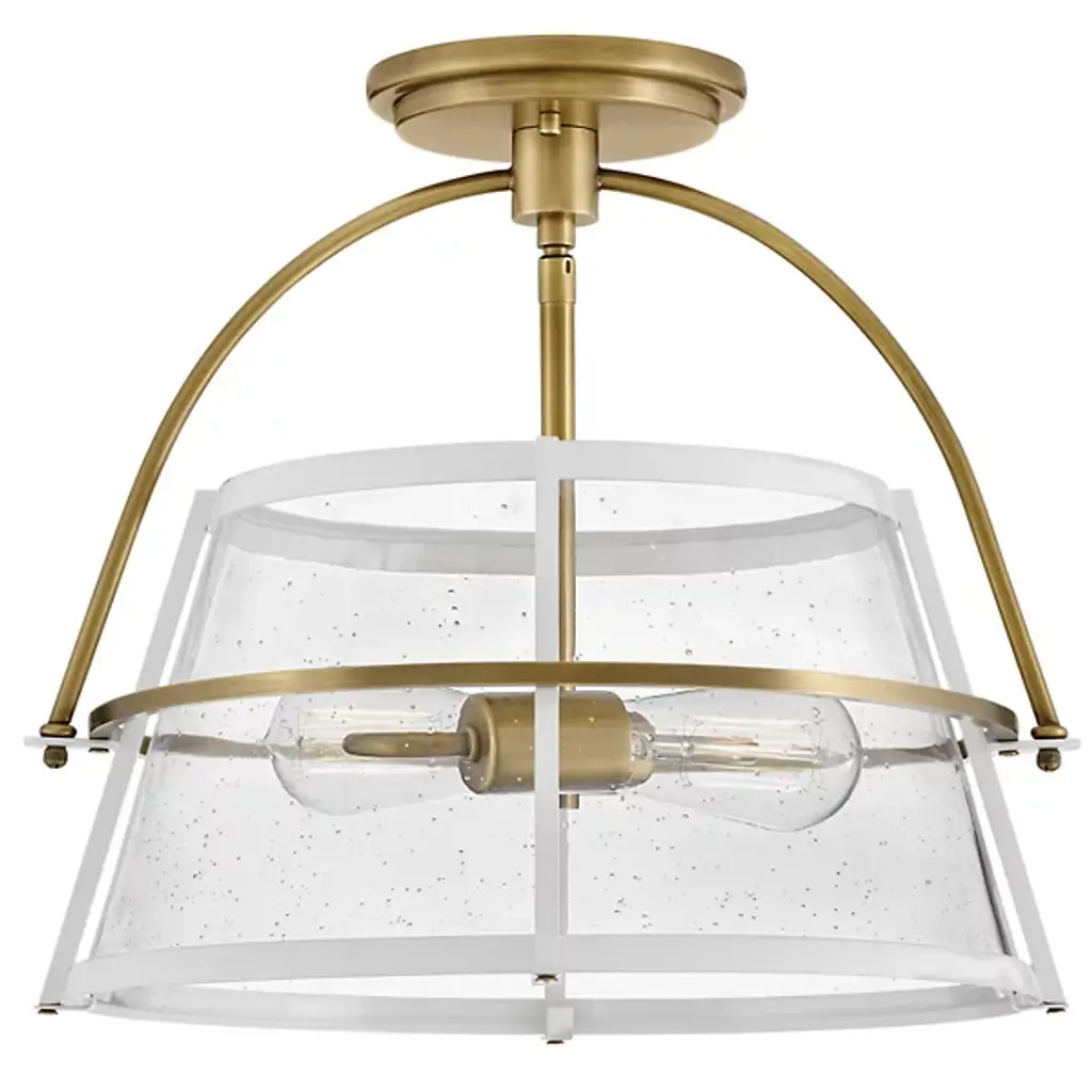 The Tournon Semi-Flushmount from Hinkley Lighting presents layered intricacy with a timely, tasteful appeal. The fixture descends from a stepped disc canopy and secures a slender central downrod that holds horizontal, open candelabra lamping. A flared shade of clear seedy glass extends around the lamping, ringed by horizontal accents of smooth steel. The shade moderates glare to the sides, splashing out a focused downlight accompanied by a warm wash of light to the sides.