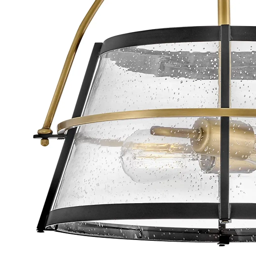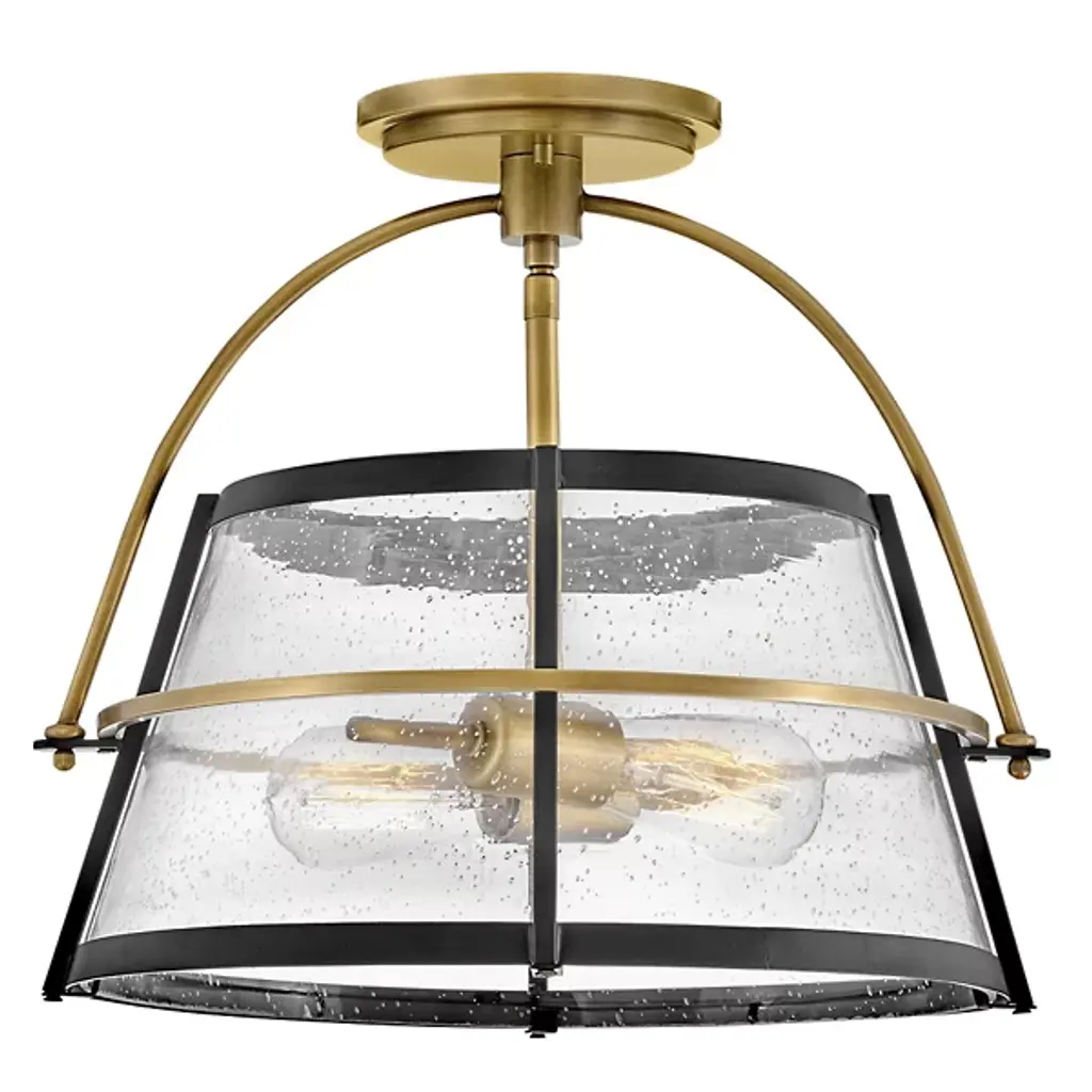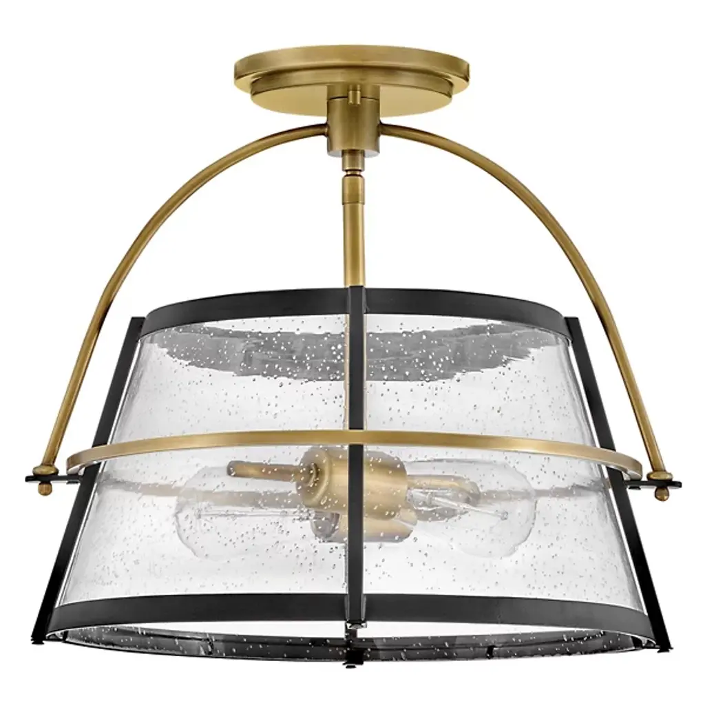The Tournon Semi-Flushmount from Hinkley Lighting presents layered intricacy with a timely, tasteful appeal. The fixture descends from a stepped disc canopy and secures a slender central downrod that holds horizontal, open candelabra lamping. A flared shade of clear seedy glass extends around the lamping, ringed by horizontal accents of smooth steel. The shade moderates glare to the sides, splashing out a focused downlight accompanied by a warm wash of light to the sides.