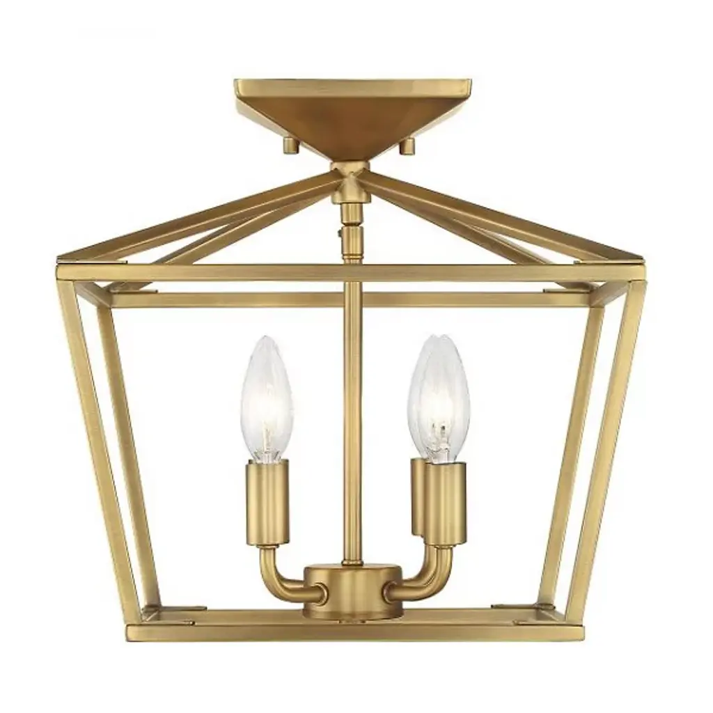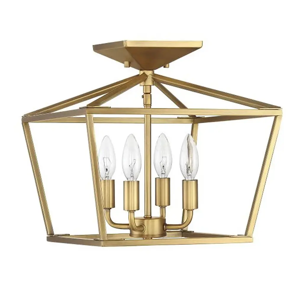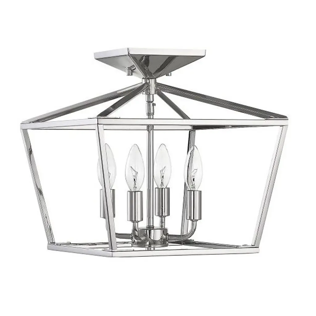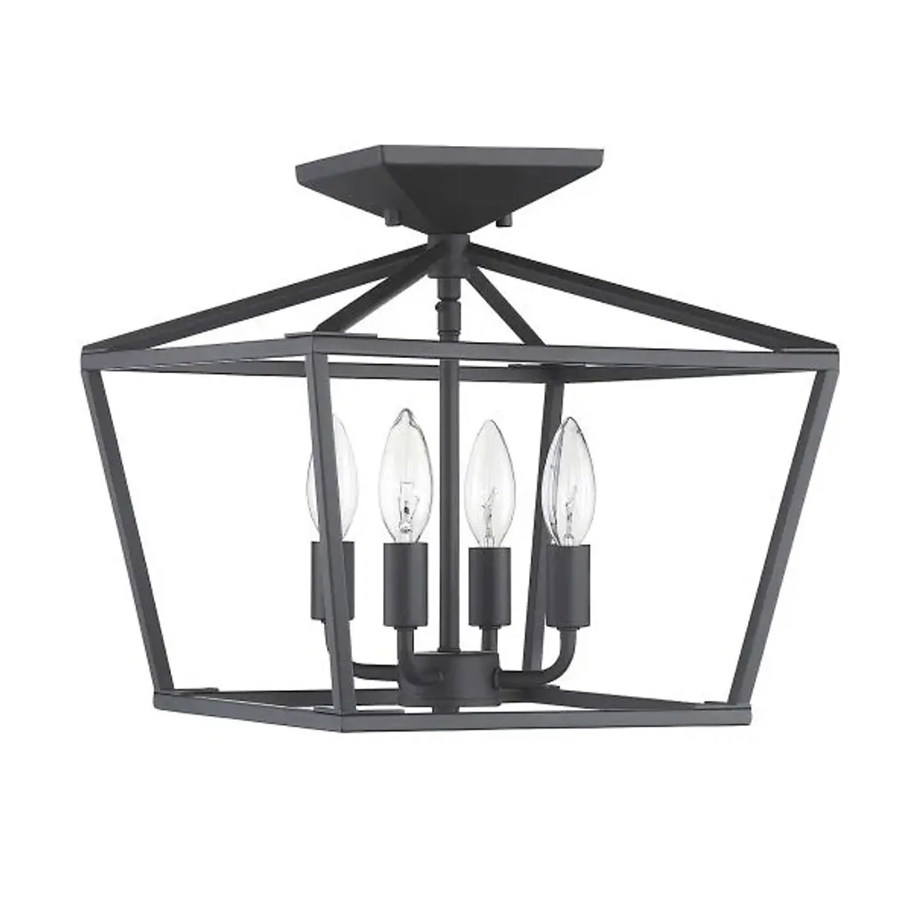 Modern elements recreate a traditional aesthetic with the Townsend Semi-Flushmount by Savoy House. With a clean-lined and geometric take on the classic lantern silhouette, this metal fixture is secured to the ceiling by an angular, tapered canopy. A series of bars create an open, four-sided cage to frame the candelabra that sits at its center. Curved arms present the candleholders, and when classic candelabra bulbs are added, this fixture emits a warm, ambient glow and fresh decorative accent for any space.