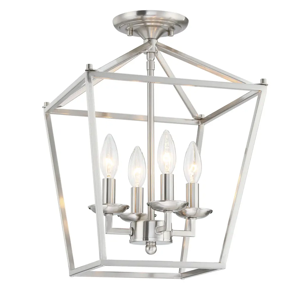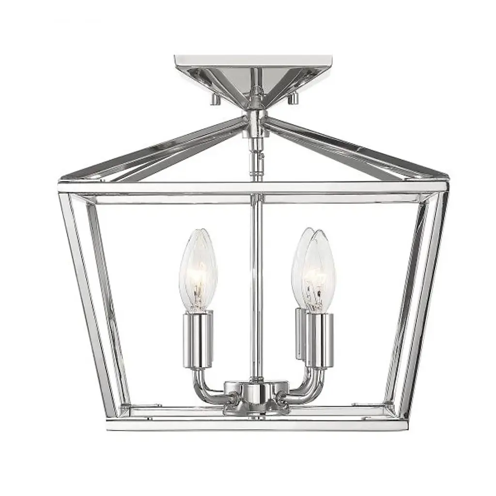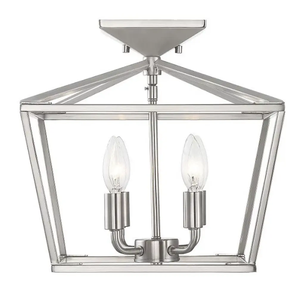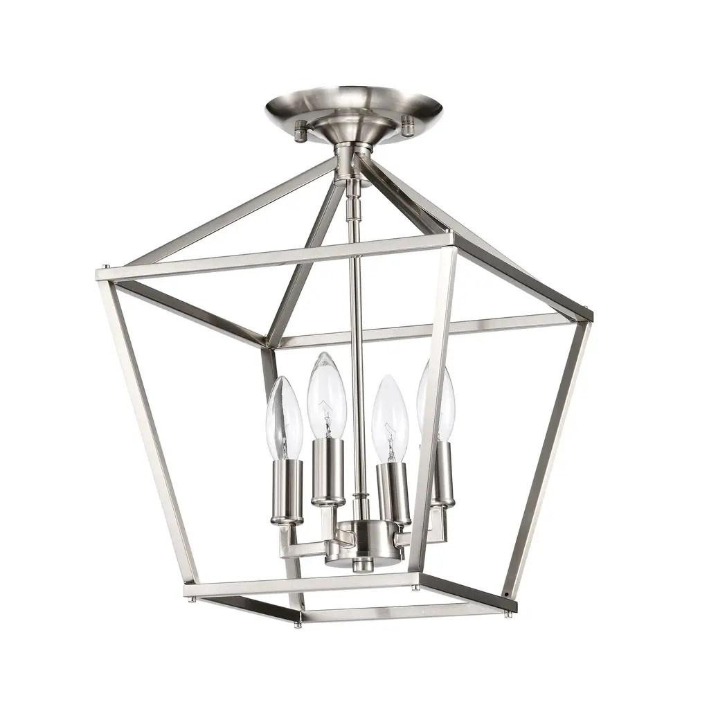 Modern elements recreate a traditional aesthetic with the Townsend Semi-Flushmount by Savoy House. With a clean-lined and geometric take on the classic lantern silhouette, this metal fixture is secured to the ceiling by an angular, tapered canopy. A series of bars create an open, four-sided cage to frame the candelabra that sits at its center. Curved arms present the candleholders, and when classic candelabra bulbs are added, this fixture emits a warm, ambient glow and fresh decorative accent for any space.