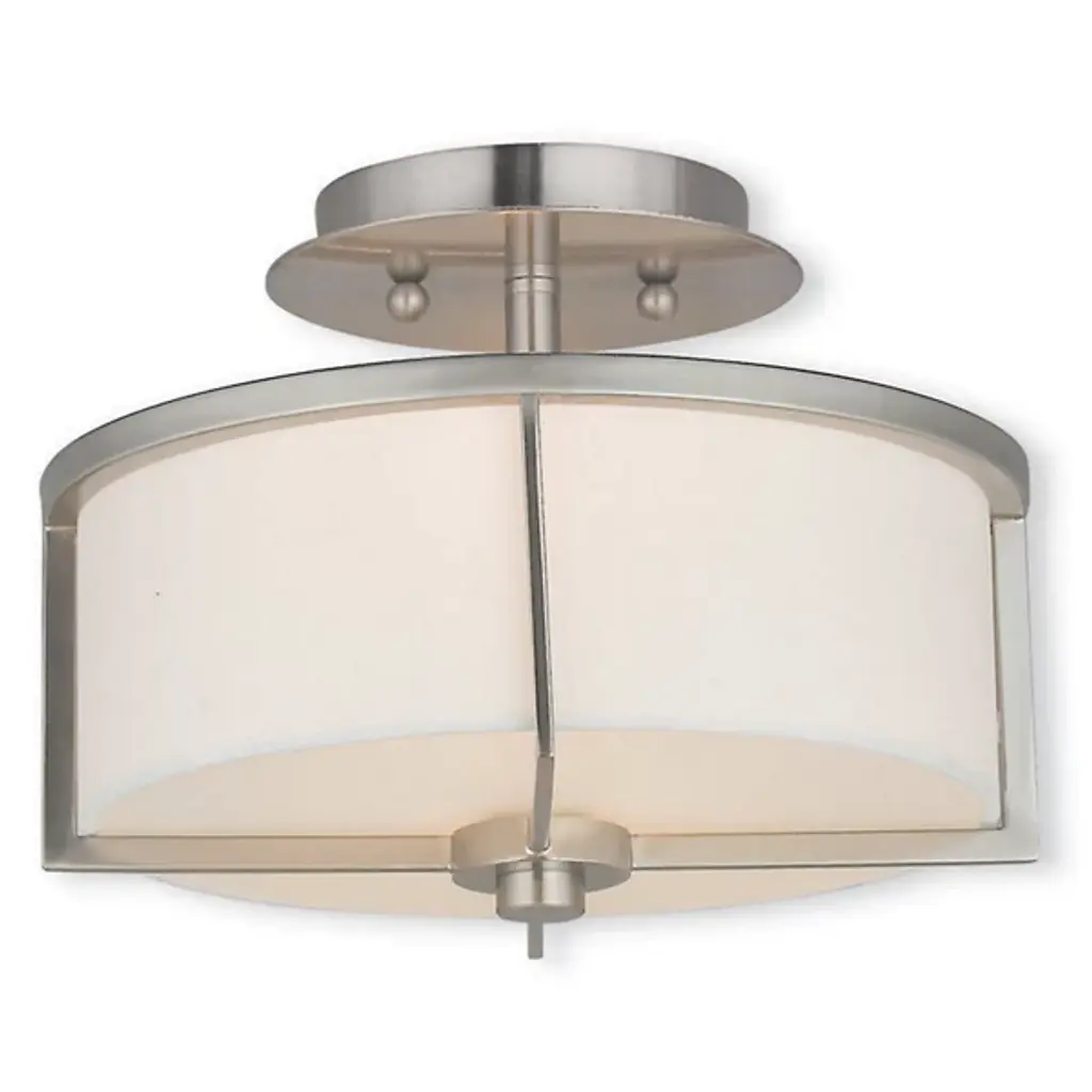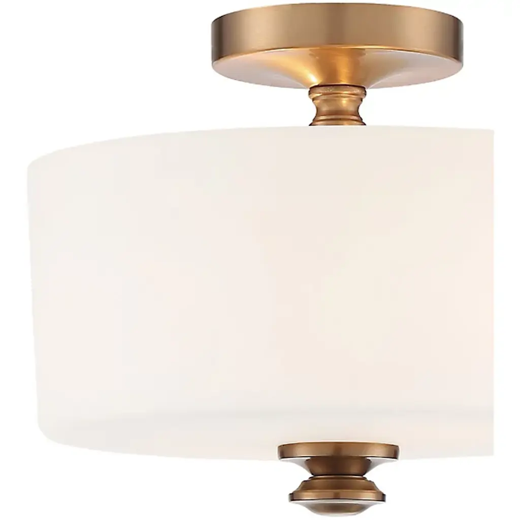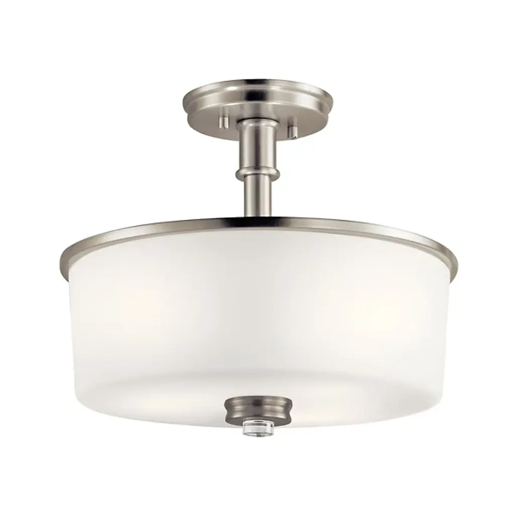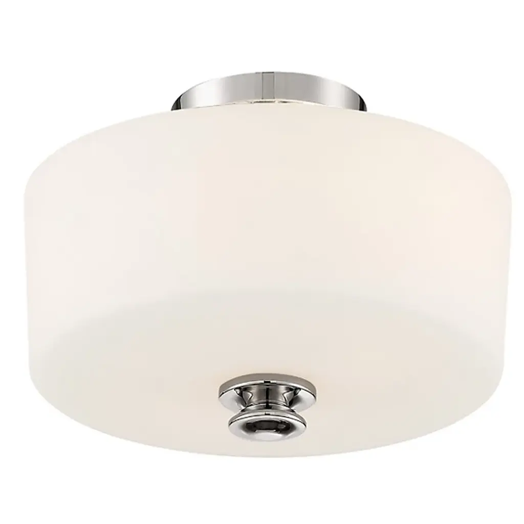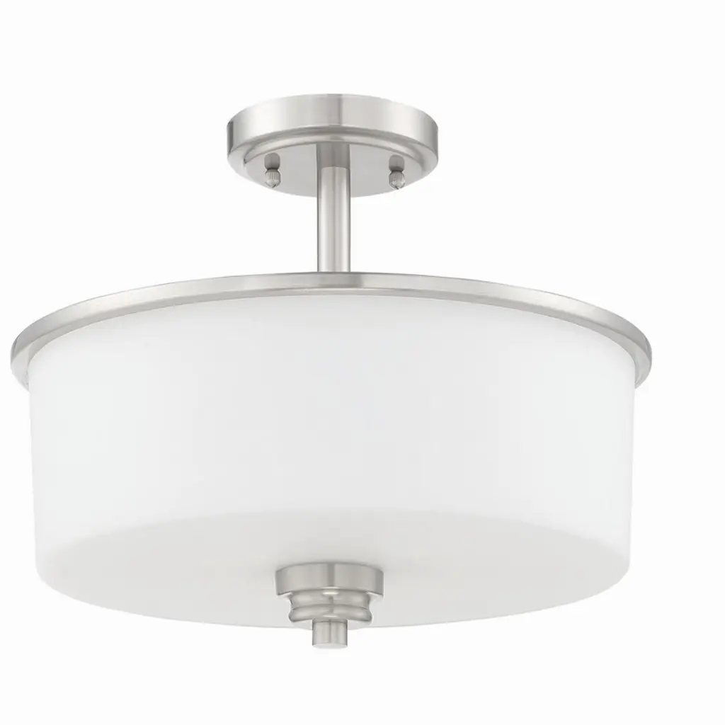 Soft, simple, refined. Pair your rooms with the elegant transitional personality of the Travis Semi-Flushmount from Crystorama. It mounts to your ceiling with a solid steel canopy. The finish of the canopy carries to the finial at the base to deliver a stylish contrast to the shade. The shapes from top to bottom feature a rounded edge that’s pleasing on the eyes. Covering the bulbs inside, a deep-dish glass shade makes sure light reaching you is diffused with a glare-free quality. The piece turns on to produce a wide-spreading glow fitting for intimate or spacious rooms.
