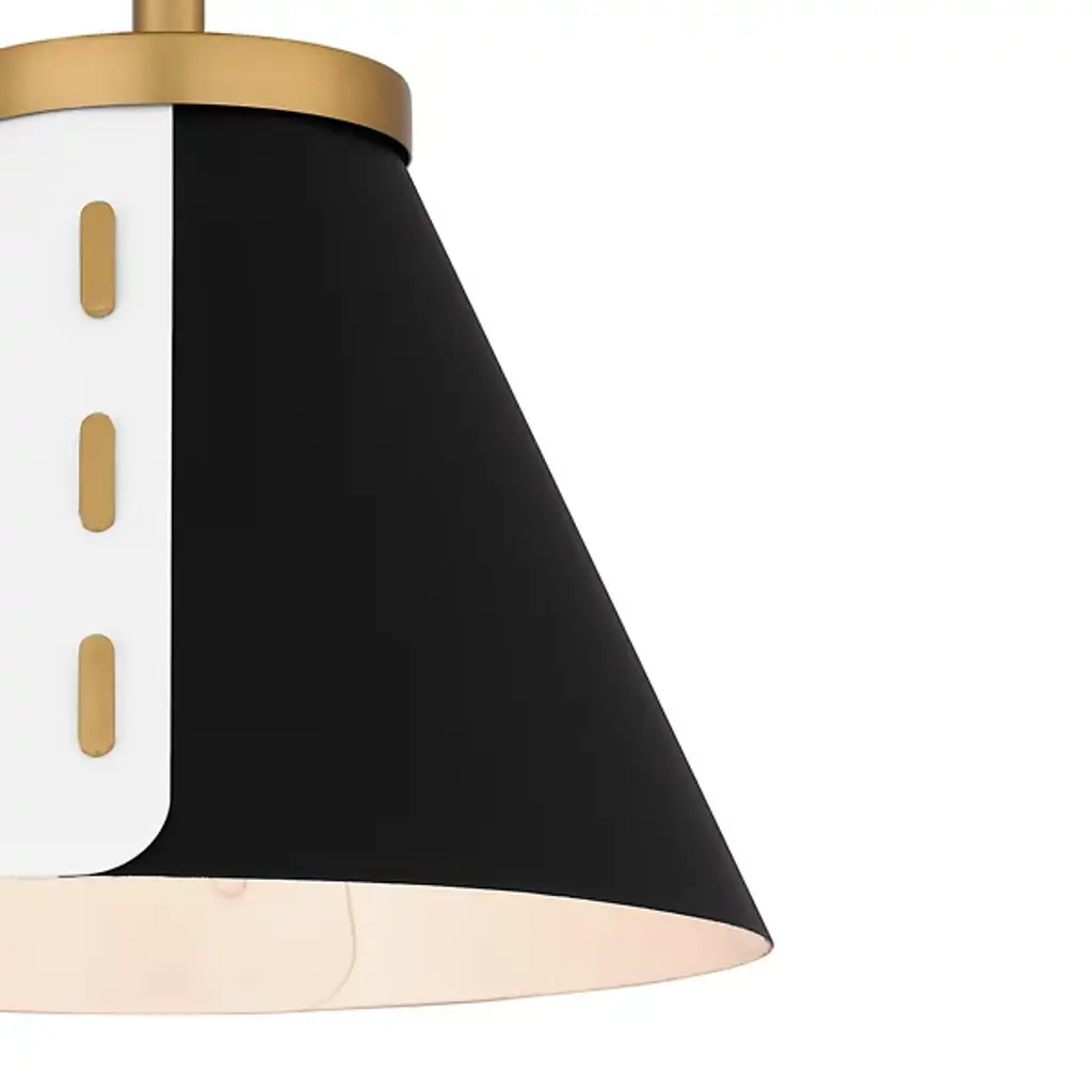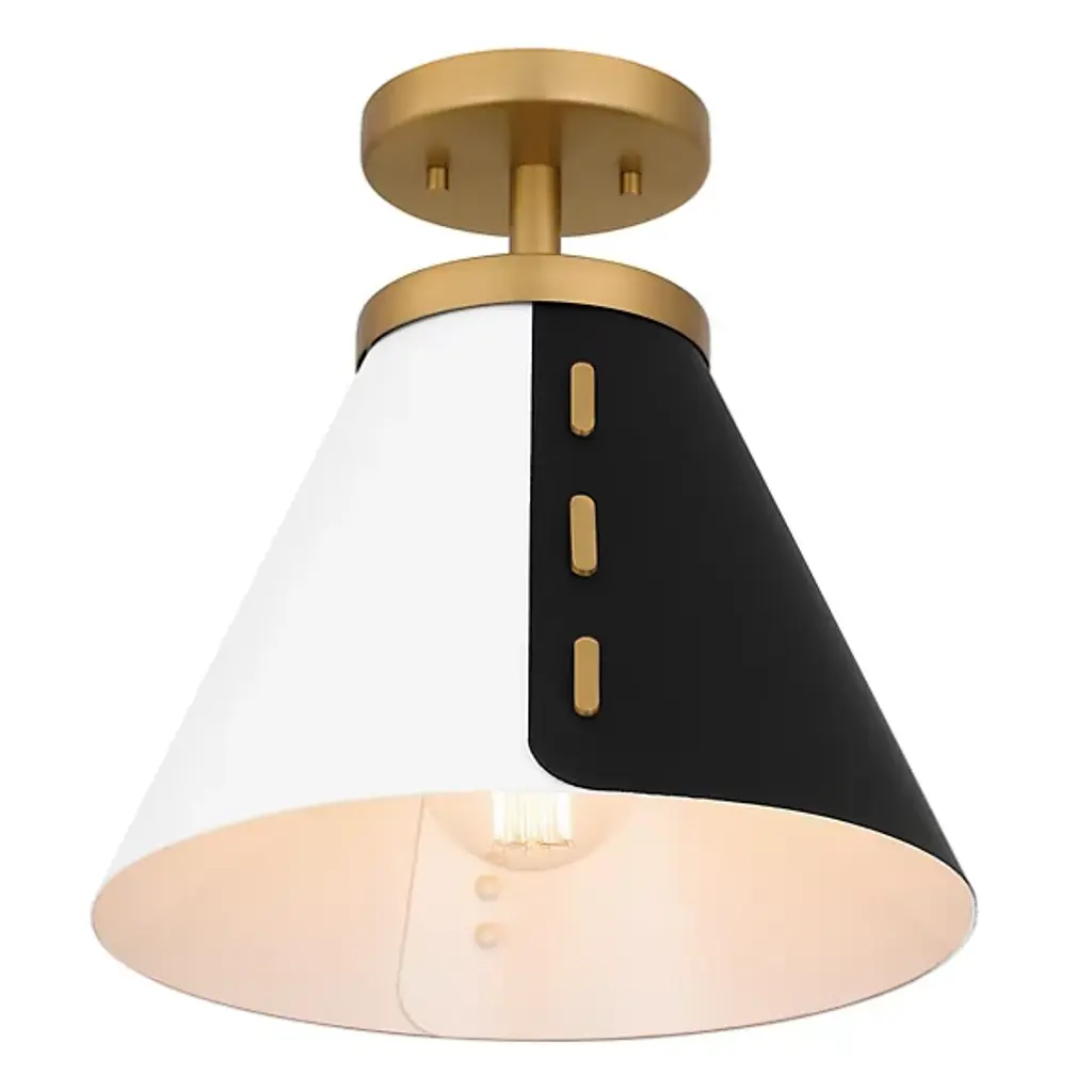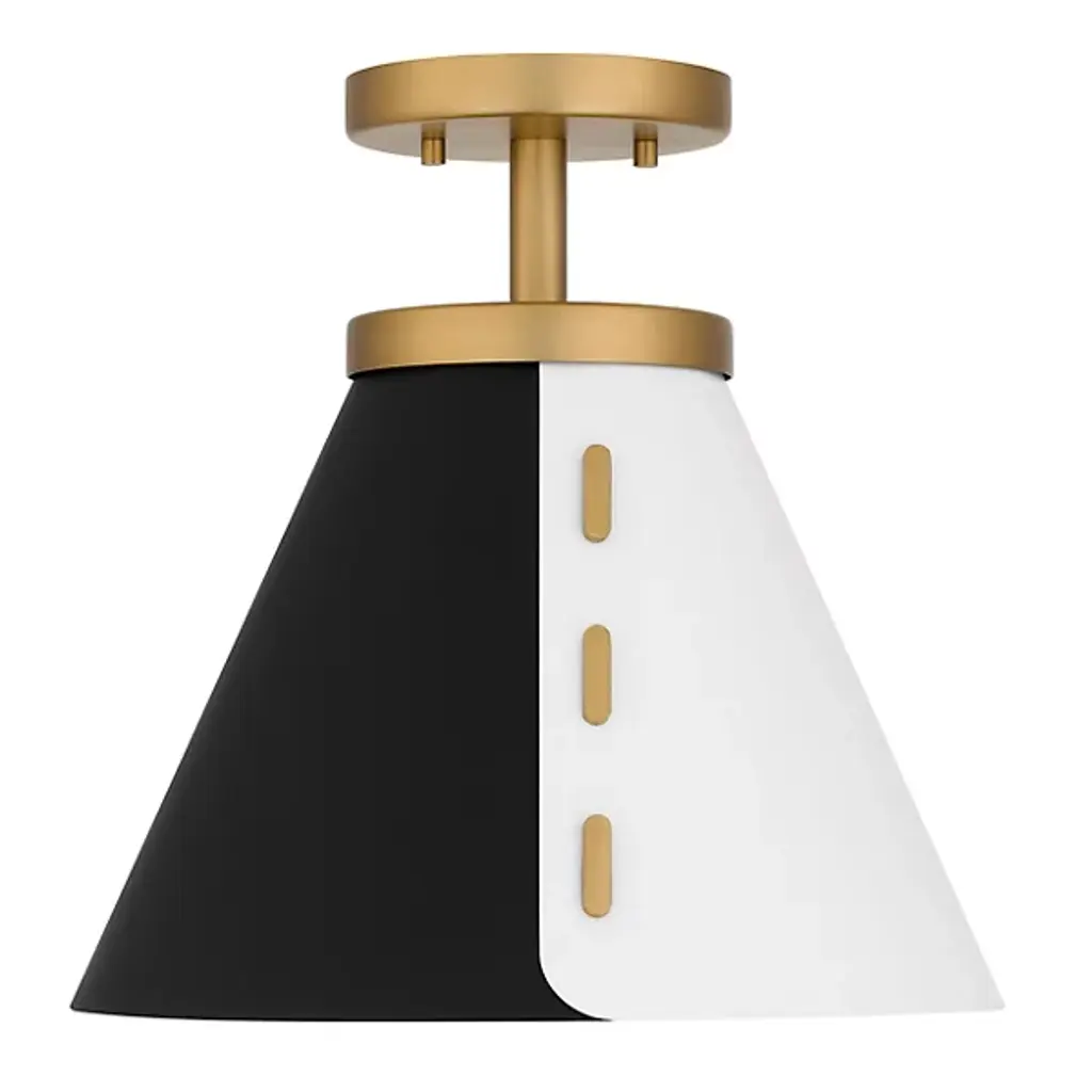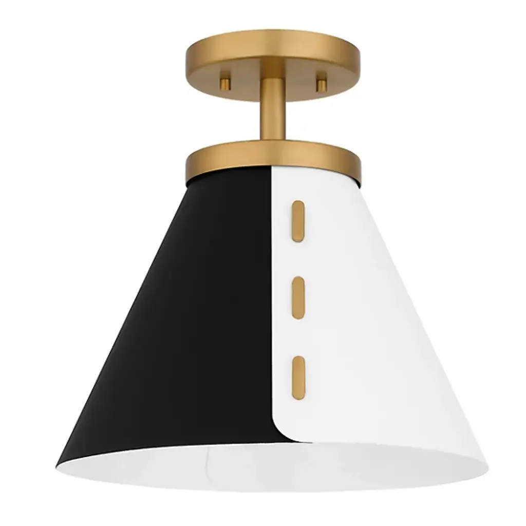 Incorporating a playful color block design, the Trette Semi-Flushmount/Pendant from Quoizel blends into modern and contemporary settings. Its striking black and white metal shade is accentuated by a brushed, weathered brass finish, infusing a hint of sophistication into its sleek silhouette. Whether installed individually or grouped, this fixture makes a bold statement over kitchen islands or bar areas, elevating the ambiance with its unique charm. Crafted from durable steel and featuring a metal shade material with contrasting areas, it features damp-listed lamping, able to go anywhere in indoor spaces, bringing timeless elegance with a modern twist.