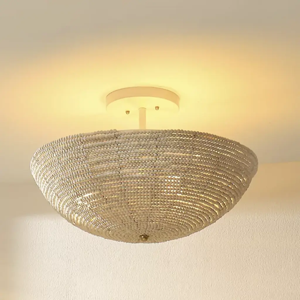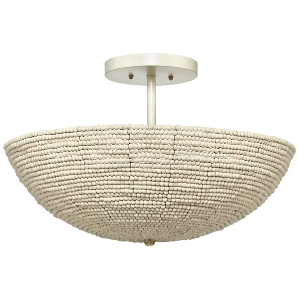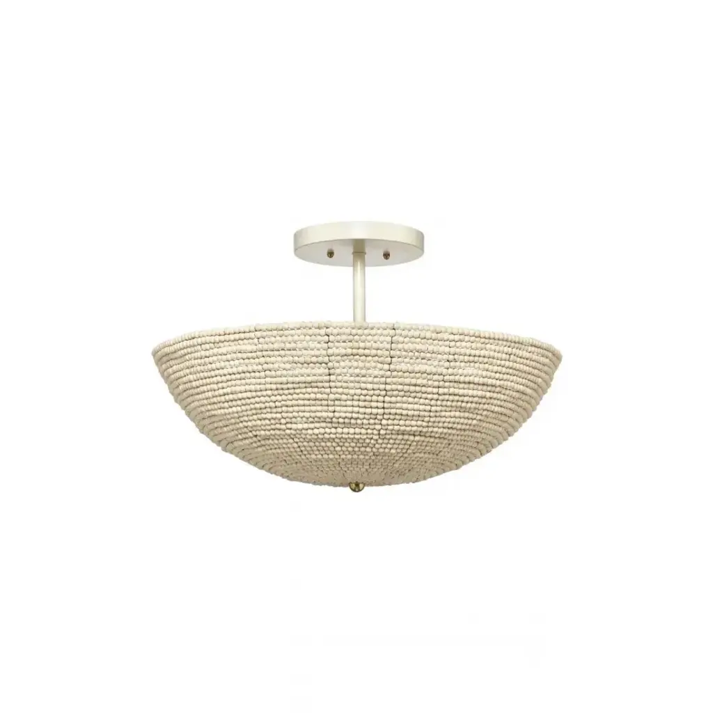Inspired by the organic beauty of driftwood chunks and the smooth allure of beach glass beads, the Tsunami Semi-Flushmount from Jamie Young Co. embodies coastal charm. Crafted with meticulous care, hundreds of small mango wood beads envelop the sturdy iron frame, creating a cool and casual aesthetic. The natural variation in the wood adds depth and texture, while the overall design exudes a relaxed coastal vibe, making it a perfect addition to any seaside-inspired decor scheme.