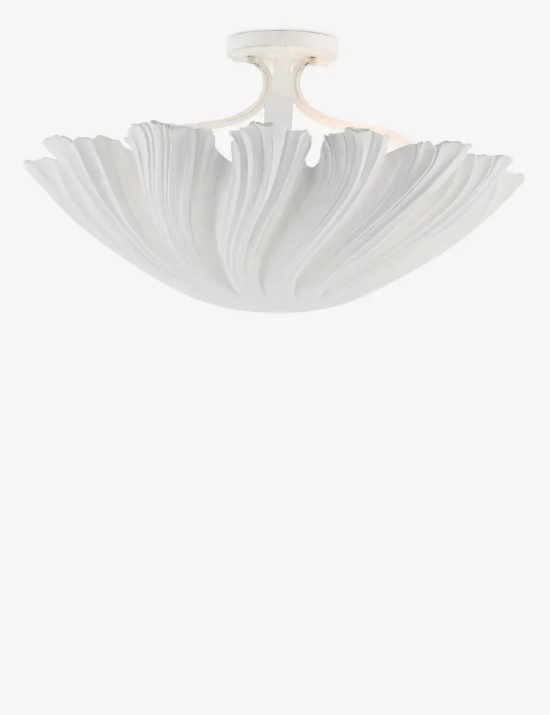 The Tulia light brings sculptural elegance with a compact profile overhead. The shape of the wrought iron shade pitches out with an effortless drapea white gesso finish highlighting its delicate form. This semi-flush mount fixture is perfect for washing a low ceiling in ambient light.