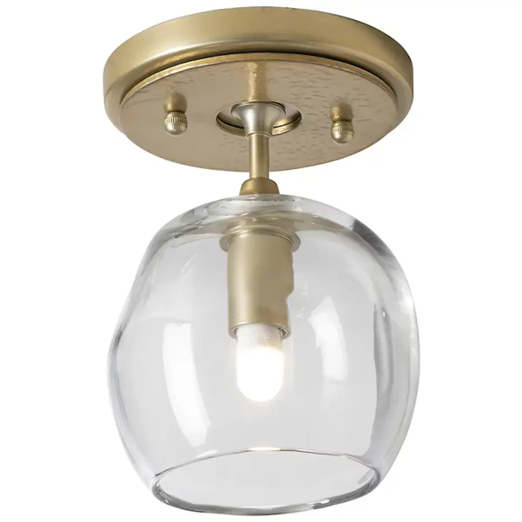 The Ume 1-Light Semi-Flushmount by Hubbardton Forge is designed and inspired by in the intracte beauty of nature. This semi-flushmount fixture appears purely organic in composition, a single glass globe sits as a puff of frosted glass on the end of a short post attached to a rounded ceiling mount. The Ume design also includes glass variations that resemble a thumbprint shape. Mount this semi-flushmount light fixture from bathroom to bedroom for a simple, artistic touch to your home’s interior design.