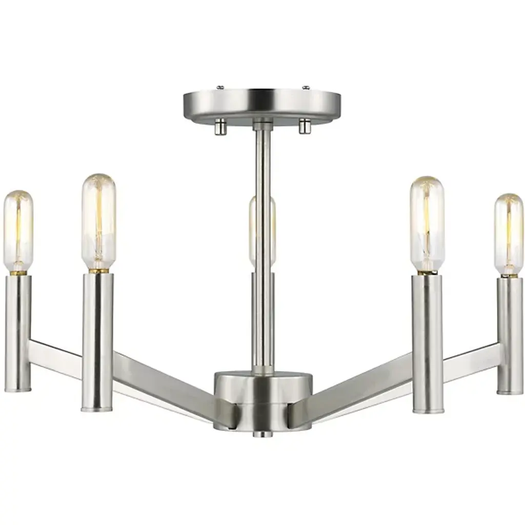 Bring a clean, unfiltered glow to the spaces of your modern home with the Vector Semi-Flushmount from Visual Comfort Studio, formerly known as Sea Gull Lighting, The silhouette is formed from smooth metal throughout, creating an appealing presence for a range of décor preferences. A simple ceiling mount lowers a downrod to a disc-shaped center. A set of four arms extend from the center, leading to candelabra-style bulbs. Each bulb brings a bright and flowing layer of light into the space.