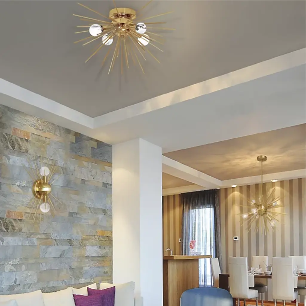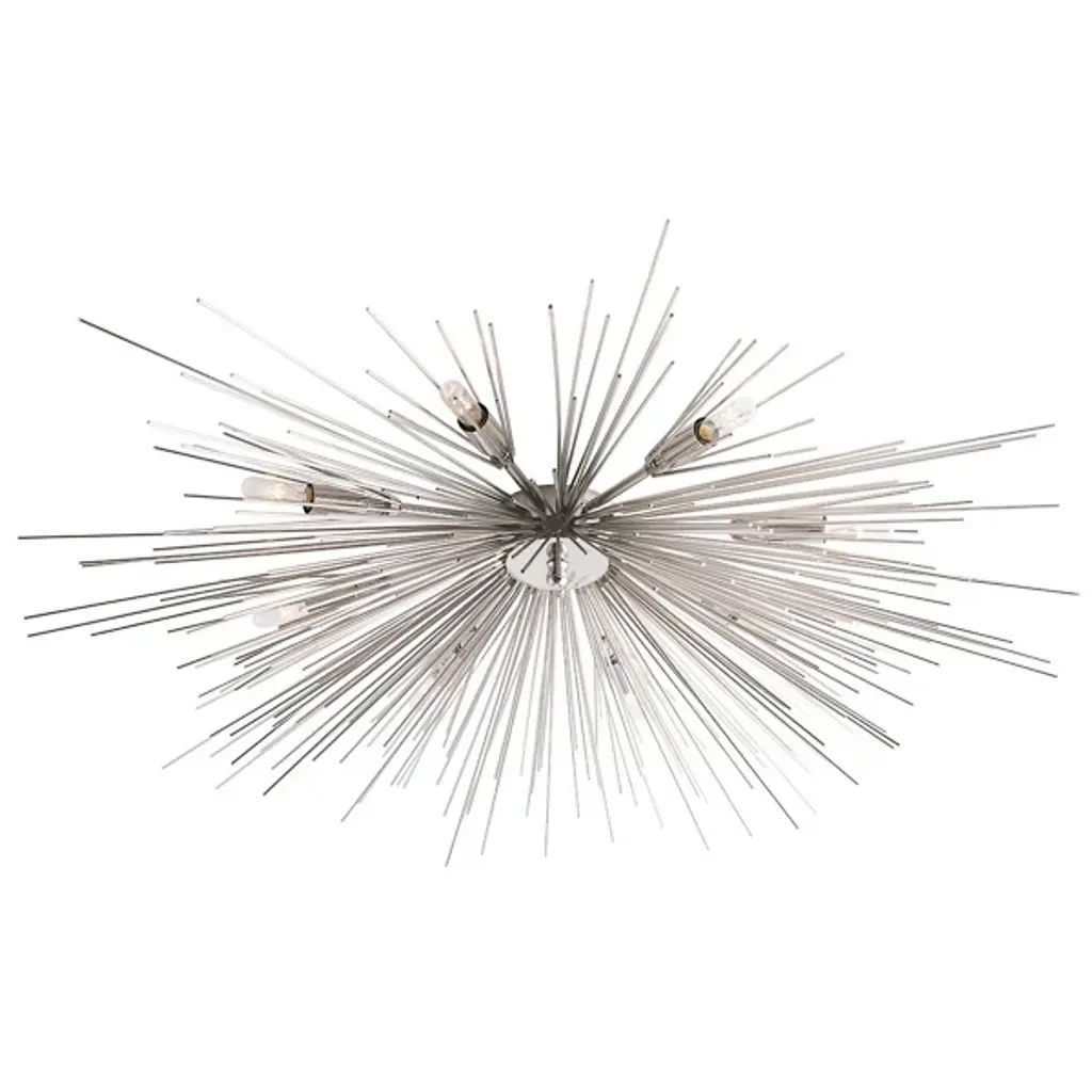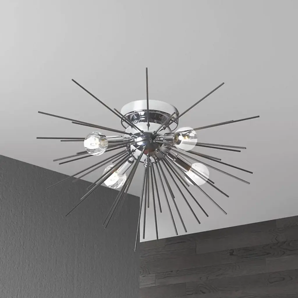 The Vega Semi-Flushmount from Dainolite creates a striking statement as it fills a room with sparkling light. Its sleek canopy holds a dome-shaped base forming the center for its sputnik-style design. Thin spears spread from every angle, extending sharply to form a lively silhouette. Its incandescent lamping is held by cylindrical sockets set within the spears, emitting warm light enhanced by smooth metal that surrounds it. This vibrant fixture is the perfect addition to a retro-inspired space.