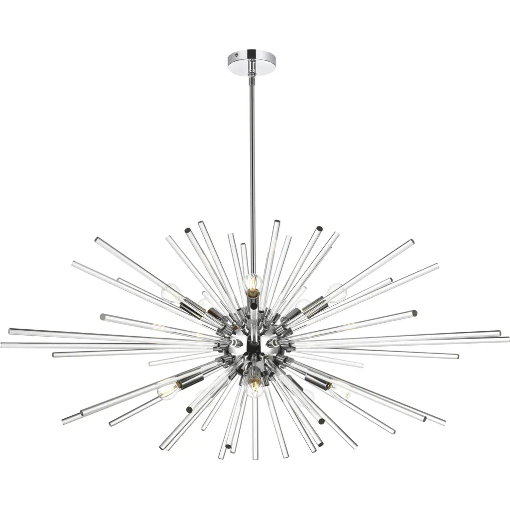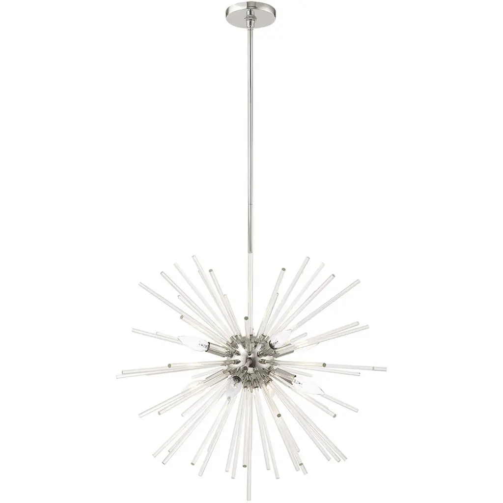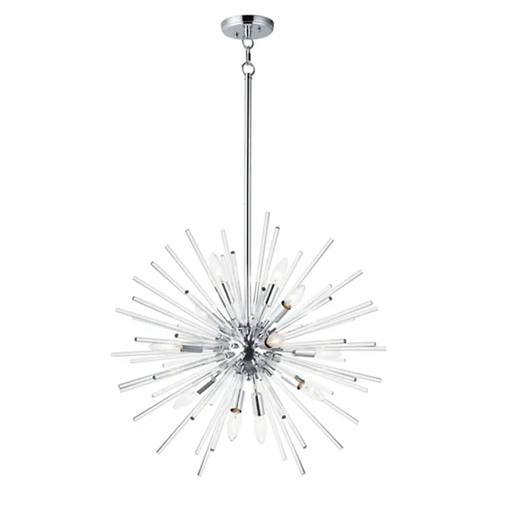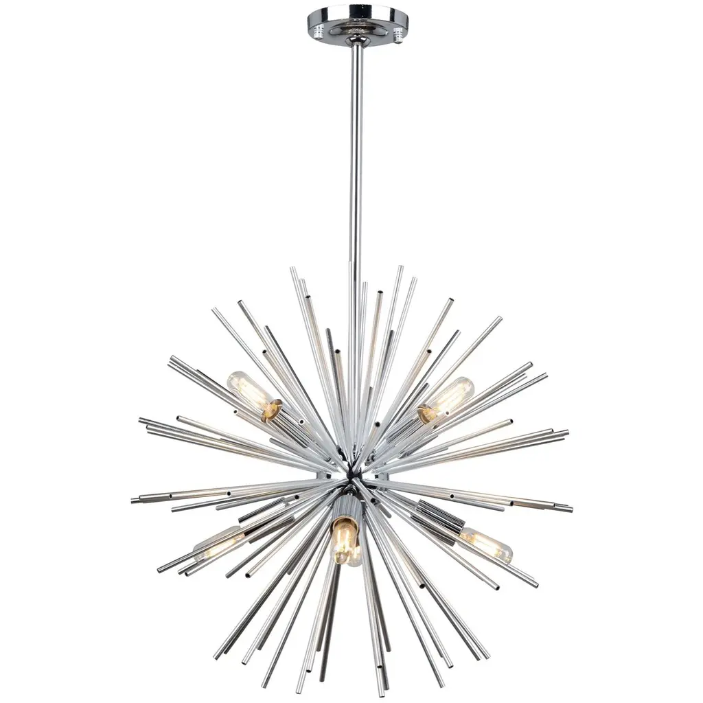 The Vega Semi-Flushmount from Dainolite creates a striking statement as it fills a room with sparkling light. Its sleek canopy holds a dome-shaped base forming the center for its sputnik-style design. Thin spears spread from every angle, extending sharply to form a lively silhouette. Its incandescent lamping is held by cylindrical sockets set within the spears, emitting warm light enhanced by smooth metal that surrounds it. This vibrant fixture is the perfect addition to a retro-inspired space.