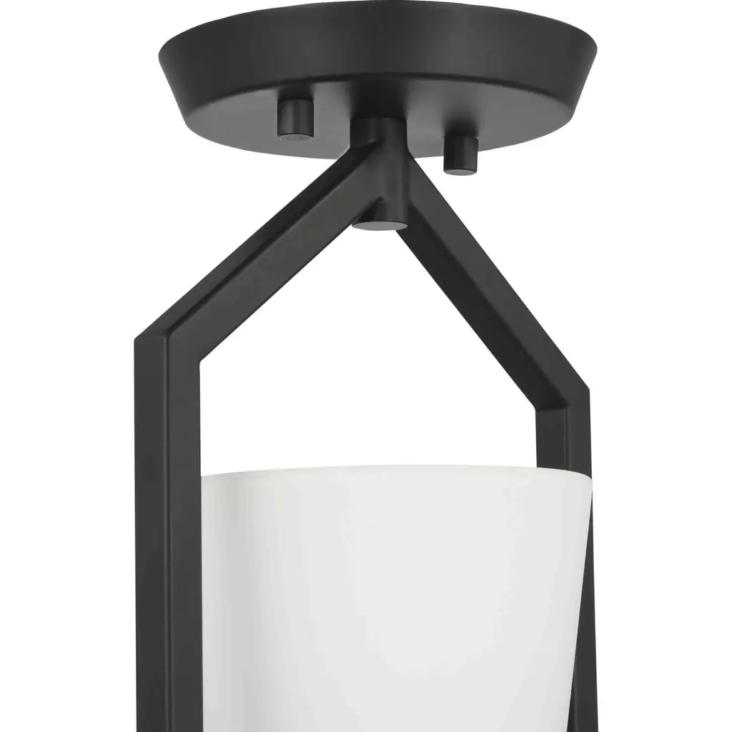 Elegantly extended, the Vertex semi-flush mount is composed of angular forms to create a bold design that perfectly complements halls, foyers and kitchens in modern interiors. Its distinctive silhouette is coated in a matte black finish. An etched glass shade offers bright illumination to spaces below.