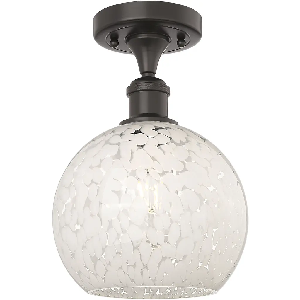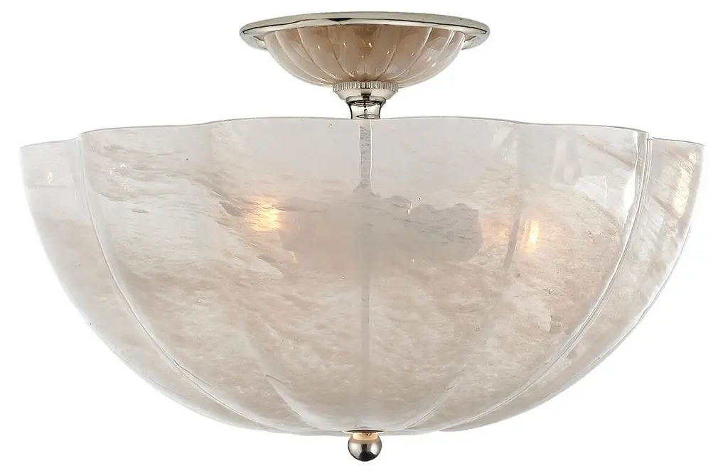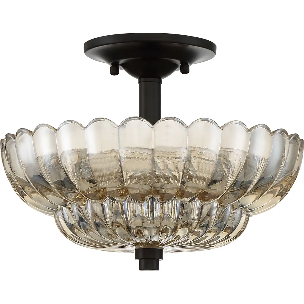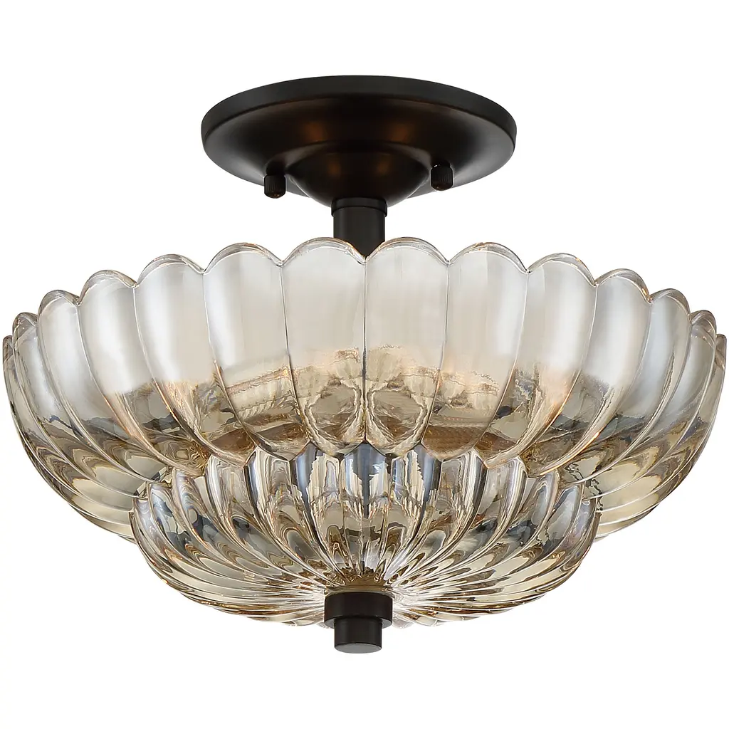 Featuring a beautifully scalloped shade, the Whitecap semi-flush is elegant and sophisticated. The amber glass flows beautifully upward towards the canopy. It is finished in a rich Mottled Cocoa.