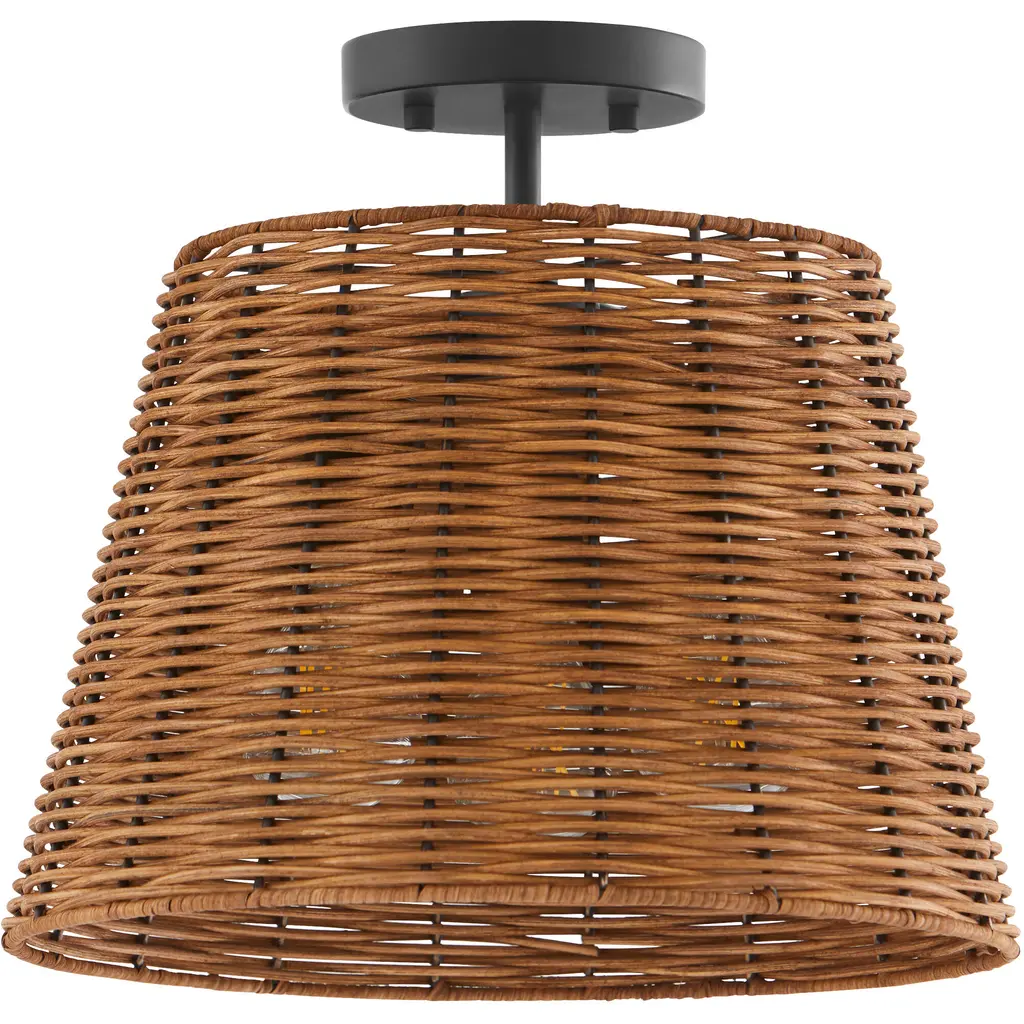 The Wicker series is a premier lighting solution for any boho-chic or modern farmhouse design. A classic cane weave punctuates matte black or aged brass canopies. The espresso-finished 13-inch tapered drum shade houses three 60-watt medium-base sockets.