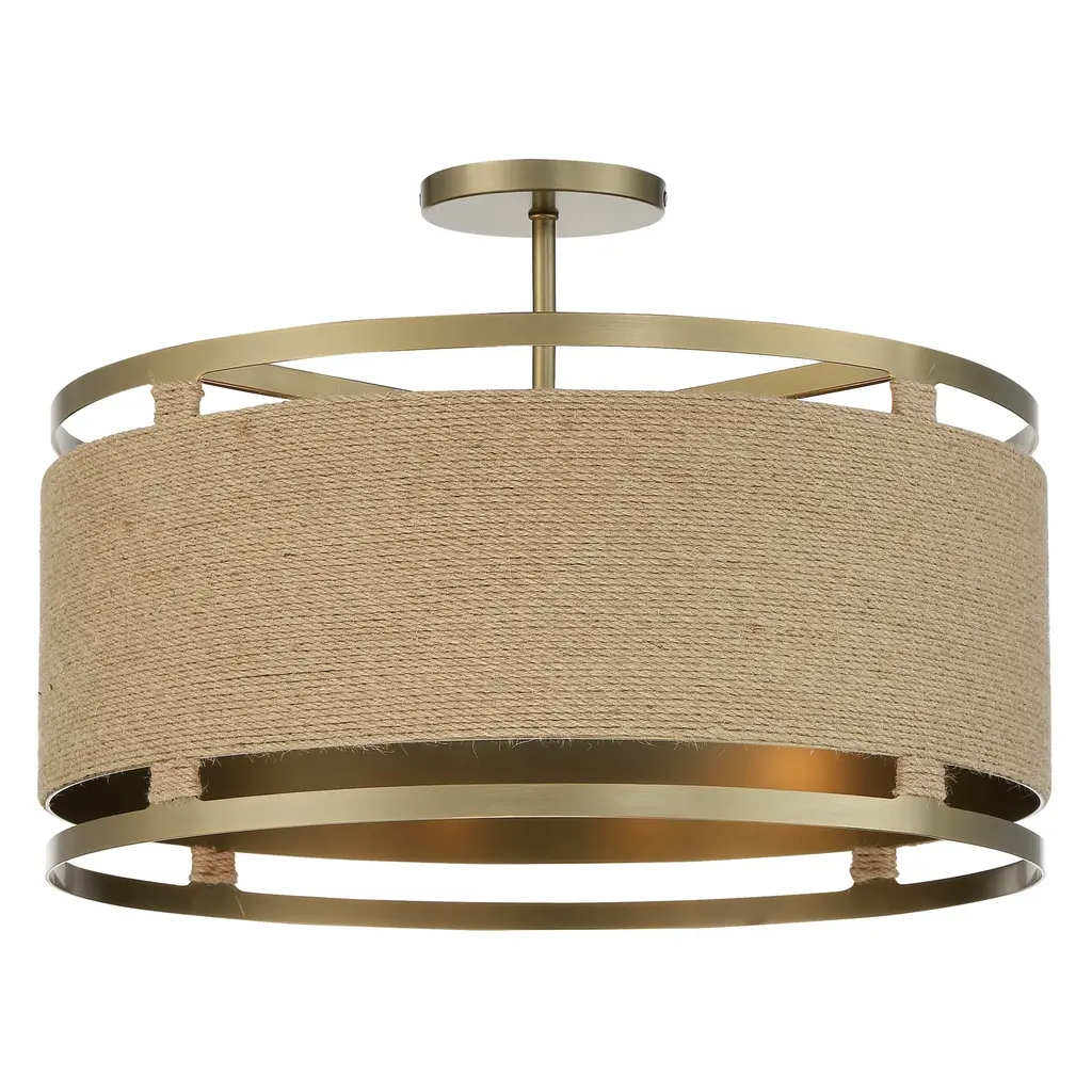 The Windward Semi-Flushmount by Minka-Lavery has a warm and inviting personality. Nestled close to the ceiling, a drum-shaped brass shade surrounds an arrangement of candelabras and is finished with a layer of rope wrapped around its form, giving it a textured quality. A sleek, decorative metal band frames either side of this shade, adding a tailored and airy touch to this handsome design as it lends an even layer of illumination to its surroundings.
