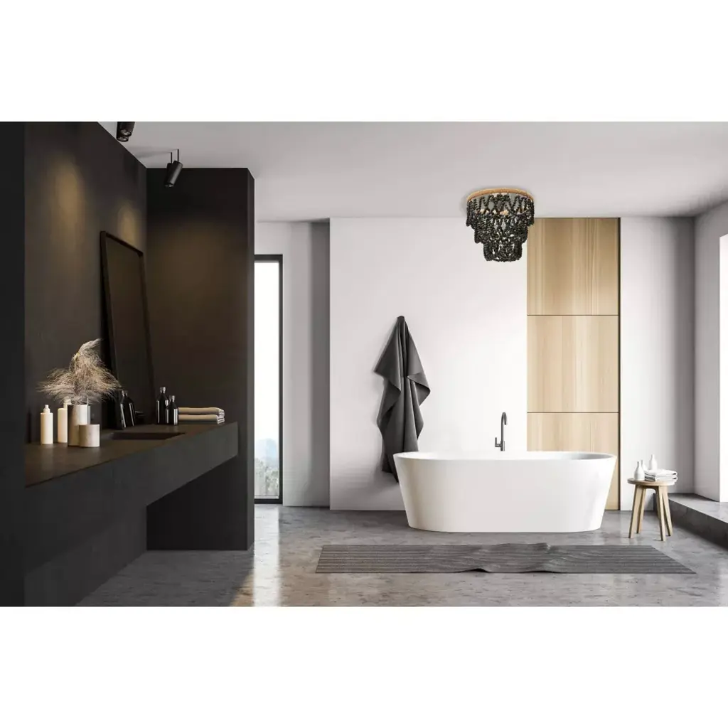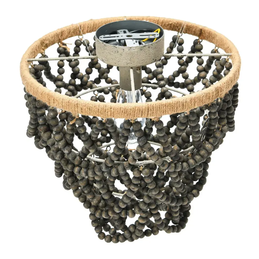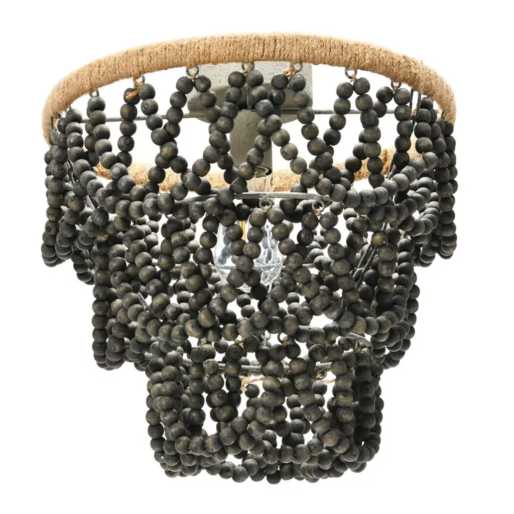 This semi-flush mount fixture showcases strings of dark gray wood beads draped from a round frame, and brims with both neutral and rustic appeal. Perfect for coastal cottages and French country aesthetics alike, this beautiful chandelier is a show-stopper and is sure to become a favorite statement piece in any home.