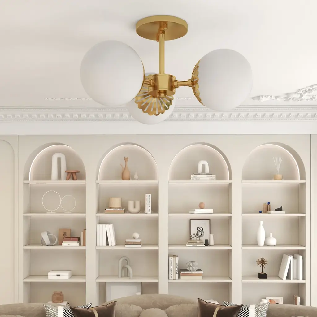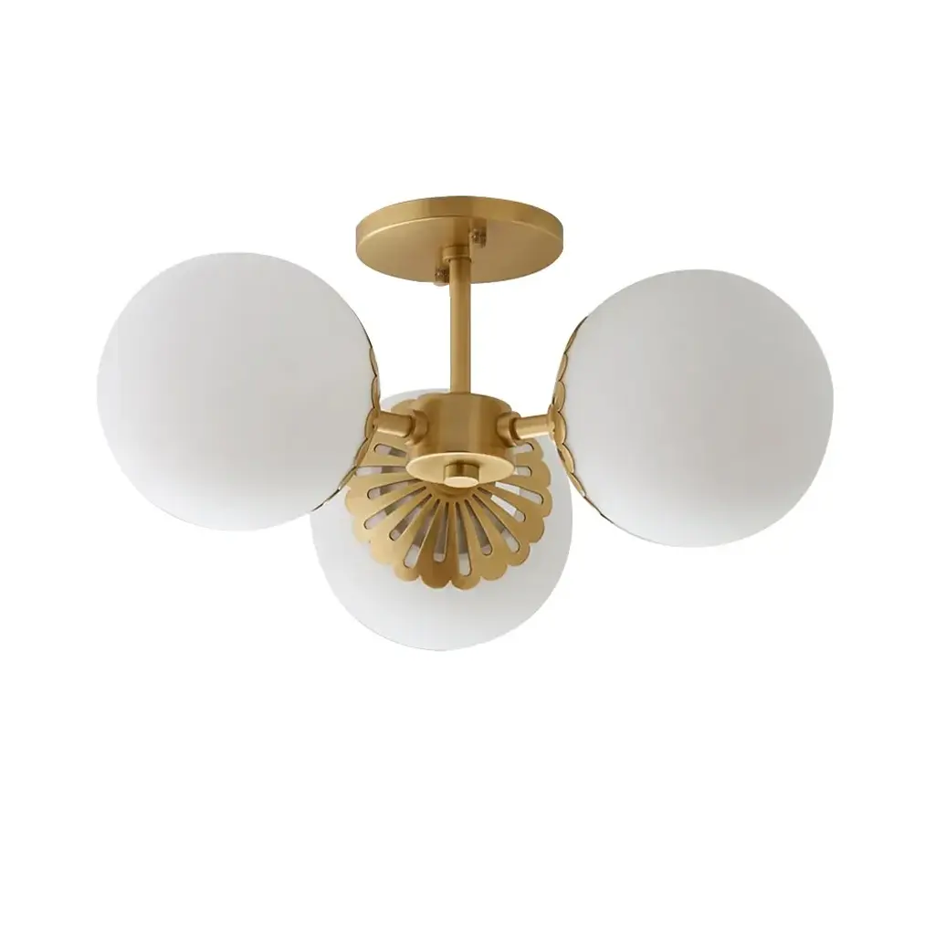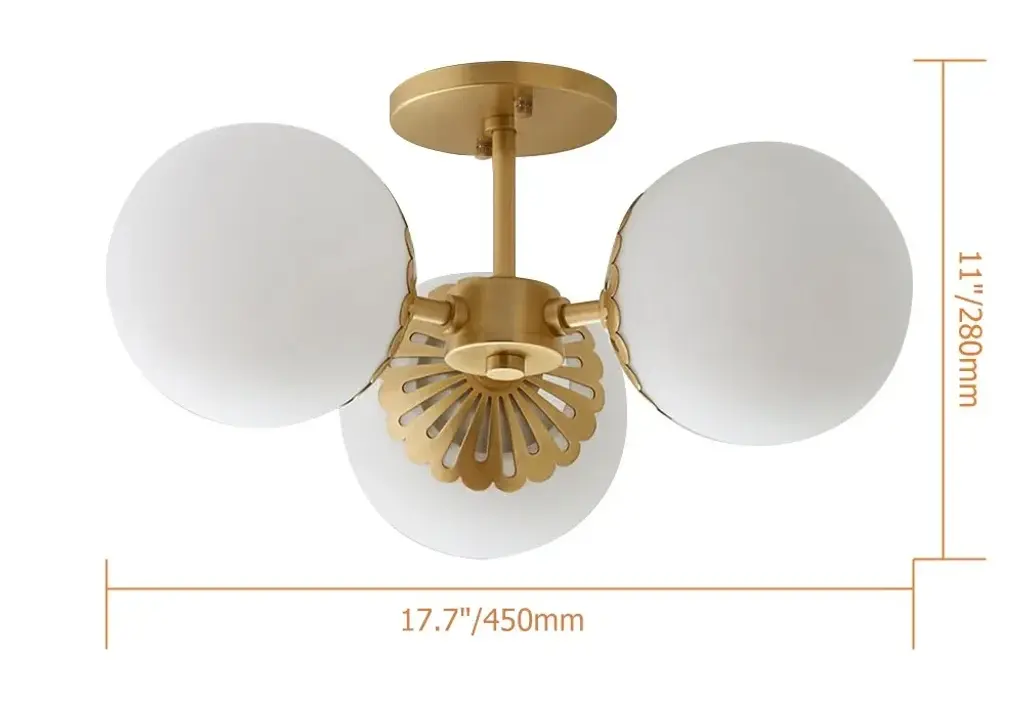Inspired by mid-century modern style, this 3-light globe semi flush ceiling light balance form and function perfectly. With 3 white glass globe, this charming chandelier will illuminate your home with a modern flair. The semi-flush design is perfect for low-ceiling rooms, while diffusing abundant light to any room, adding a welcoming, warm ambiance. Constructed from white glass and metal in gold, this lighting is perfect for a transitional, cottage-style or mid-century home.