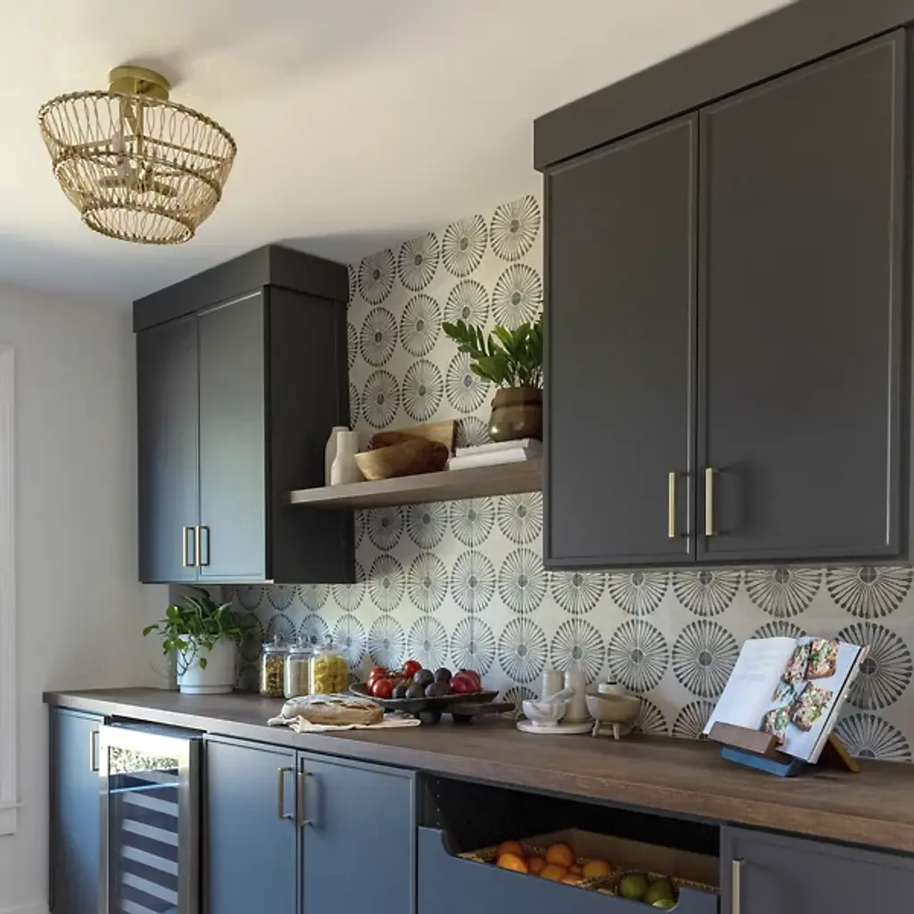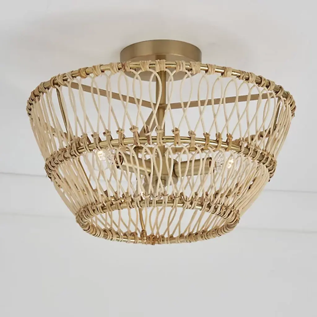 Add a welcome coastal appeal to inside ceilings with the Wren Semi-Flushmount from Capital Lighting. A circular metal and short downrod descend to three candelabra lamps arranged in an evenly-spaced array. The contrast between the clean-surfaced metal and warmer wood draws the eye, while an open bowl-shaped shade woven from hand-made rattan partially disrupts direct light to the sides, casting a lattice of shadows around the focused pool of downlight that reaches out below.