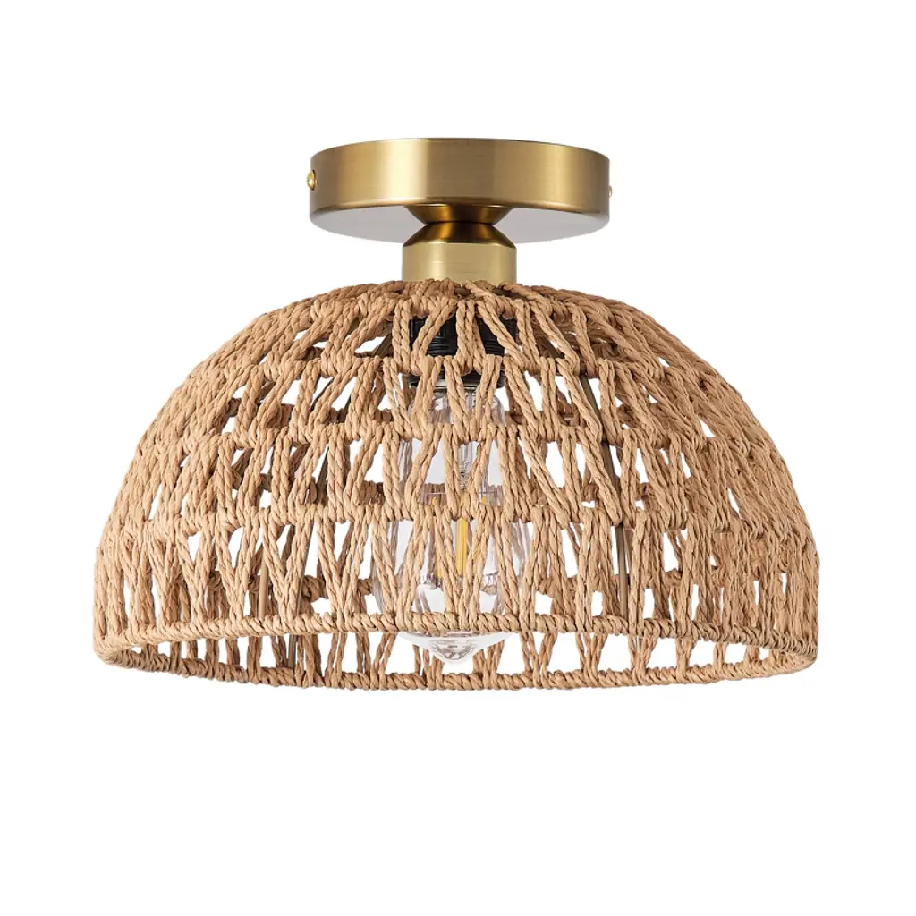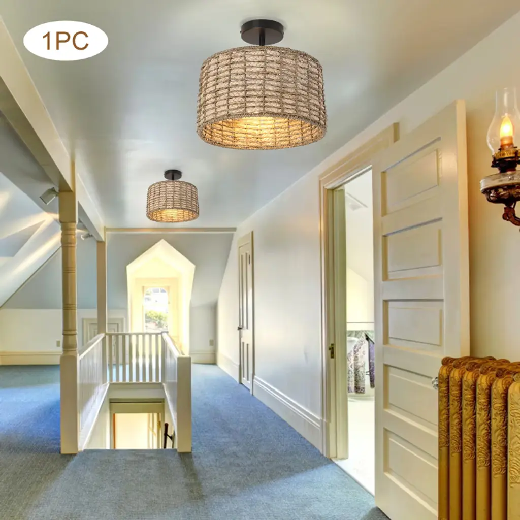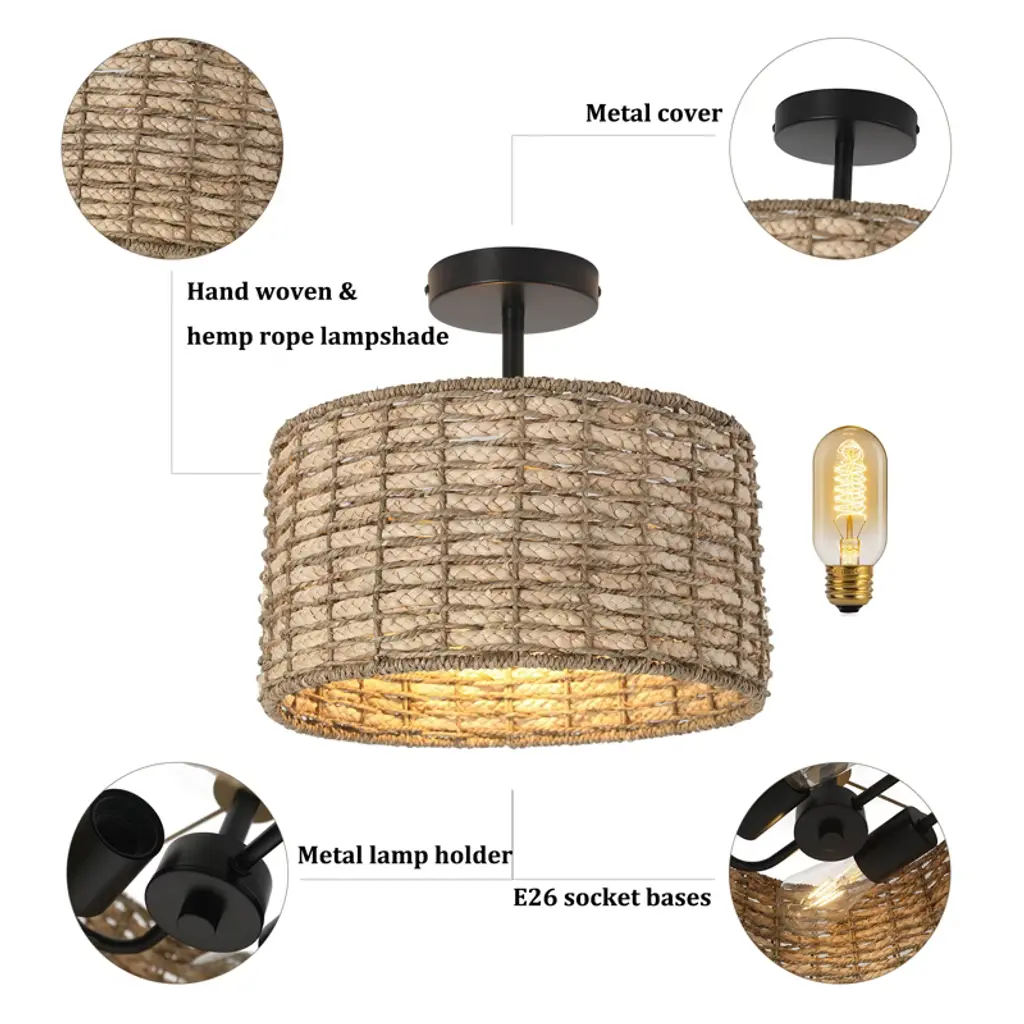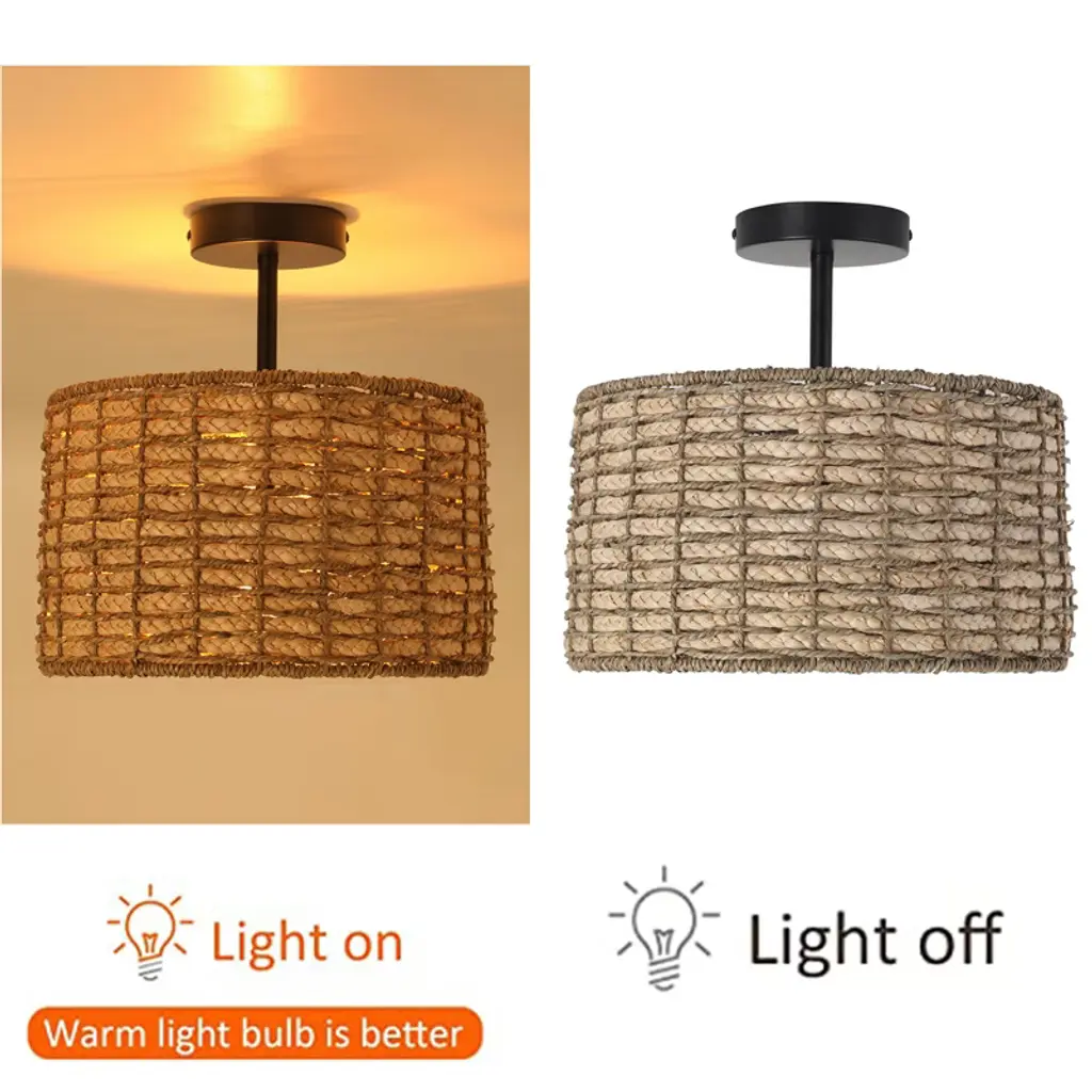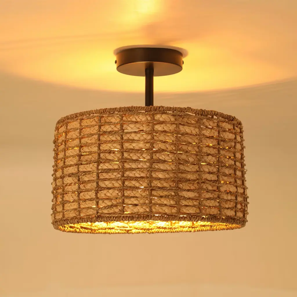 Yiyibyus Rattan Semi Flush Mount Ceiling Light, 2-light With Hand Woven Drum Shade
