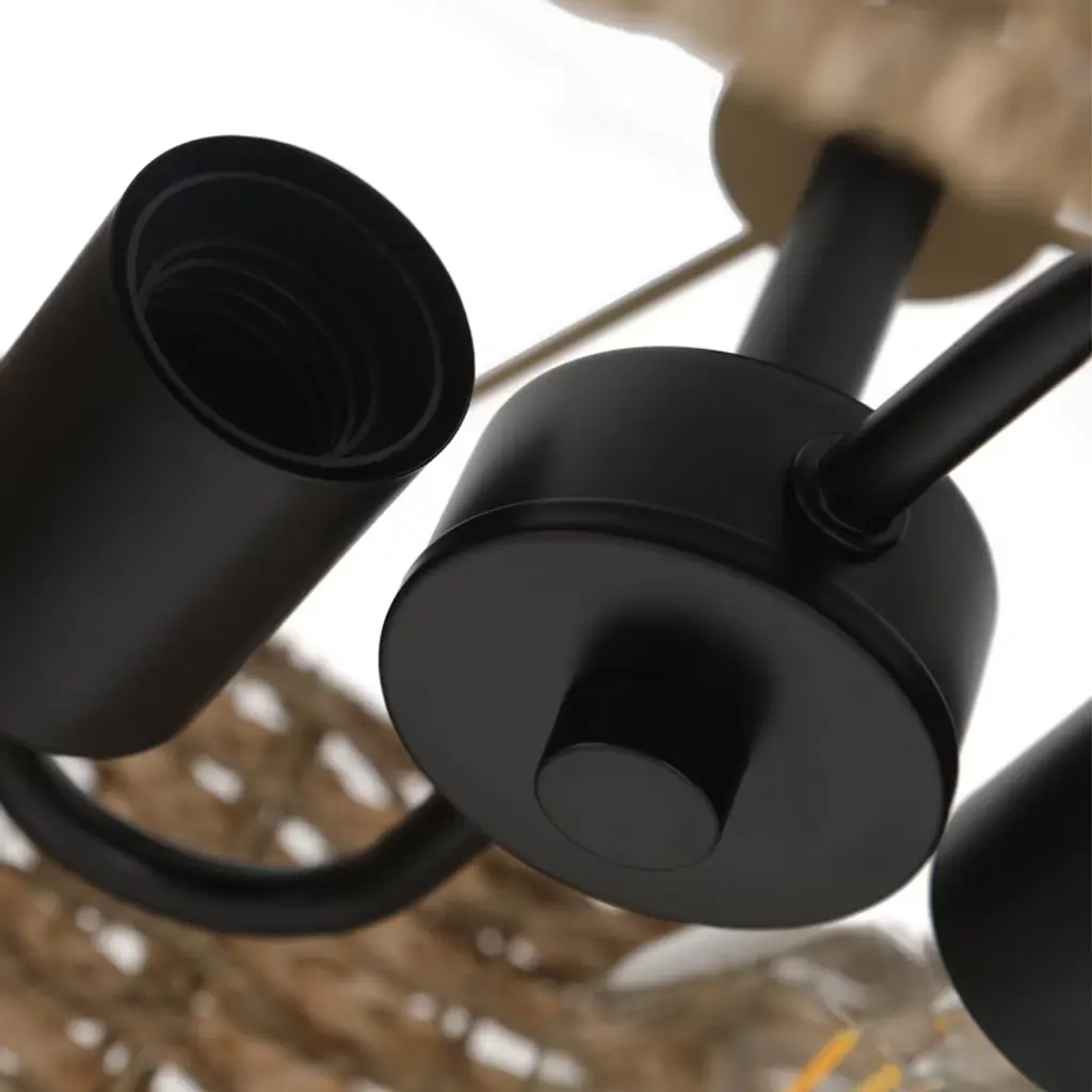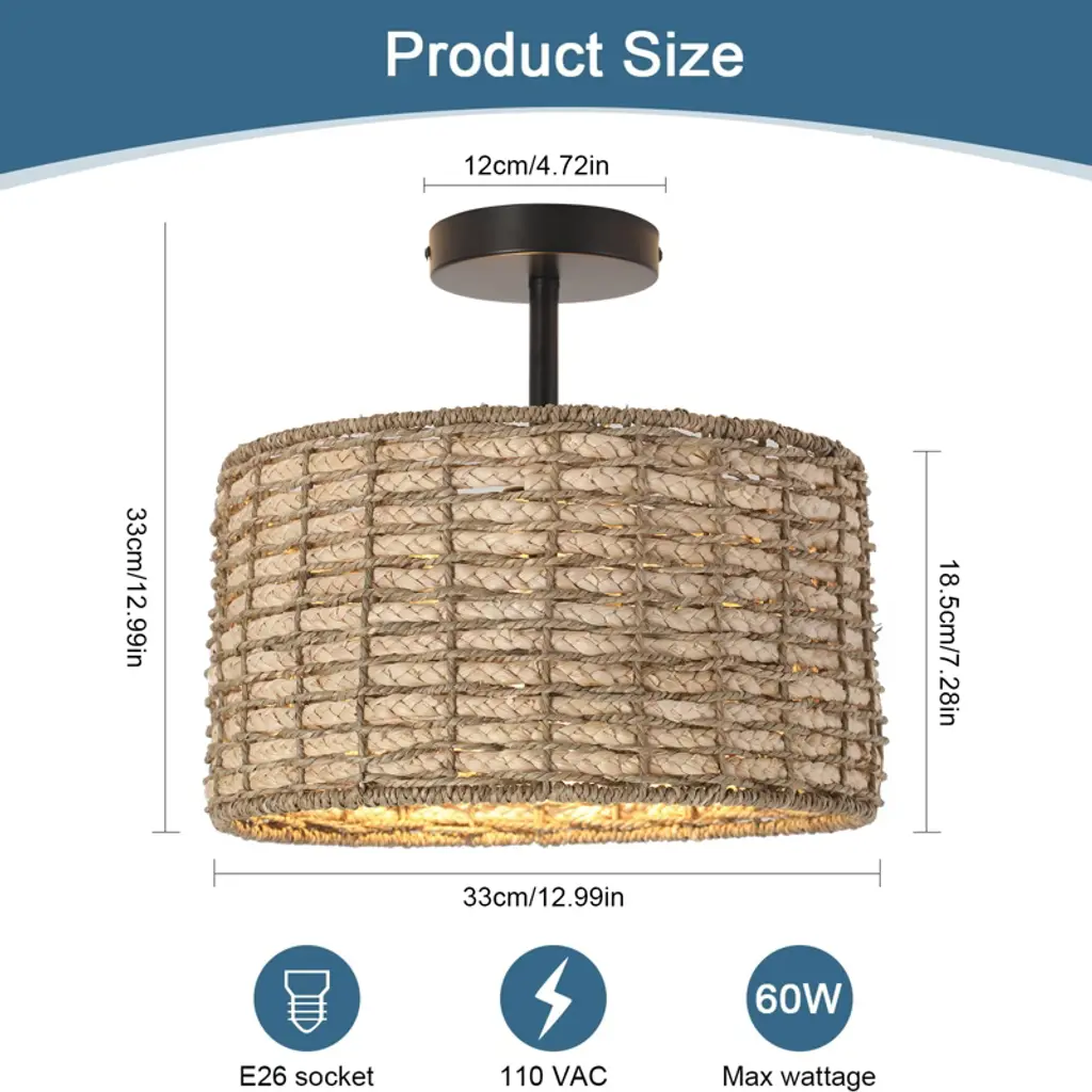 Infuse your home with natural elegance using this 2-light rattan chandelier. Its beautifully woven rattan shade and vintage-inspired black iron frame create a warm, inviting atmosphere, serving as both a functional light source and a stunning decorative piece. The design casts a soft, diffused glow that is gentle on the eyes, perfect for creating a cozy and relaxing ambiance in any room. Specification Material: Iron, Rattan Color: Black, Brown Shape: Cylindrical Surface Finish: Baking Paint Style: Vintage Efficiency: E Assembly Required: Yes Lamp Form: Chandelier Installation Type: Hanging Indoor/Outdoor Usage: Indoor Control Mode: Wall Control Switch(Not Included) Light Source Type: 2*E26 (Not Included) Adjust Brightness: Compatible with Dimming Lamp and Dimmer Switch Voltage: 110V Bulb Maximum Wattage: 60W Illuminated Area: 30㎡/323sq. ft Product Size(φ&H): 33*33cm/ 12.99*12.99in Ceiling Tray Diameter: 12cm/4.72in Lampshade Height: 18.5cm/7.28in