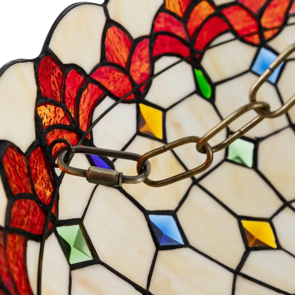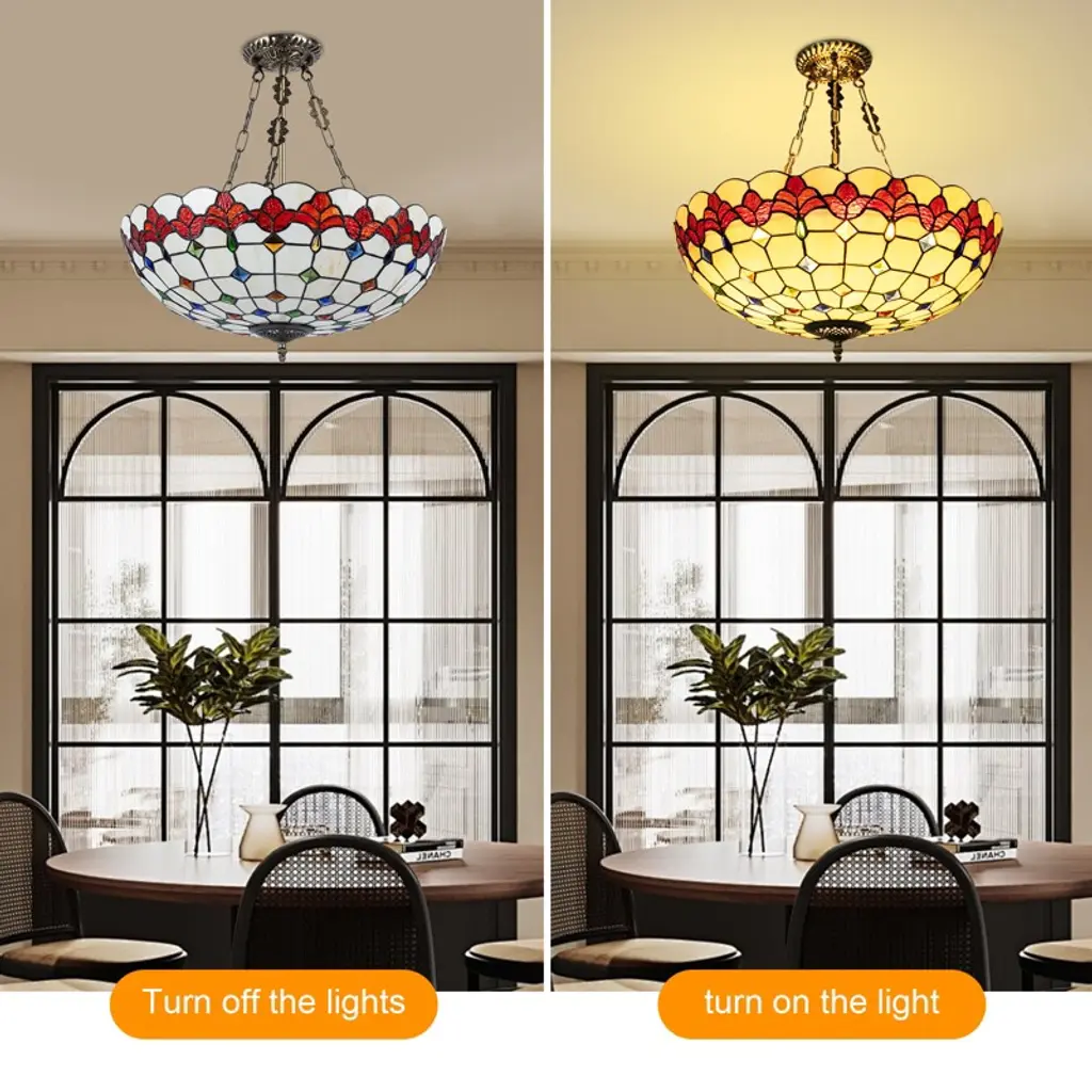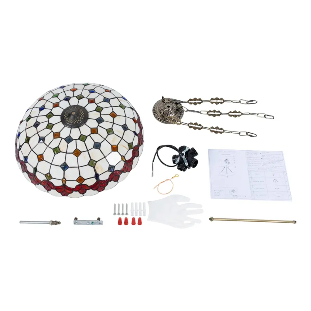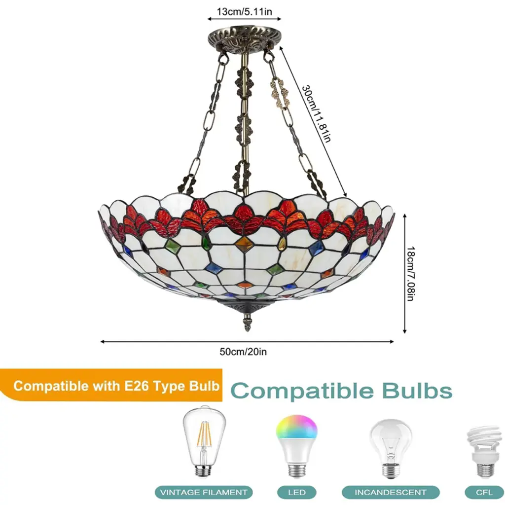 Transform your space with this stunning Tiffany-style ceiling lamp, designed to resemble a floating piece of jewelry. Crafted from premium copper, tin, and glass, its unique umbrella-shaped lampshade features elegant diamond patterns and petal edges, casting a soft, warm glow that creates a charming and comfortable atmosphere. More than just a light, it is a beautiful centerpiece that enhances the quality of your home and connects family moments. Specifications Material: Copper, Tin, Glass Process: Electroplating Color: Multicolor Style: Tiffany Style Efficiency: E Assembly Required: Yes Mount Type: Ceiling Mount Control Mode: Wall Switch(Not Included) Light Source Type: 5* E26(Not Included) Voltage: 100-240V Max. Single Bulb Power: 60W Applicable Area: 10-15m²/107.64-161.46ft² Chain Adjustment Range: 0-30cm/0-11.81in Lampshade Size(D*H): 50*18cm/20*7.08in Each Chain Length: 30cm/11.81in Base Diameter: 13cm/5.11in