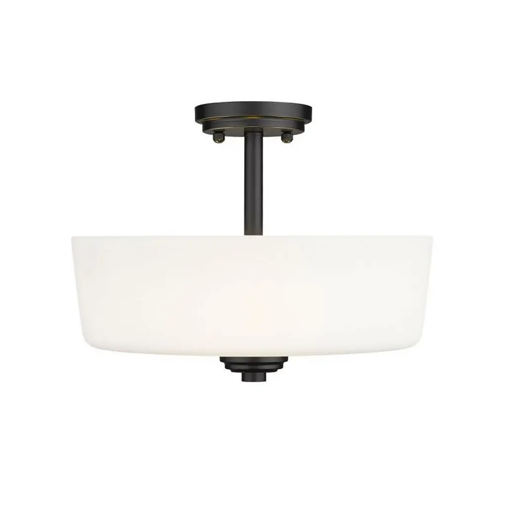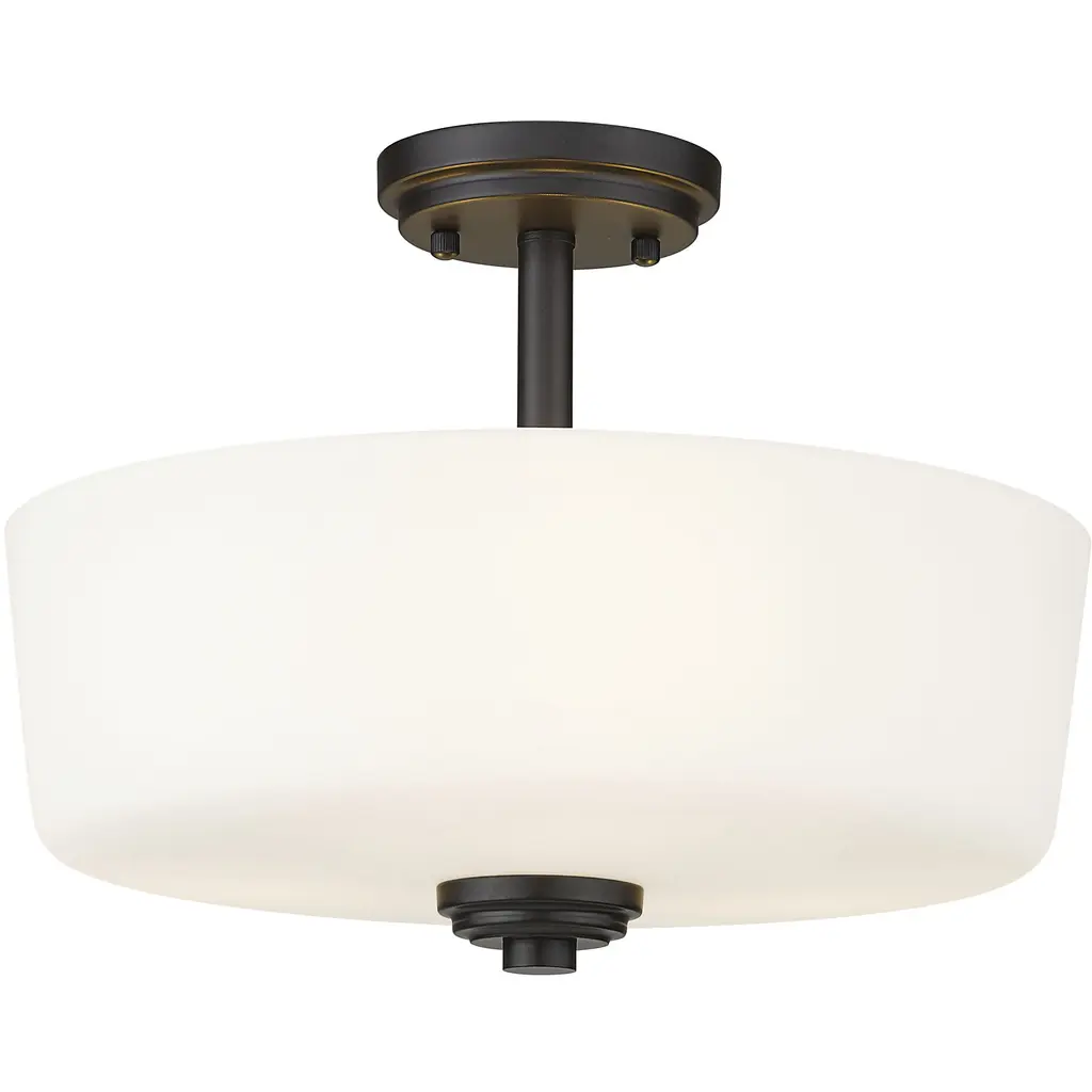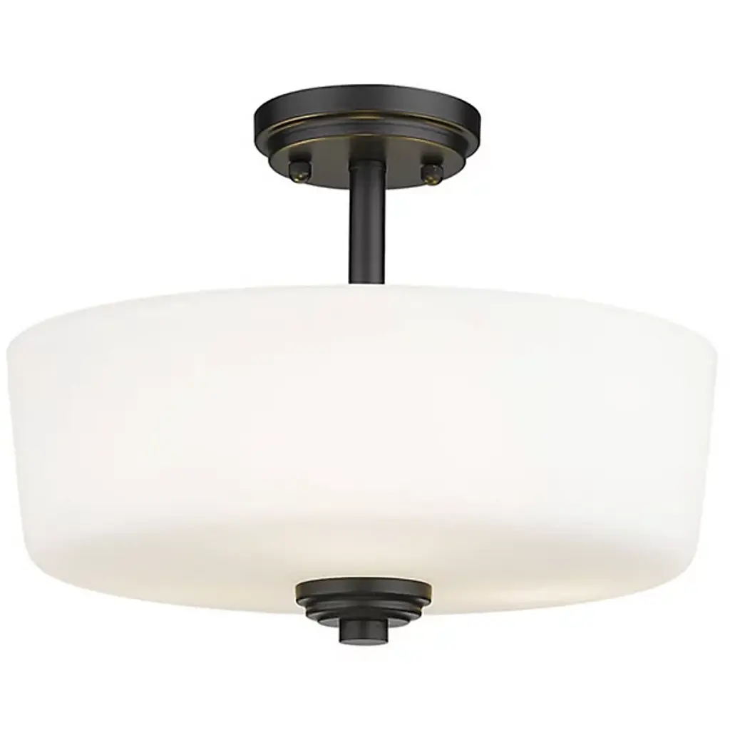 Bathe your surroundings in the graceful illumination that radiates from this three-light semi-flush mount ceiling fixture. Stylishly simple, it boasts a round, bronze finish frame that creates a striking contrast with its delicate, matte opal shade. This transitional ceiling light is especially ideal for a bedroom, hallway, kitchen, or living room.