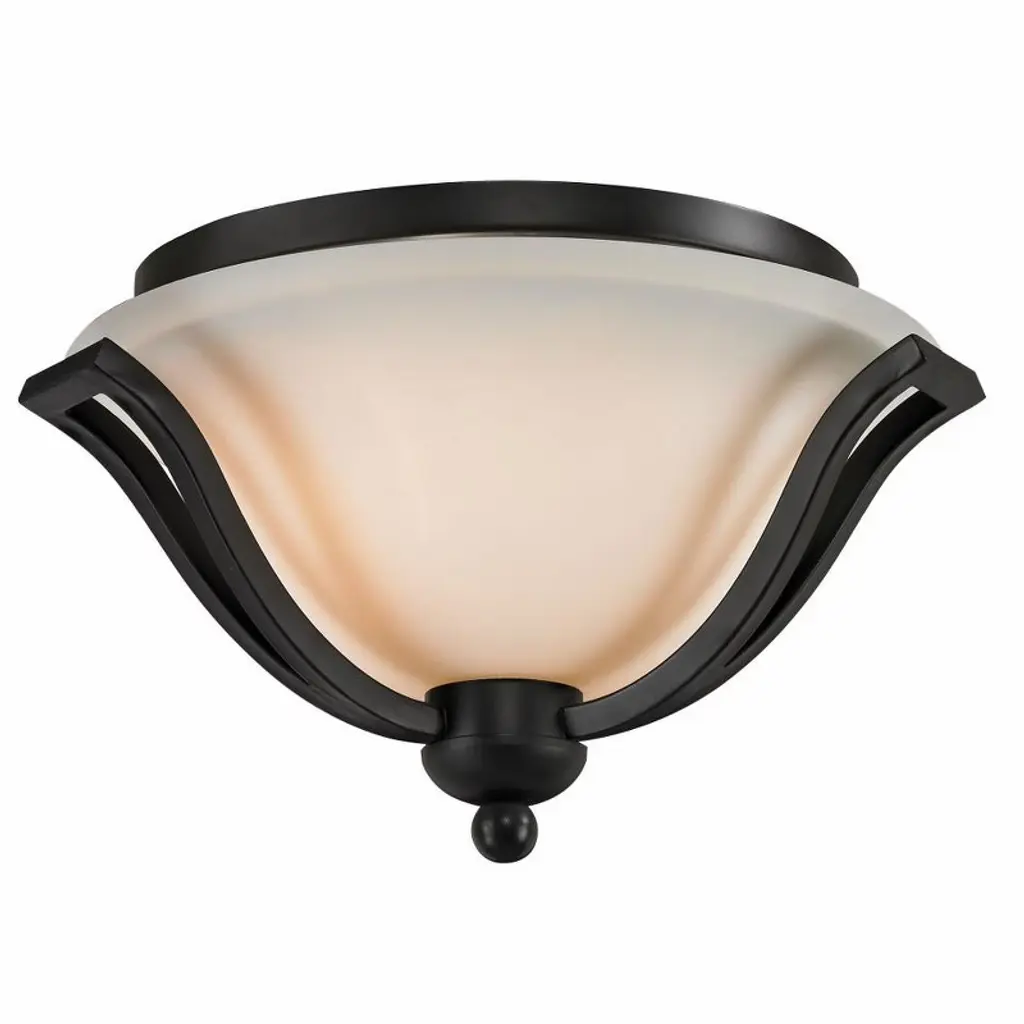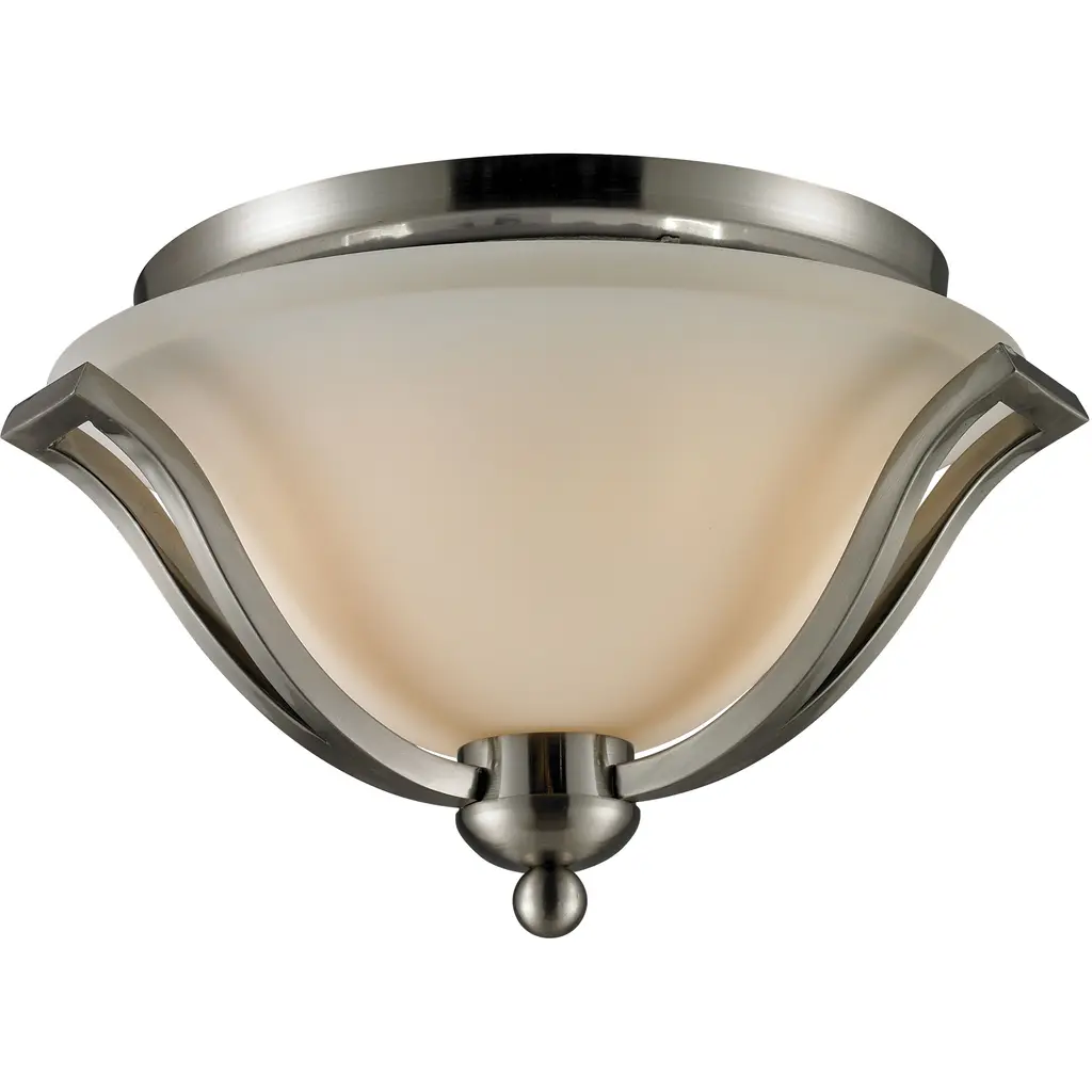 This lustrous two light ceiling lamp paired with its brushed nickel finish and its matte opal shade brings with it an air of refined class. Bedroom/Dining Room/Foyer/Hallway/Kids Room/Kitchen/Living Room/Office/Utility Room Shade Included: Yes Dimmable: Yes Material: Steel, Finish Color: Brushed Nickel, Width: 15", Height: 9", Lamping Type: Incandescent, Number Of Bulbs: 2, Wattage: 60 Watts, Dimmable: Yes, Moisture Rating: Dry Rated