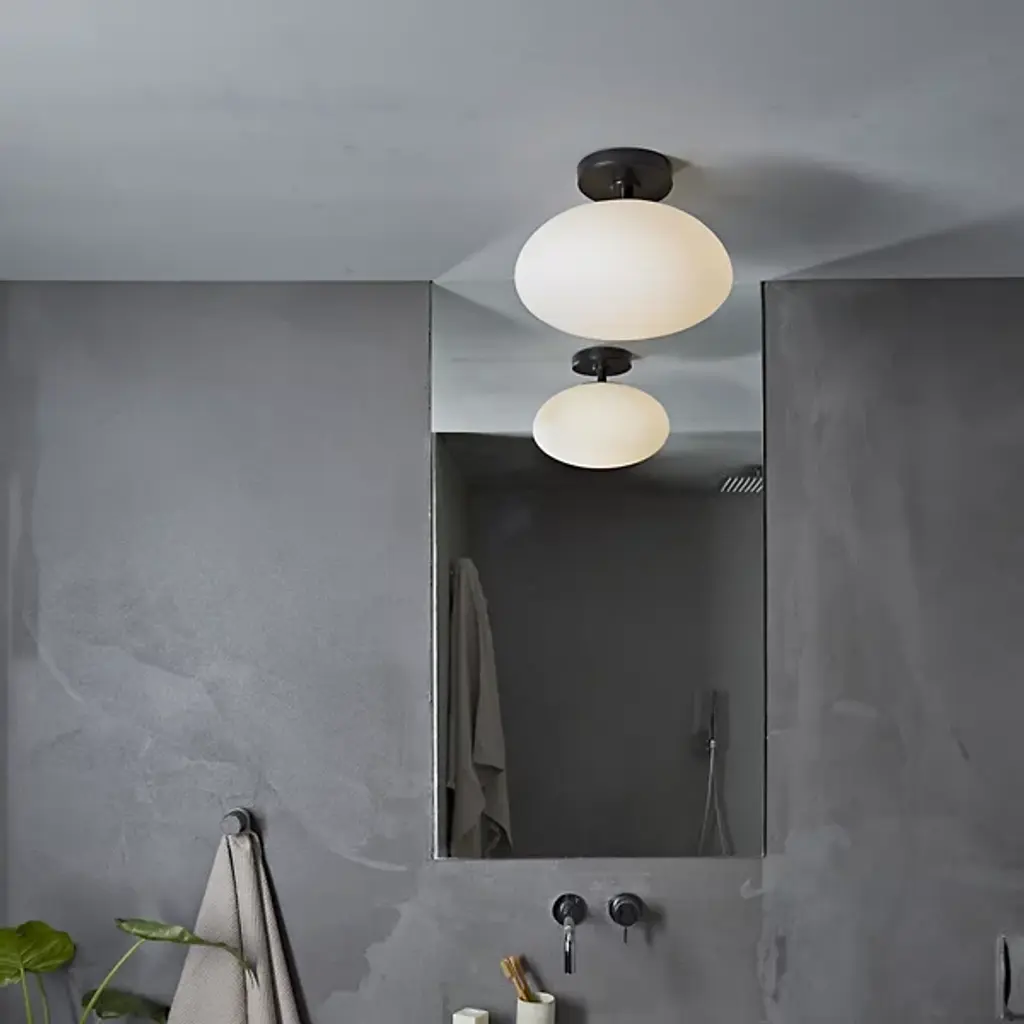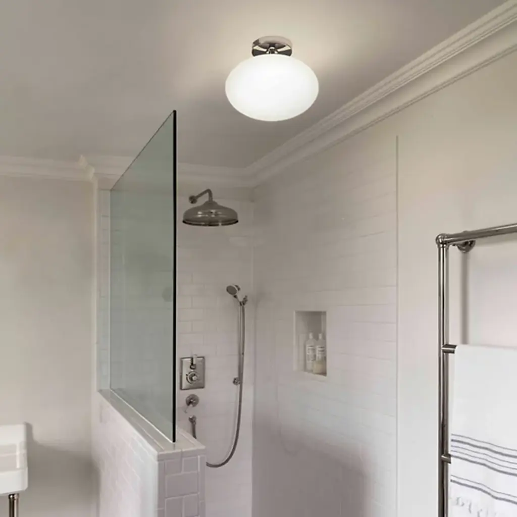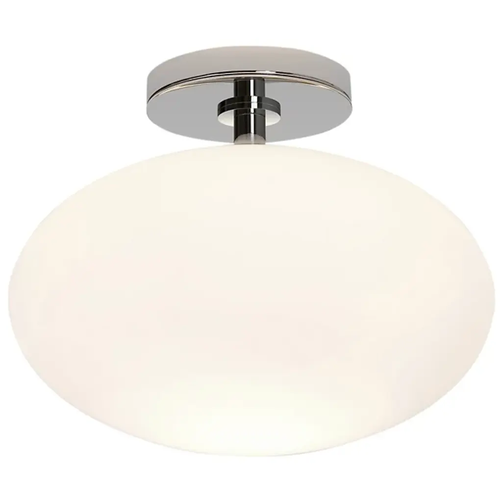 The stretched oval globe of Astro Lighting’s Zeppo Semi-Flushmount light provides bold illumination in a smooth modern style. A White Opal Glass diffuser descends from the polished chrome metallic base, offering powerful illumination without the harsh brightness of an uncovered lamp. The Zeppo is damp rated, which means you can install it in a bathroom, though it works equally well showing off open spaces in an entryway as well as above a kitchen sink or table.