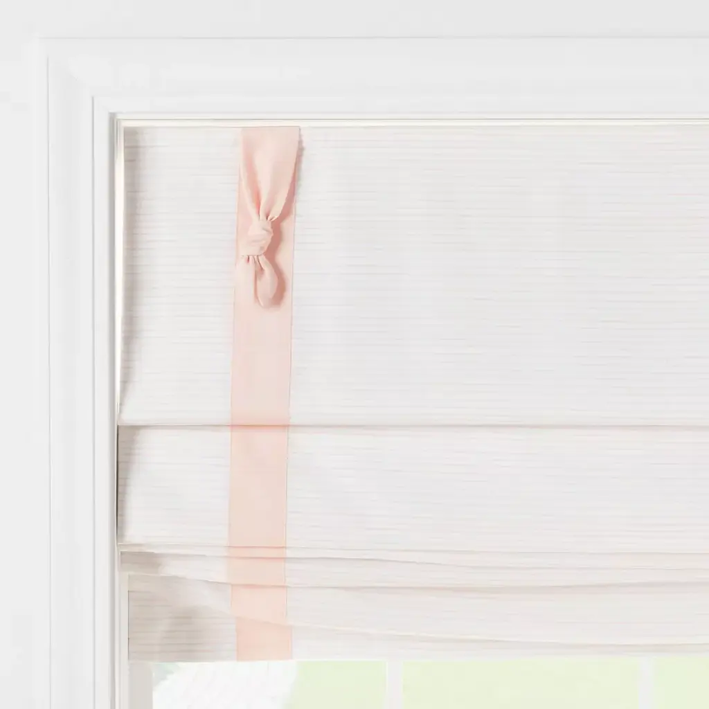 Add style and function to your kid's bedroom with the 30-Inch x 64-Inch Blackout Roman Shade from Pillowfort™. Boasting a chic white-and-pink design with pink vertical side ribbons, this blackout shade completely blocks out the light in your little one’s room so they get the best night’s sleep possible. The shade’s cordless retraction lets you easily open and close it throughout the day, and it pleats beautifully for elegant charm. Plus, the simple pink-and-white striped design blends seamlessly with their existing room decor to create a stylish nighttime sanctuary.