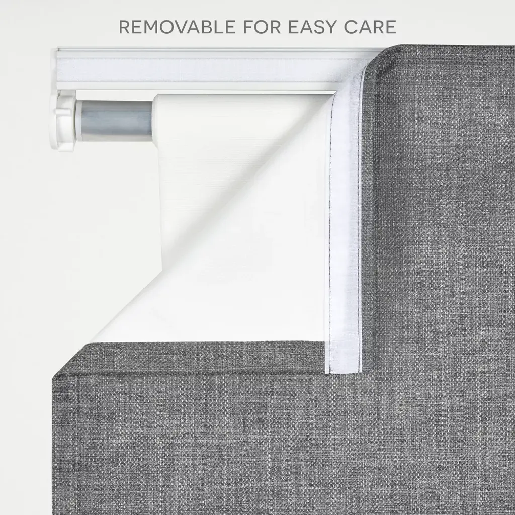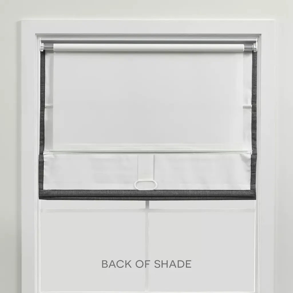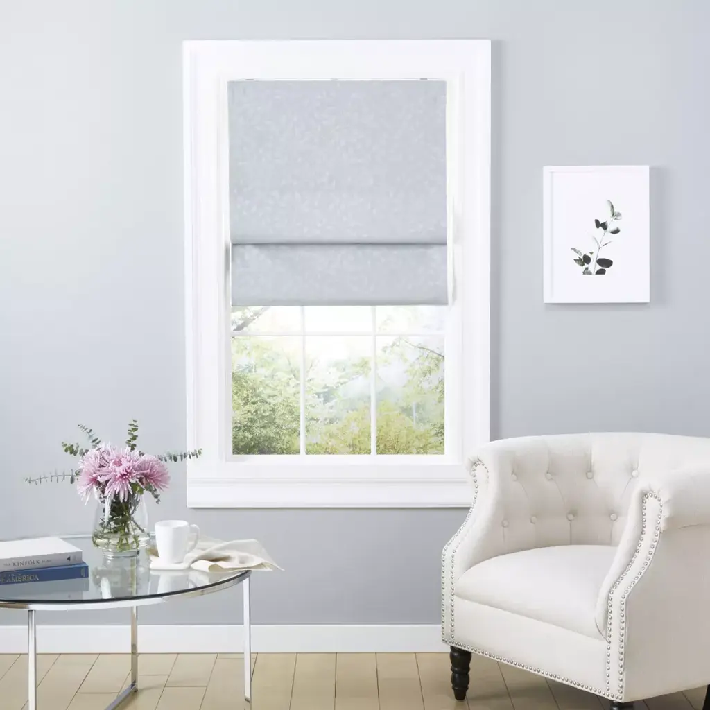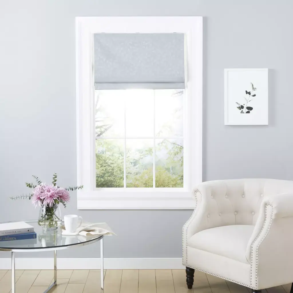 The Exclusive Home Curtains Bolan Botanical Total Blackout Roman Shade in silver features a tonal jacquard leaf pattern on high-quality, silk-look fabric and offers an elegant addition to your windows. This cordless shade has a foam blackout backing provides maximum privacy and blocks sunlight. A handle makes it easy to pull it up and down. The classic design is easy to coordinate with any decor style. Hang the shade in your living room, dining room, kitchen, office, bedroom, or entryway.
