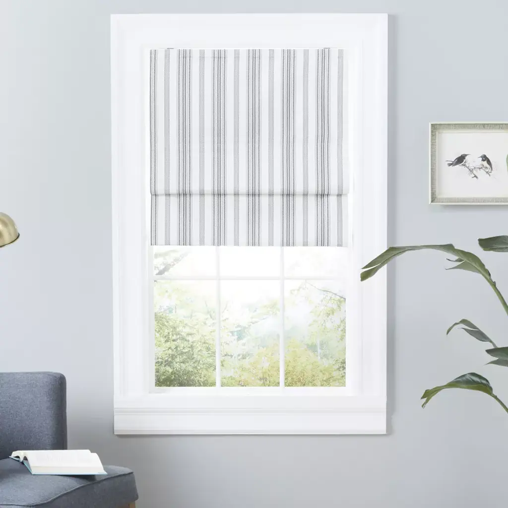 The Exclusive Home Curtains Ricardo Total Blackout Roman Shade in black features a multi-color jacquard stripe pattern on a blackout roman shade and offers a clean, modern accent for your window decor. A foam blackout backing blocks sunlight, provides privacy, and allows you to create darkness in your space any time of day, and a handle makes it easy to pull up and down. Hang this versatile shade in your living room, dining room, kitchen, office, bedroom, or entryway.