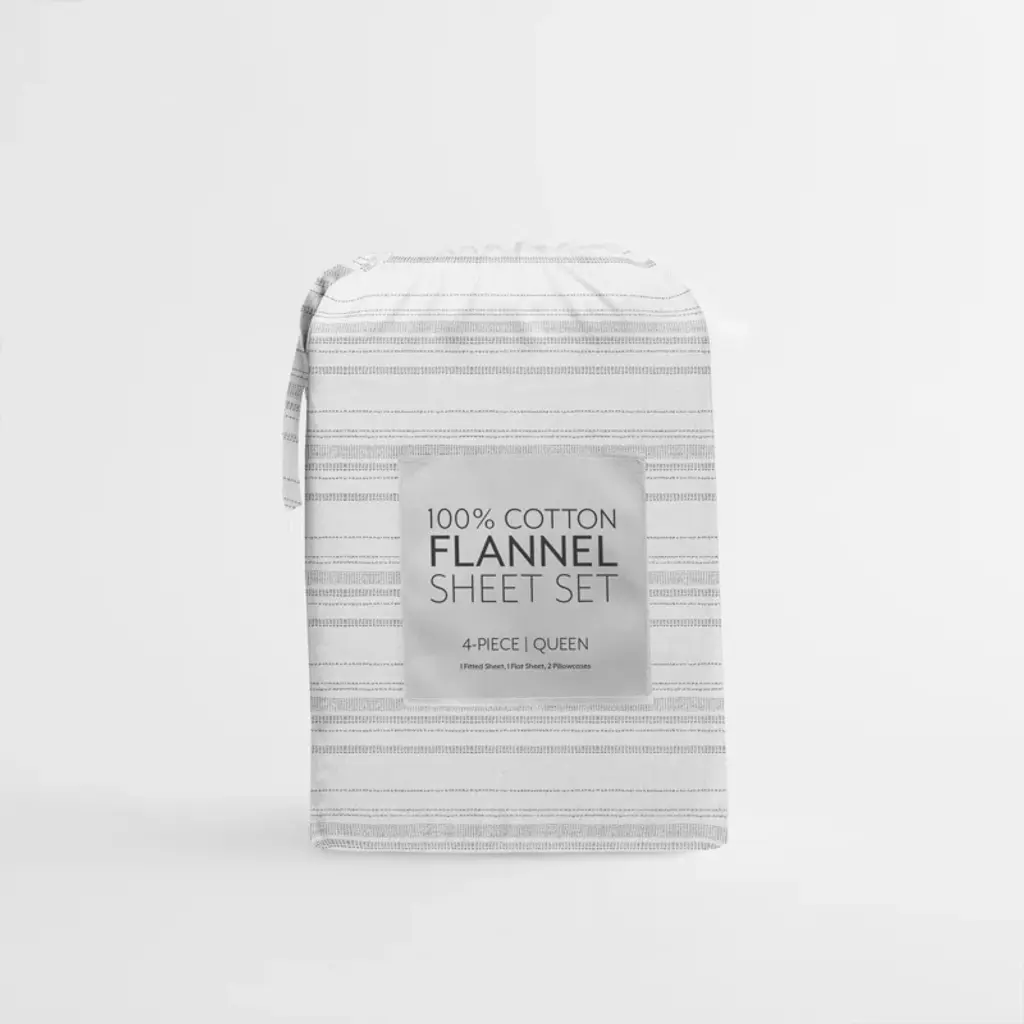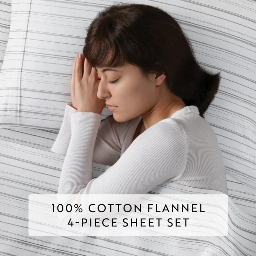 Treat yourself to a comfy new set of sheets with this flannel 4-piece sheet set. Featuring a weathered light gray stripe, and made from 100 percent cotton, each piece is double-brushed for an ultra-soft and cozy feel, making it the perfect new addition to your room!