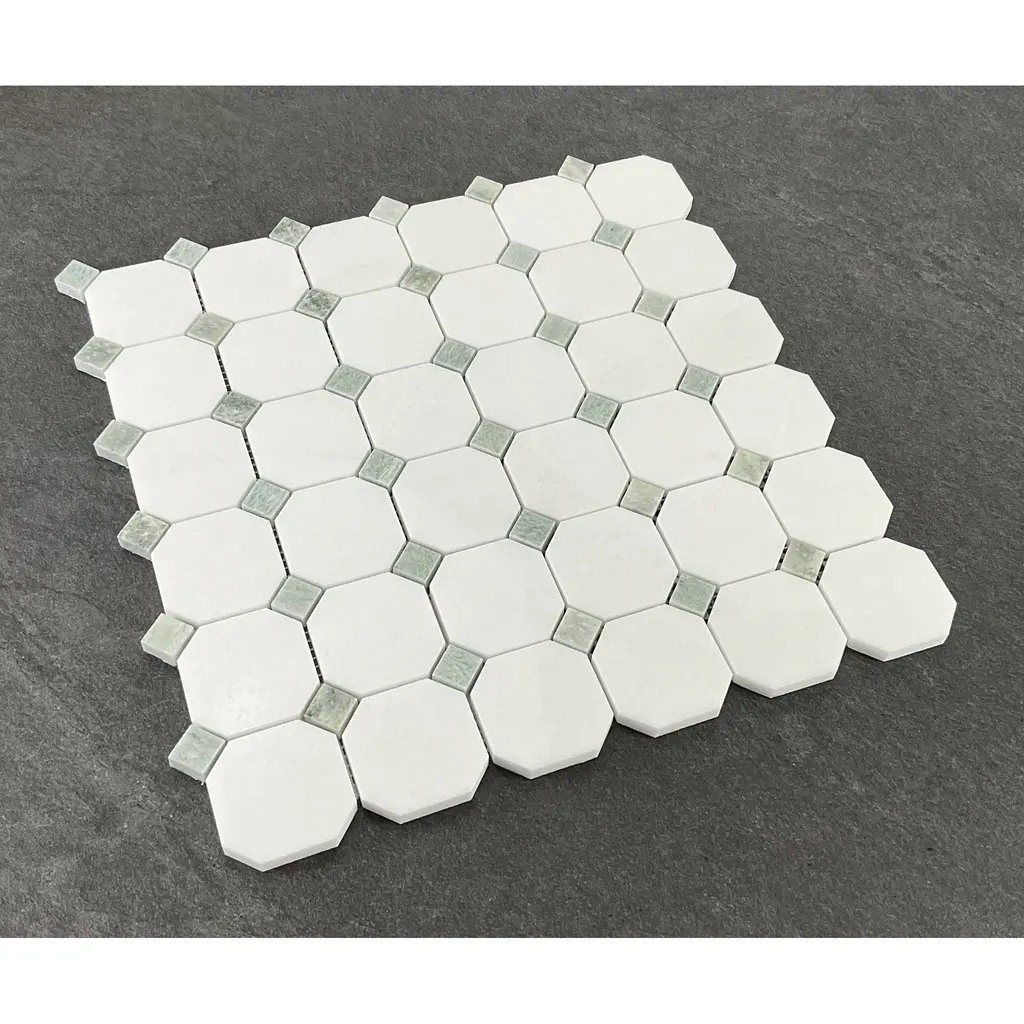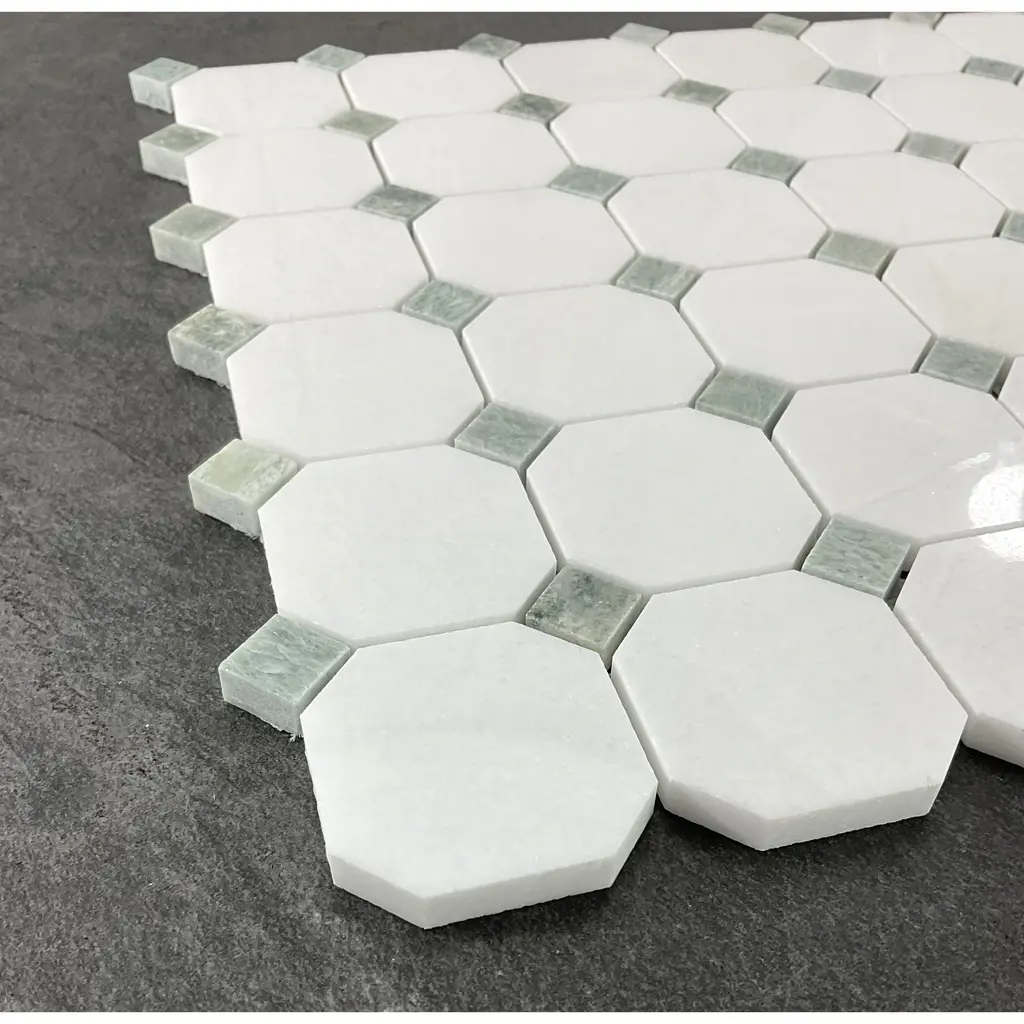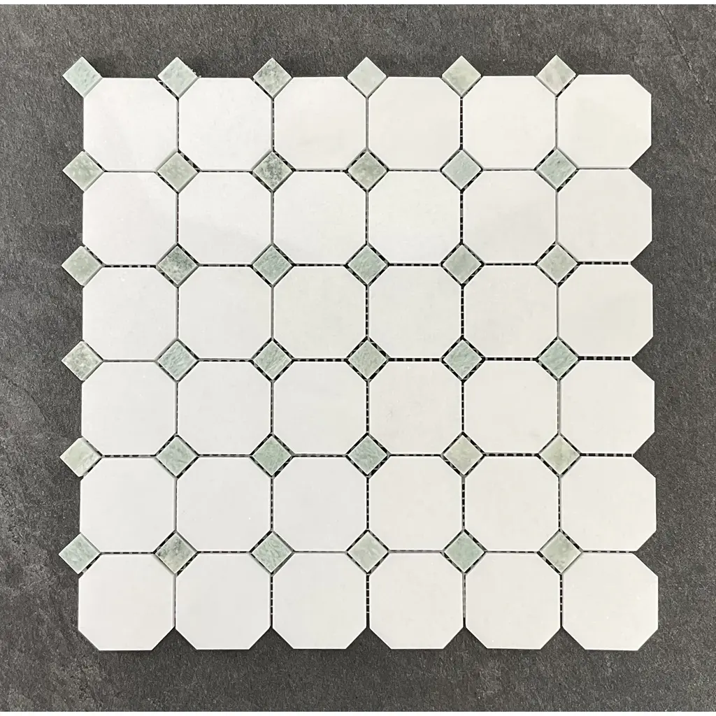 2" Octagon With Dot Marble Mosaic Tiles - Case (10 Sheets) - Case (10 Sheets) - Thassos White And Ming Green