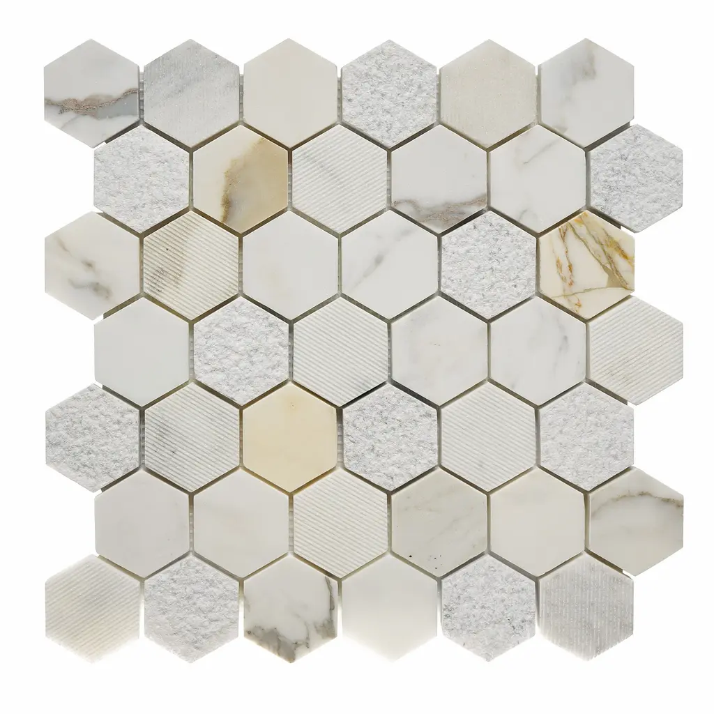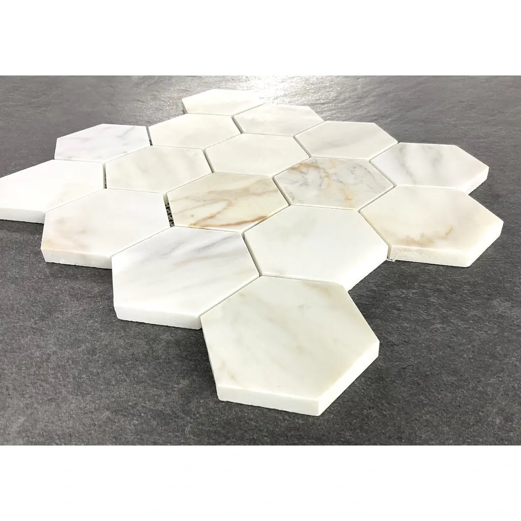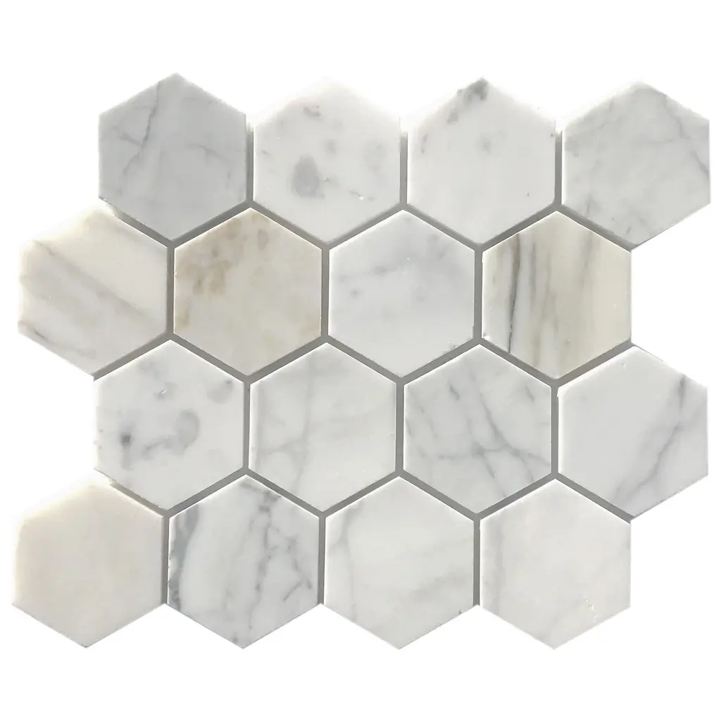 Color: 1. White Carrara (Honed) 2. Calacatta Gold (Honed)Style: 3" HexagonMaterial: Natural MarbleOverall Product Weight: 4.5 lb. Dimensions Mosaic Sheet: 14'' W X 12'' L Individual Tile: 3 W X 3 L Overall Thickness: 0.38 Surface Area per Carton: 4.5 SqFt