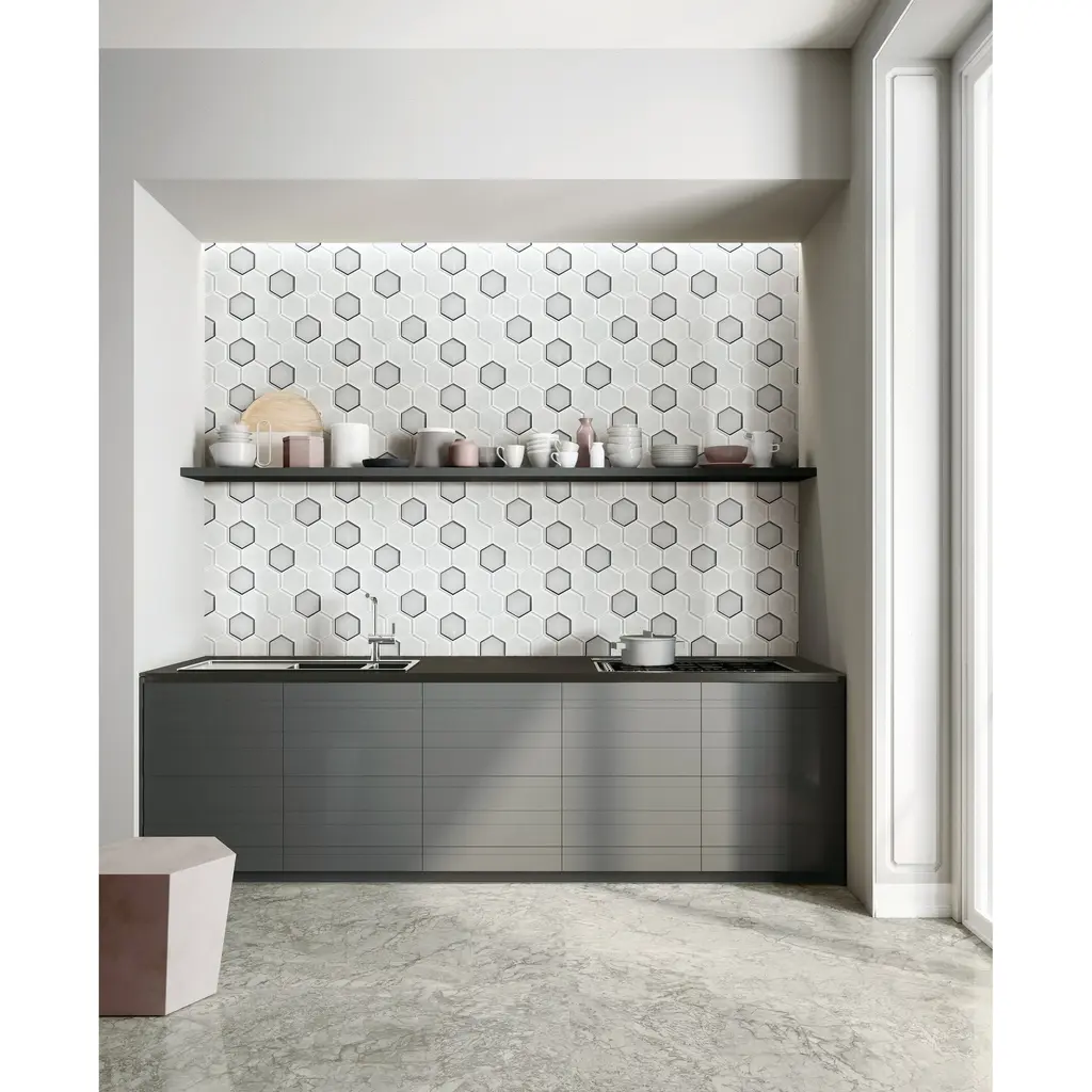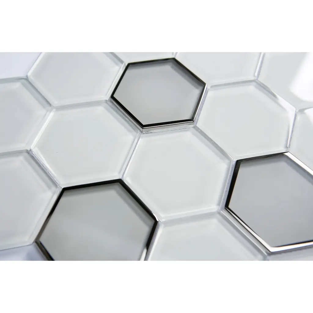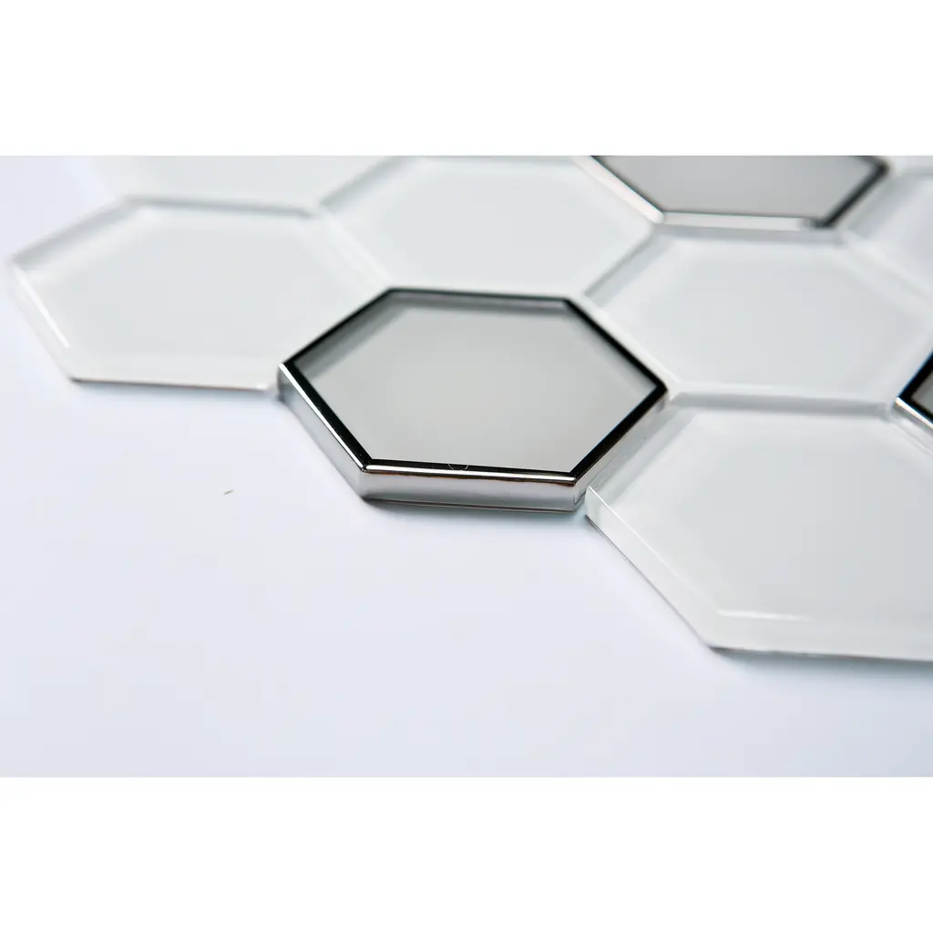 Material: Glass Style: Hexagon Color: White / Light Grey (with silver edges) Mosaic Sheet: 13.25'' W X 10.875'' L Individual Tile: 3'' W X 3" L Overall Thickness: 0.32'' Overall Product Weight: 3.3 lb. Surface Area per Carton: 9 square feet Tile Type: Mosaic Sheet Tile Backing Type: Mesh Backed Floor Use: No Sold In Carton: Yes (10 Sheets) Water Absorption Rating: Semi Vitreous: absorbs 3%-7% Water Performance Level: Water Resistant Shade Variation: V1 Uniform Appearance Finish: GlossyRecommended Grout Joint Size: 1/8 inches Mounting / Installation Location: Backsplash; Bathroom; Shower; Fireplace Surround; Floor; Wall
