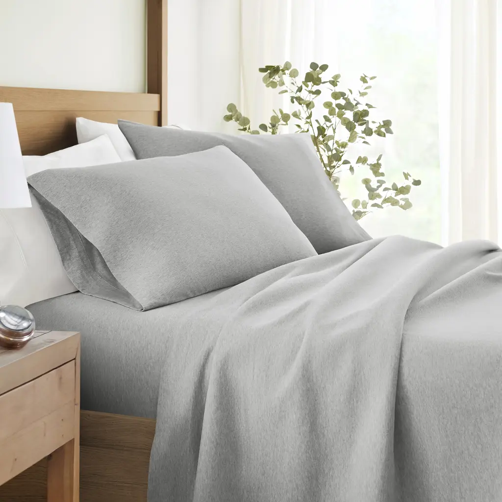 Enhance your sleeping experience with our ultra-soft and comfortable Jersey Knit Sheet Set, available in a range of soothing colors. Made from 100% Cotton, these sheets are exceptionally soft and breathable, providing the perfect blend of warmth and comfort, ideal for year-round use. The jersey fabric offers a cozy, four-way stretch, like your favorite super soft t-shirt! With its durable and stretchy nature, this sheet set ensures a snug fit on your mattress and delivers a restful night's sleep in luxurious comfort.