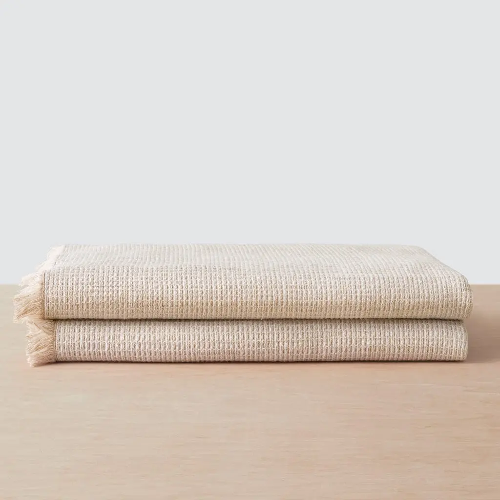 Part cotton, part relaxed linen. These lightweight, breathable towels are the best of both worlds. Perfectly plush. Effortlessly elegant. A breathable blend of cotton and relaxed linen, these luxe bath towels add a decadent touch to your bath rituals. With a lightweight waffle weave exterior and plush terry cloth interior, these soft towels combine the best of both worlds. And because we’re all about the details, we added a subtle eyelash fringe detailing to make these feel extra special. Loomed from long-staple cotton and relaxed linen in the Aegean region of Turkey, each piece is Oeko-Tex® certified, ensuring our towels are safe and non-toxic. From sourcing to finishing and every step in between, each piece is made sustainably in a fair trade working environment. Note: Each set includes two towels – two face towels/washcloths, two hand towels, two bath towels, or two bath sheets.