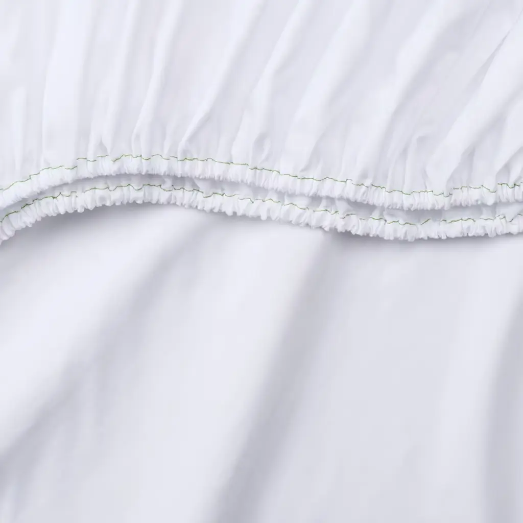Lulworth hotel quality white fitted sheets have a 200 thread count and are constructed from a 55/45 blend of cotton and polyester. Cotton/poly blends easy-care fabrics that make laundering simple. No pressing is needed. Lulworth fitted sheets are available in twin, full, queen, and king sizes, and come in bulk packs of 6. Buying linens in bulk is an excellent choice for large families, vacation homes, boutique and full-service hotels, Airbnbs, and rental properties of all kinds. Color-coded stitched hems differentiate full size (red), queen size (blue) and king size (green), and make it easy to sort through your bedding.