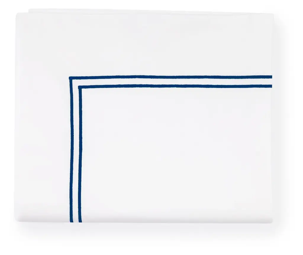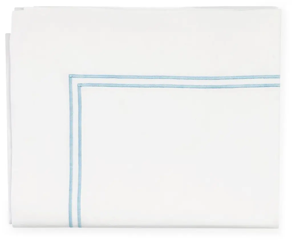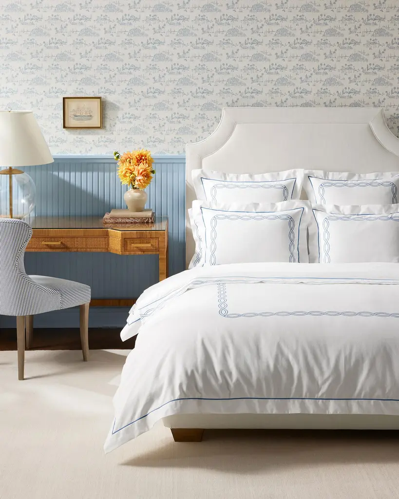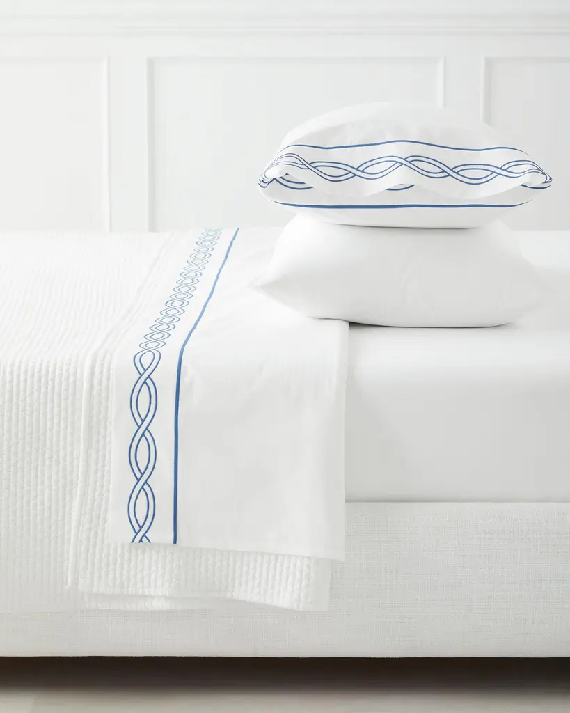 Chained melody. Elegant satin stitching revives a classic — in cool percale with a piqué cuff.