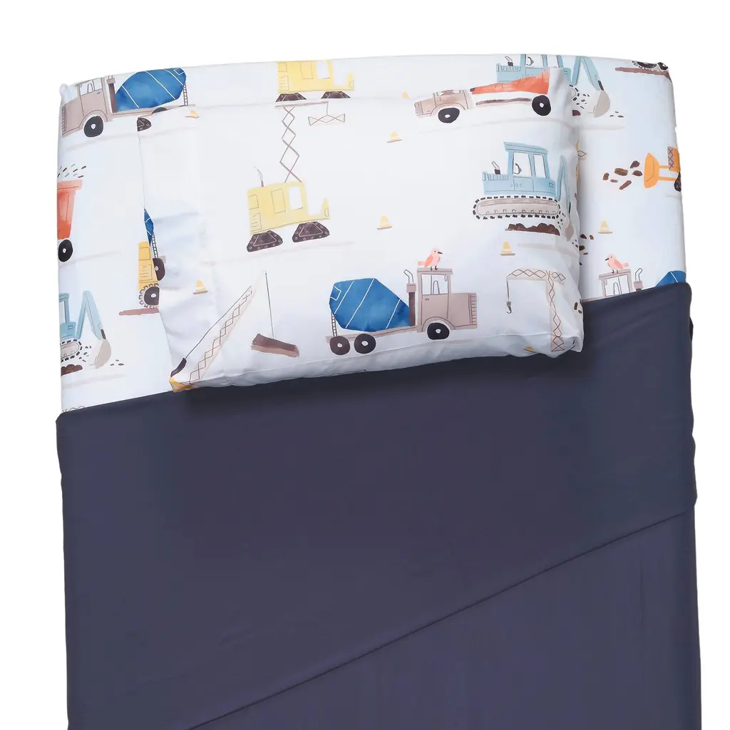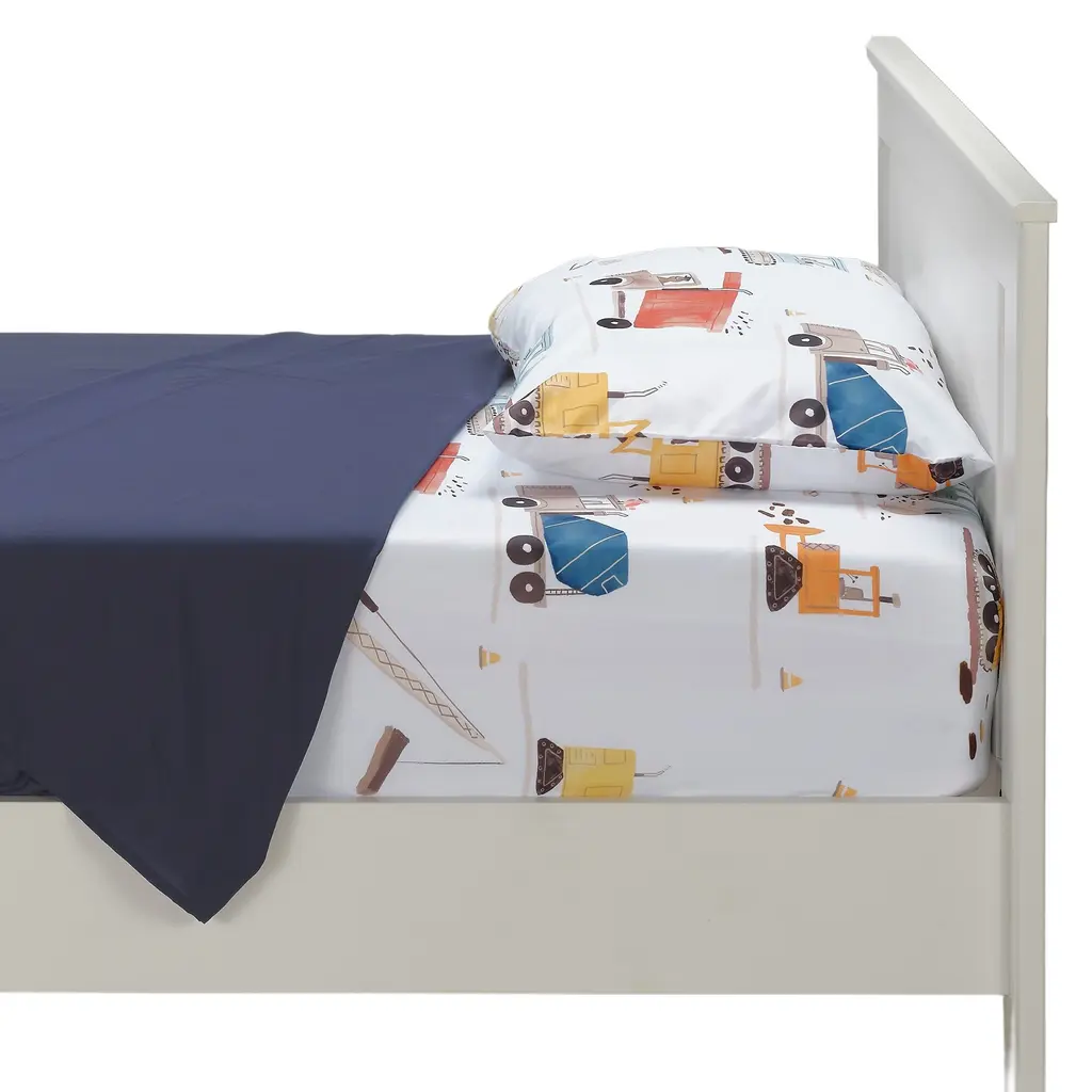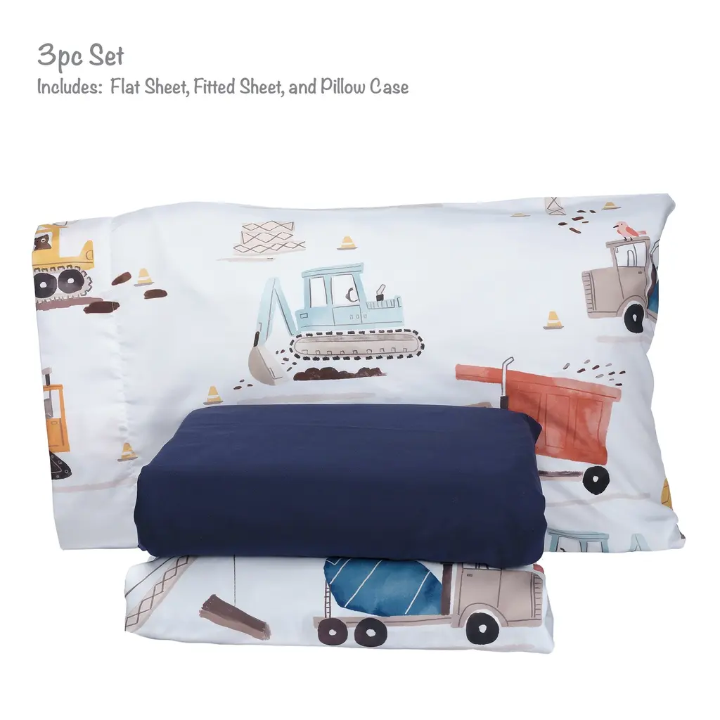 Your child will love sleeping on these soft microfiber sheets and pillowcase. The three-piece set includes one twin size flat sheet, one twin size fitted sheet, and one standard size pillowcase. The fitted sheet and pillowcase feature a variety of construction vehicles in vibrant watercolors. The fitted sheet has elastic all the way around for a secure fit. The top sheet is 66" × 96" in navy blue with a self-border at the top. Main Color(s): Blue, Gray. Theme(s): Transportation. Animal(s): Bear.