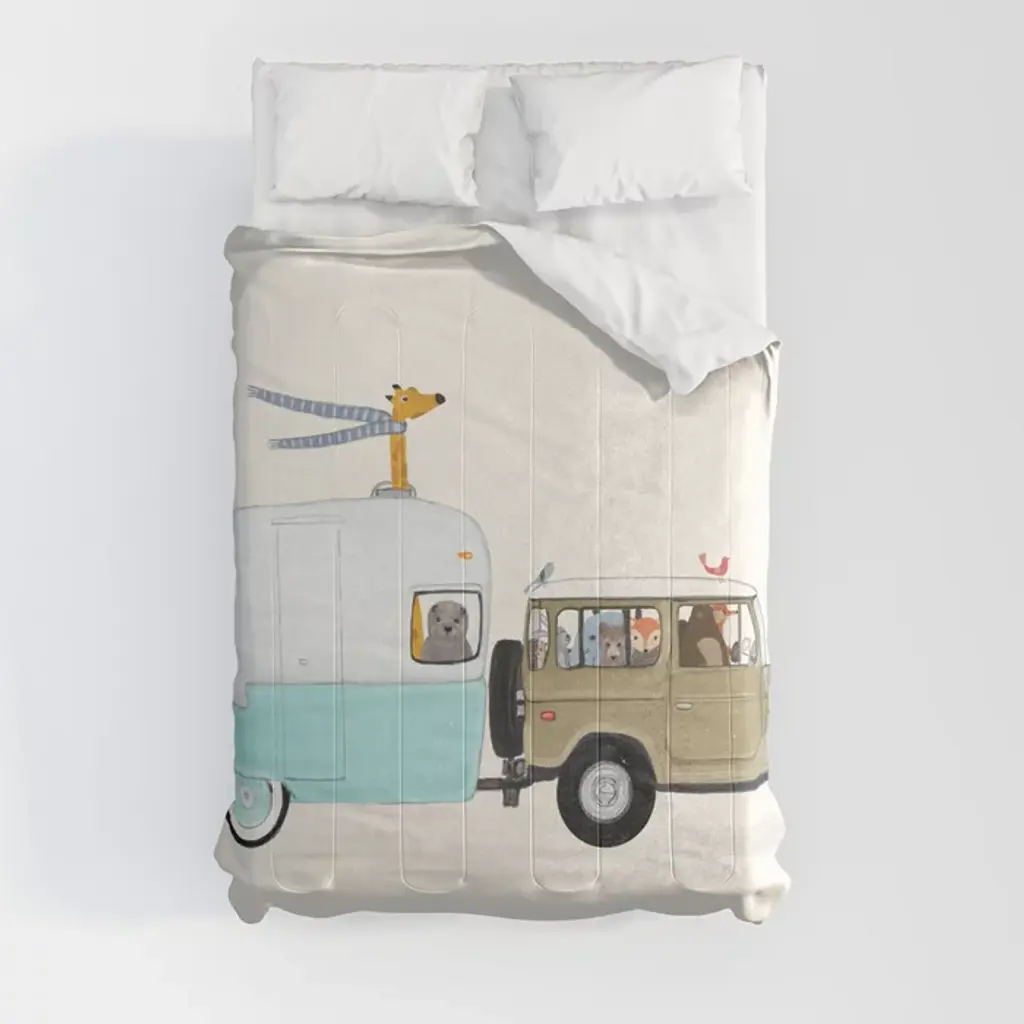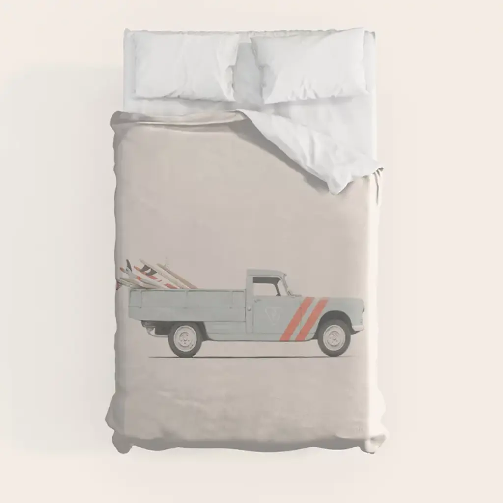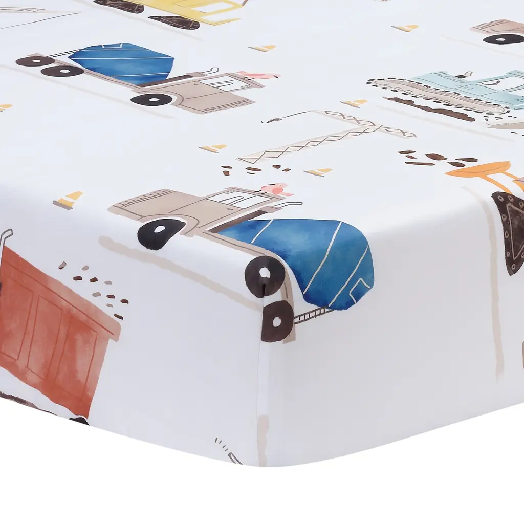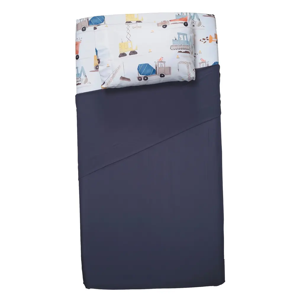 Your child will love sleeping on these soft microfiber sheets and pillowcase. The three-piece set includes one twin size flat sheet, one twin size fitted sheet, and one standard size pillowcase. The fitted sheet and pillowcase feature a variety of construction vehicles in vibrant watercolors. The fitted sheet has elastic all the way around for a secure fit. The top sheet is 66" × 96" in navy blue with a self-border at the top. Main Color(s): Blue, Gray. Theme(s): Transportation. Animal(s): Bear.