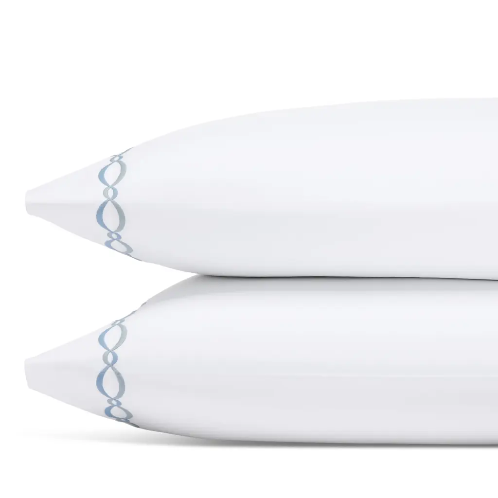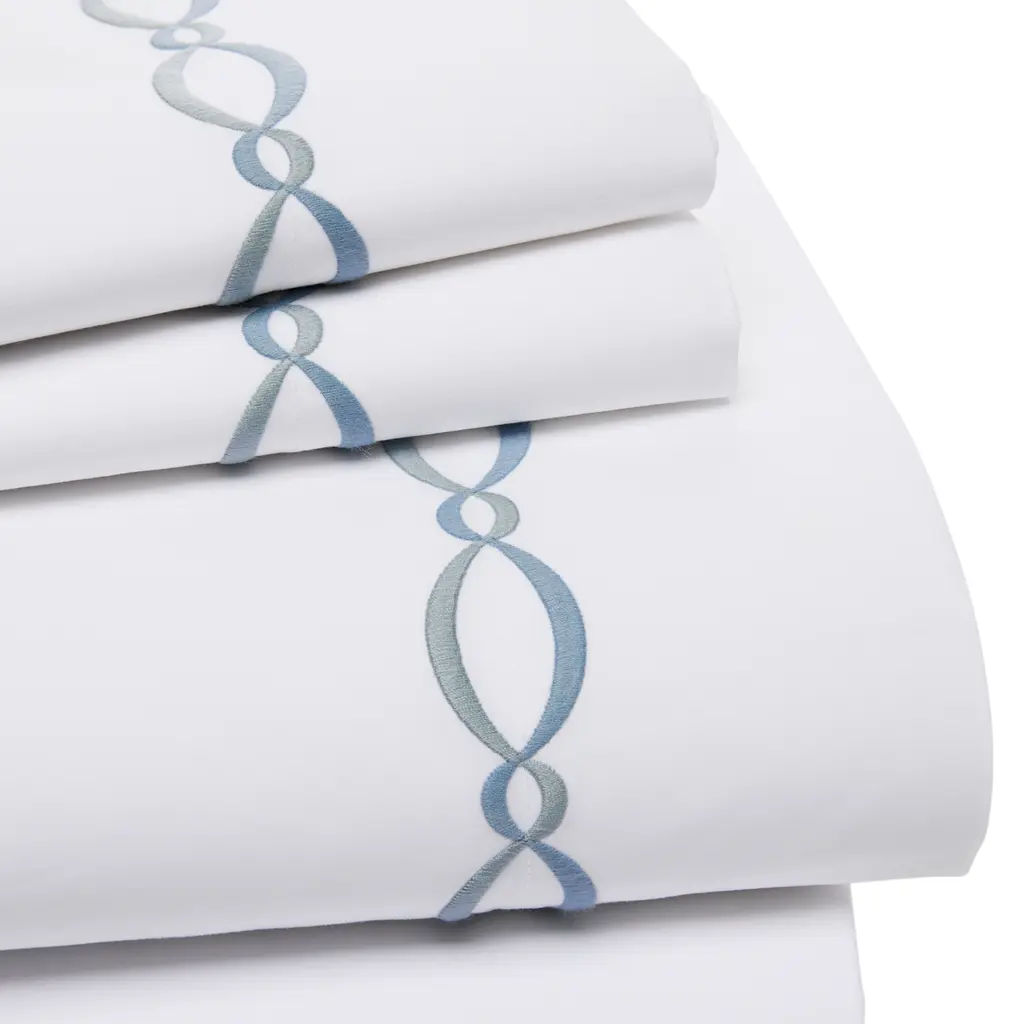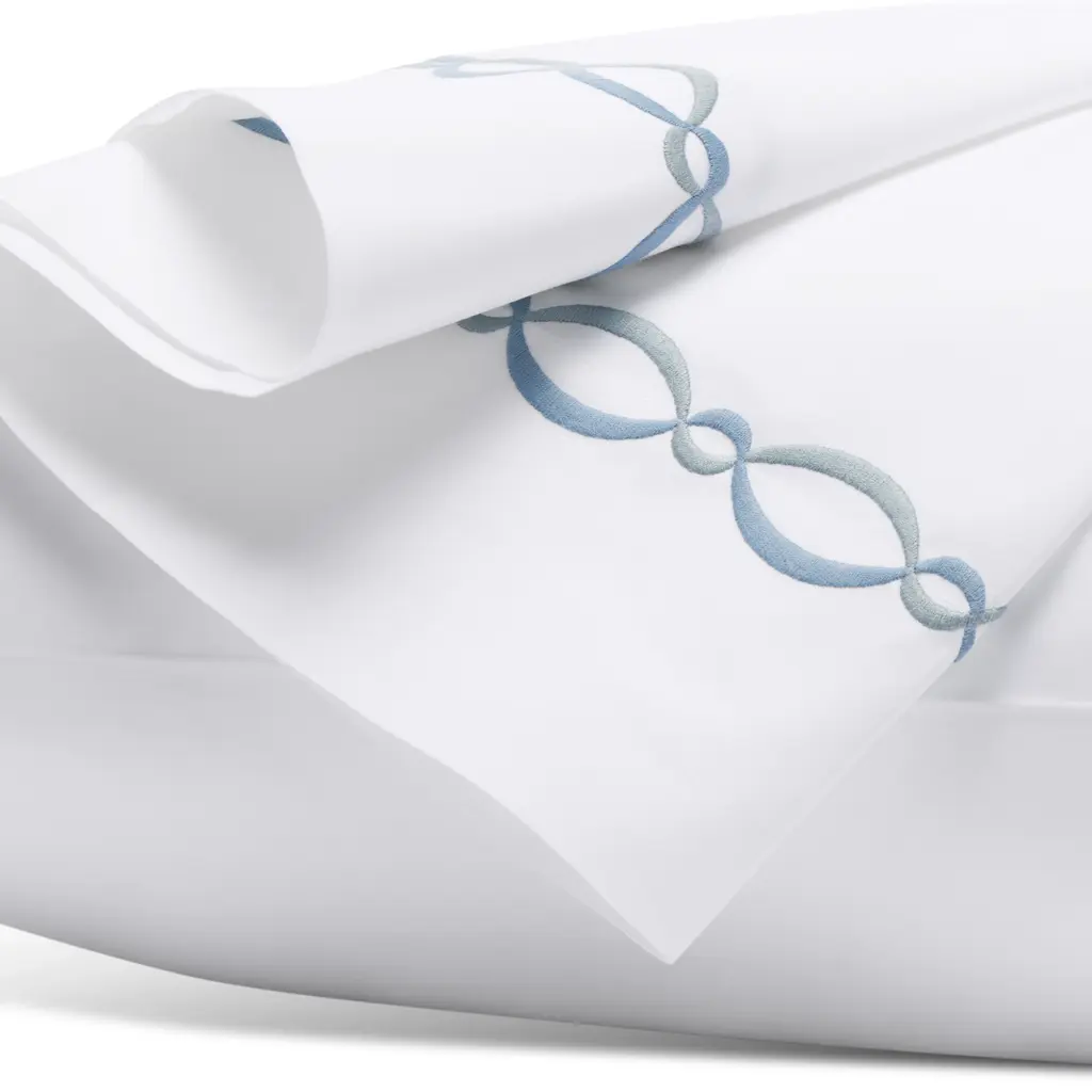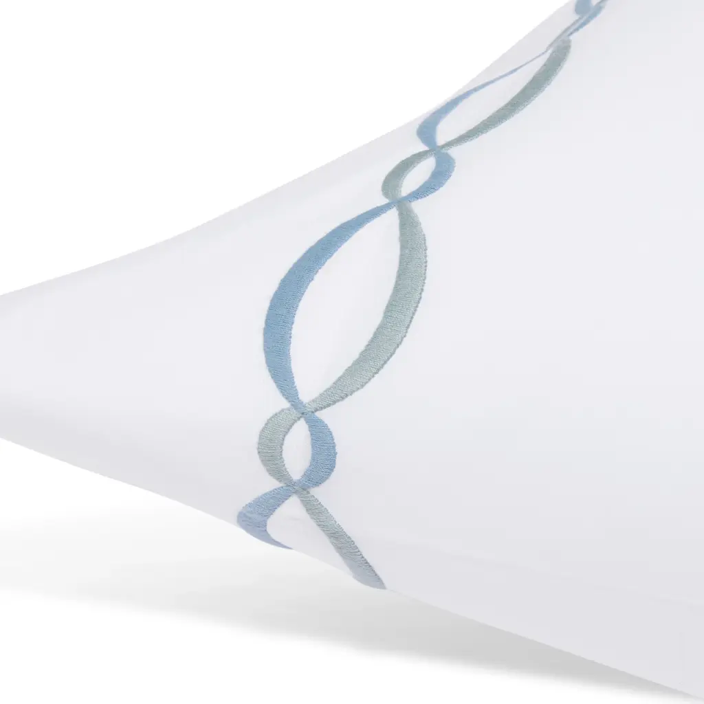 Brando is a Bloomingdale's exclusive featuring a graceful chain design, carefully embroidered in striking complementary shades of Hazy Blue and Pool. The timeless motif is set on Sierra cotton percale, offering a refined backdrop to a classic look.