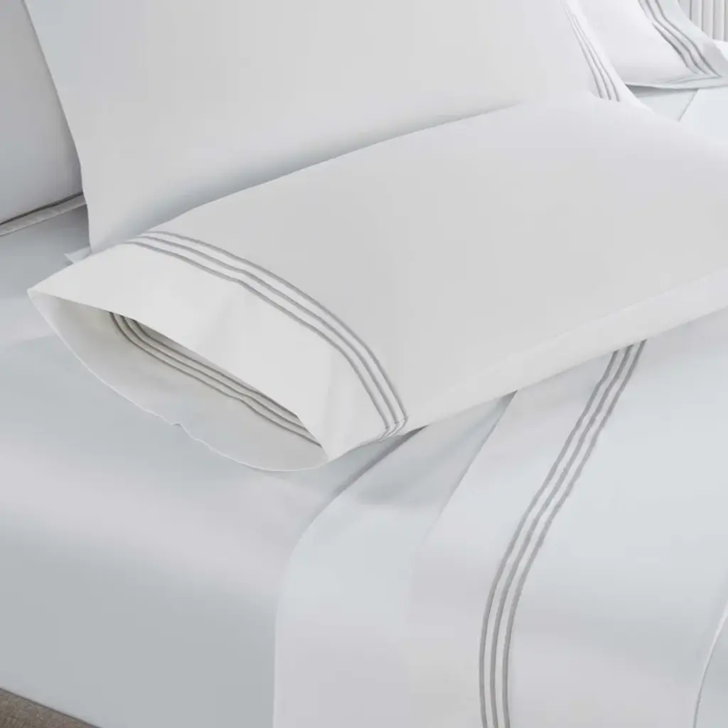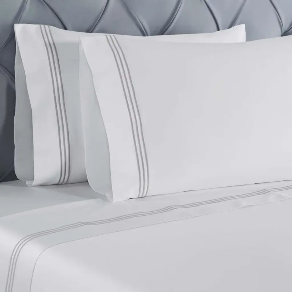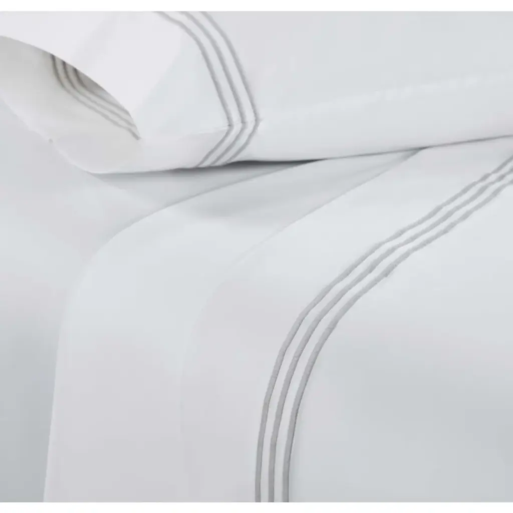 Tie your modern bedroom look together with our Cotton Three-Line Embroidered Sheet Set. Crafted from naturally soft cotton, this cozy sheet set is breathable, durable and long-lasting. This sheet set is available in a wide range of sizes to perfectly fit your bed, so your bedding looks pristine and luxurious. The all around elastic band on the deep pocket fitted sheet is designed to fit oversized mattresses or regular mattresses with a plush mattress topper up to 18 inches thick. Featuring an elegant three-line embroidery and finished with a subtle shimmer, this sheet set is a comfortable and luxurious addition to your bedding essentials.