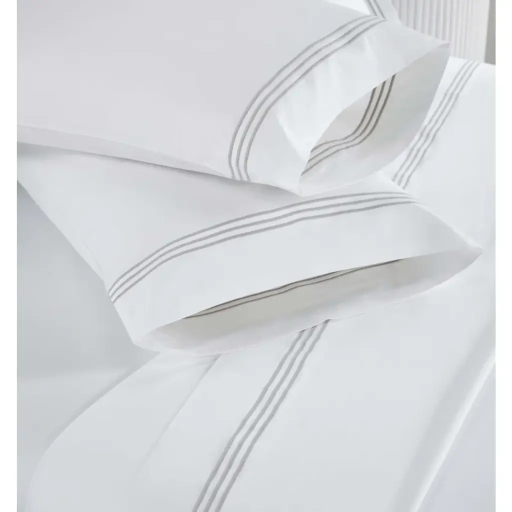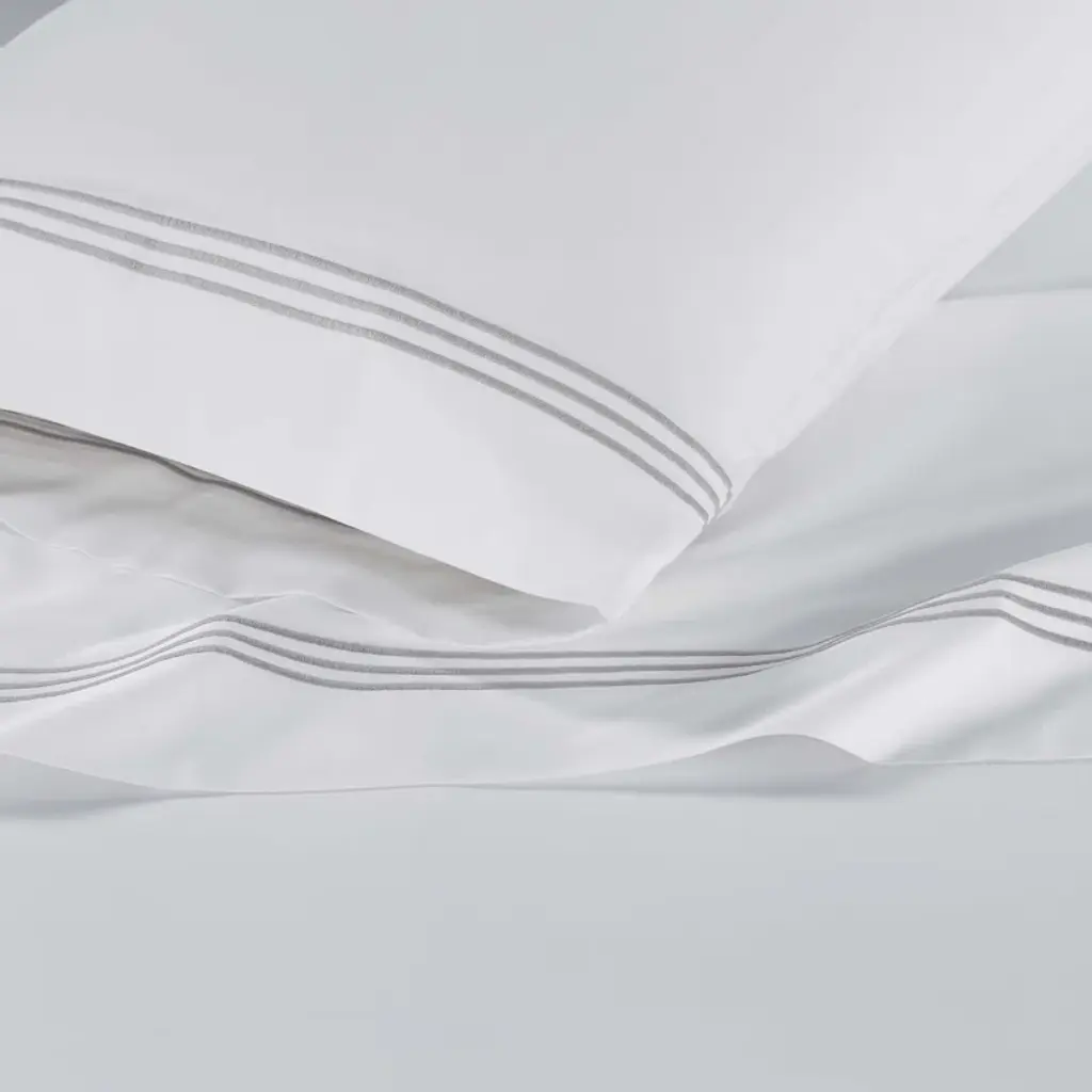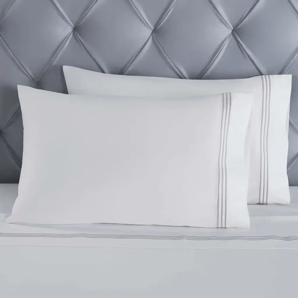 Tie your modern bedroom look together with our Cotton Three-Line Embroidered Sheet Set. Crafted from naturally soft cotton, this cozy sheet set is breathable, durable and long-lasting. This sheet set is available in a wide range of sizes to perfectly fit your bed, so your bedding looks pristine and luxurious. The all around elastic band on the deep pocket fitted sheet is designed to fit oversized mattresses or regular mattresses with a plush mattress topper up to 18 inches thick. Featuring an elegant three-line embroidery and finished with a subtle shimmer, this sheet set is a comfortable and luxurious addition to your bedding essentials.