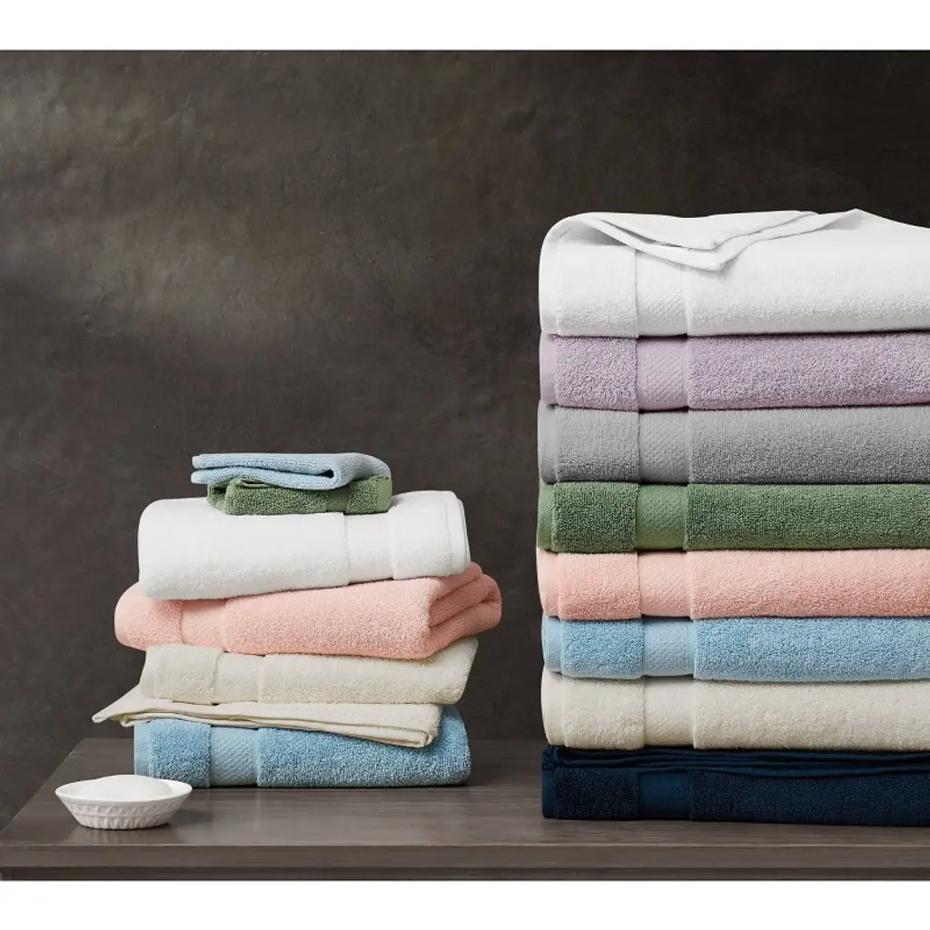 Designed with zero twist yarns, these towels offer exceptional softness and absorbency, while the smart blend of cotton and polyester ensures long-lasting durability. Includes: two bath sheets 35 by 70 inches, two hand towels 16 by 28 inches, and two wash cloths 13 by 13 inches. 12 Singles yarn using a zero twist provides good absorption and quick drying with a 90% Cotton/10% Polyester fiber blend in a 450 GSM pile fabric.