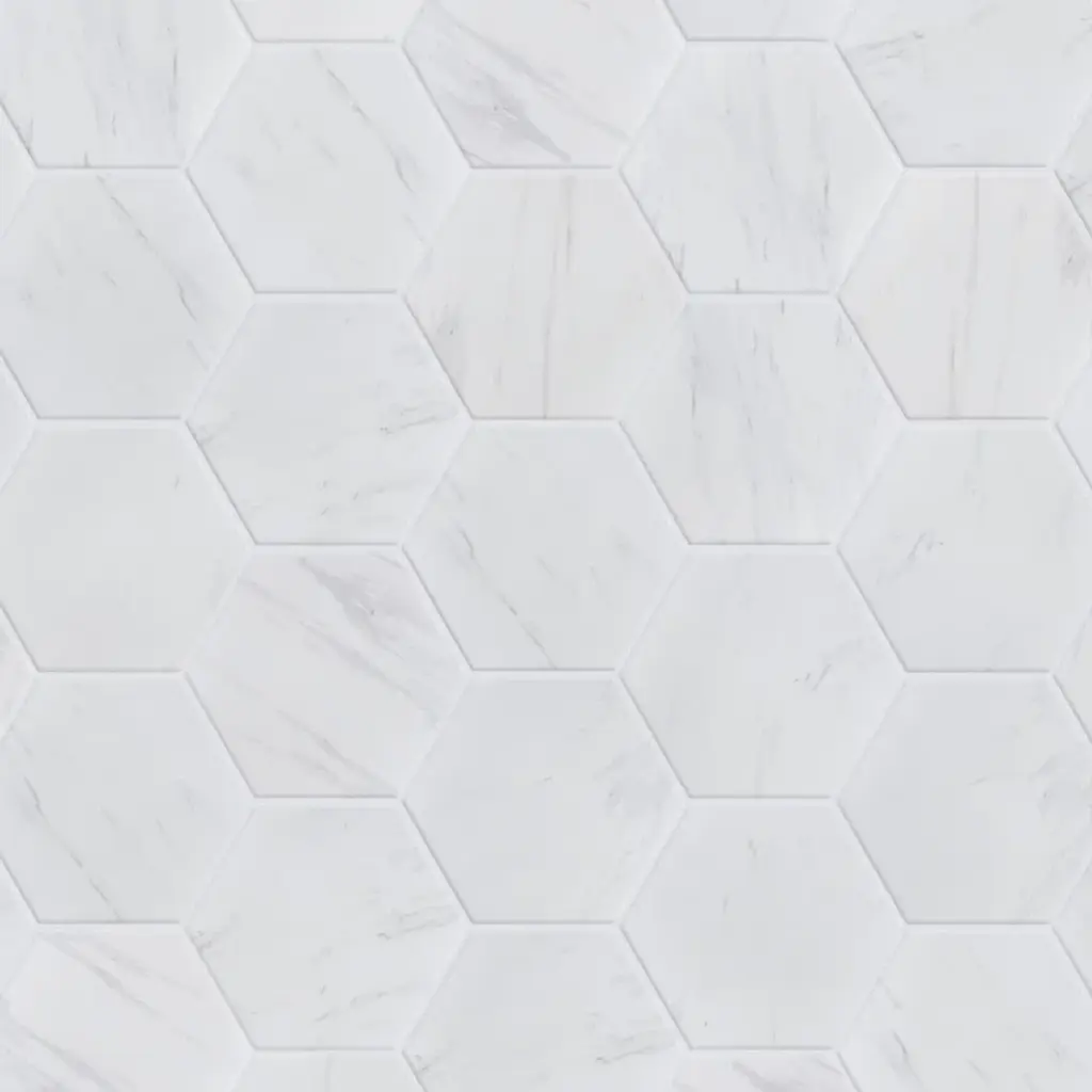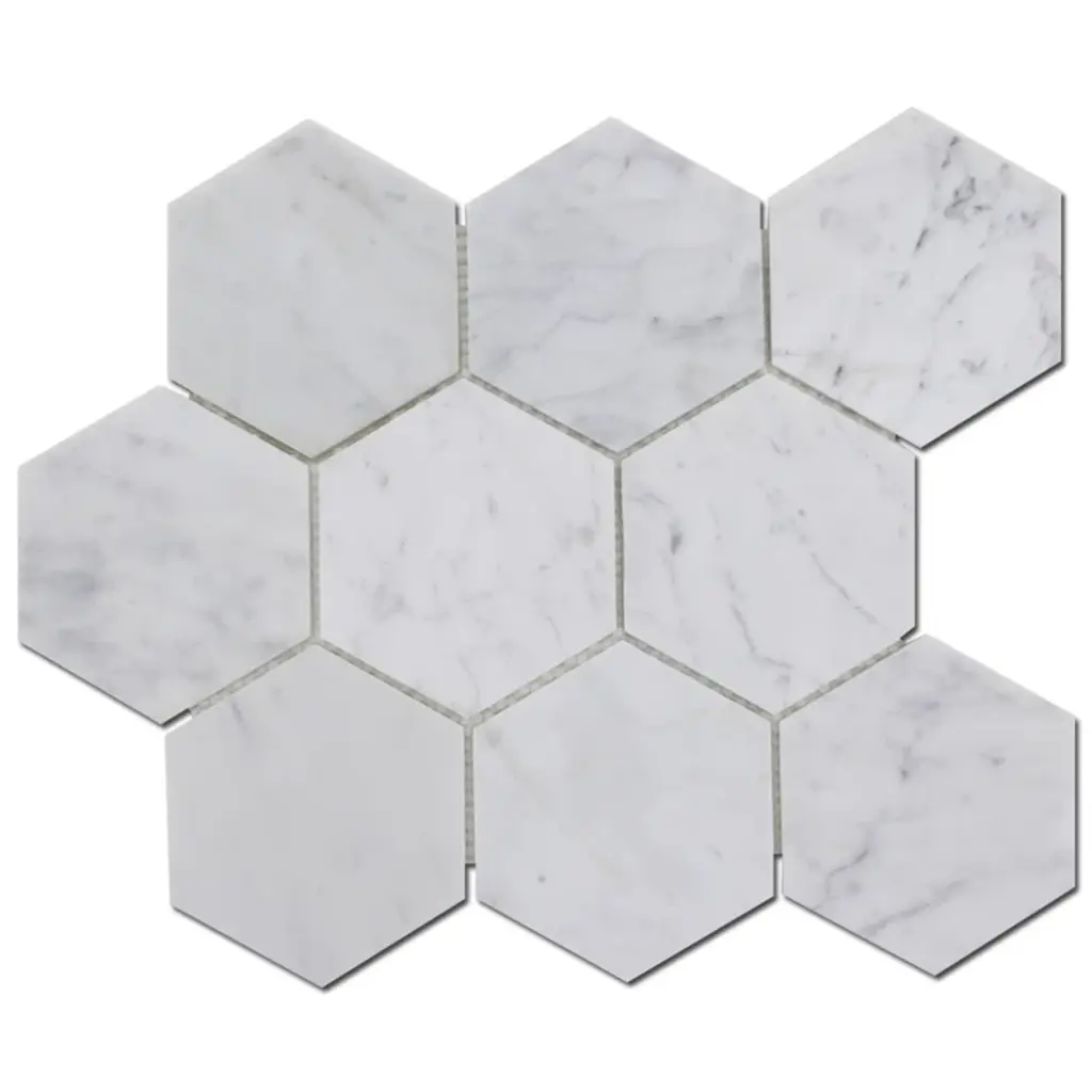 Color: Calacatta Gold Style: 3" Hexagon Material: Natural Marble Overall Product Weight: 4.75 lb. Dimensions Mosaic Sheet: 13.75'' W X 11.5'' L Individual Tile: 3" W x 3" L Overall Thickness: 0.38 Surface Area per Carton: 5 SqFt Mesh-Mounted Tiles Installation Area: Kitchen Backsplash, Fireplace Front, Bathroom Wall, Shower Wall, Bathroom Floor, Shower Floor