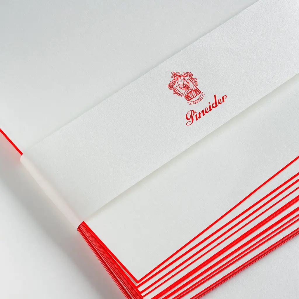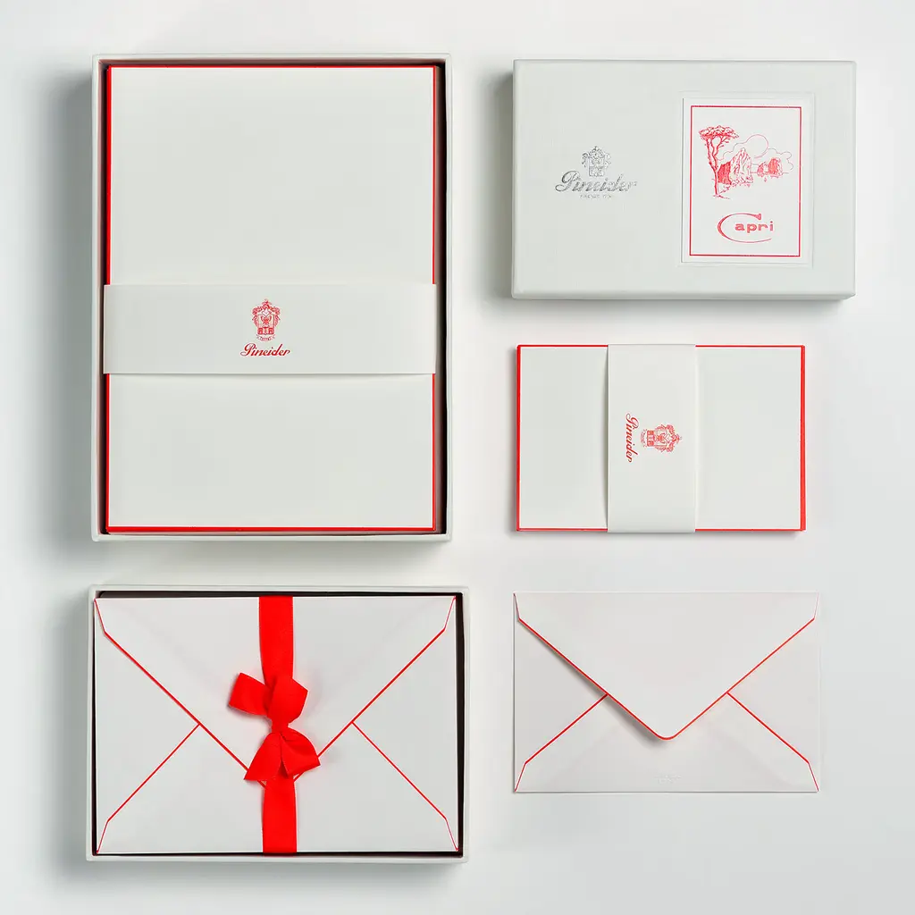 This one-off stationery set, inspired by the mesmerizing landscapes of the island of Capri, includes a box depicting the iconic "Faraglioni" (the iconic rock on the sea by the island) with bright red details and 24 sheets in smooth watermarked Pineider paper that features a sharp cut and a hand-edging matching the red hue of the box. The set comes with 24 red tissue-lined envelopes held together by hand-tied silk bows, whose color matches the edging. This set is available in other color combinations, please inquire with Concierge for options.