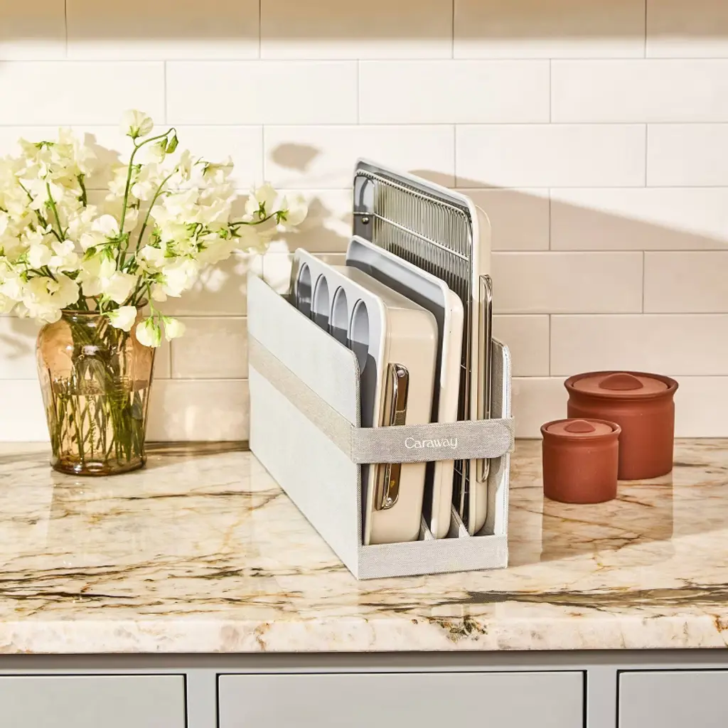 Ditch the chemicals with Caraway’s non-toxic Bakeware. The set includes 11 non-stick baking essentials (and available as an edited down 5-piece Half Set), everything you’ll need for healthy baking in your kitchen, staying organized, and looking good while doing so. Our non-stick coating makes cleaning a breeze.Caraway’s Half Bakeware Set simply includes a 18x13” Large and 10x15” Medium Baking Sheet, 12 Cup Muffin Pan, 9x13” Rectangle Pan, and one pan rack for storage. Caraway is on a mission to craft well-designed, non-toxic ceramic cookware that thoughtfully raises the standards of what you cook with. Simply put, our products are designed to make your life easier and healthier, no matter your level of expertise.